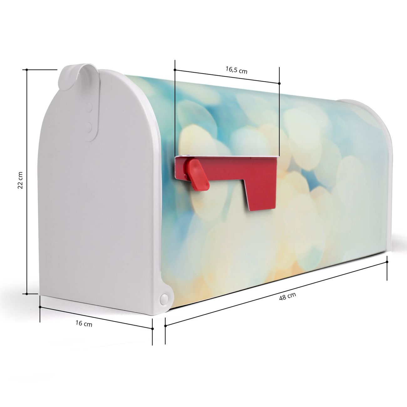 Der amerikanische Briefkasten von banjado mit Funkelnde Lichter Motiv bietet Ihnen ausreichend Fassungsvermögen, um große A4 Sendungen und Zeitschriften zu empfangen. Die typisch amerikanische rote Fahne zeigt Ihnen an, wenn Sie Post erhalten haben. Die US-Mailbox besteht aus verzinktem Stahlblech welches lackiert wurde und ist 48 x 22 x 16 CM (BxHxT) groß. Die Folie mit Motiv Funkelnde Lichter besteht aus einer wetter- und UV-resistenten Folie, die mit einem Schutzlaminat überzogen ist, sodass die US Mailbox zusätzlich vor Kratzern geschützt ist. An der Unterkante sind 4 Löcher je Seite um die Mailbox, typisch amerikanisch, an einem Holzpfahl oder einem Zaun zu befestigen. Auf Wunsch können Sie bei uns den passenden Standfuß oder die passende Wandhalterung kaufen um die US-Mailbox sicher zu befestigen. Wir bieten Ihnen ebenfalls Namensschilder, bereits beschriftet oder frei zu beschriften, und verschiedene selbst gestaltete Bitte-Keine-Werbung-Aufkleber.