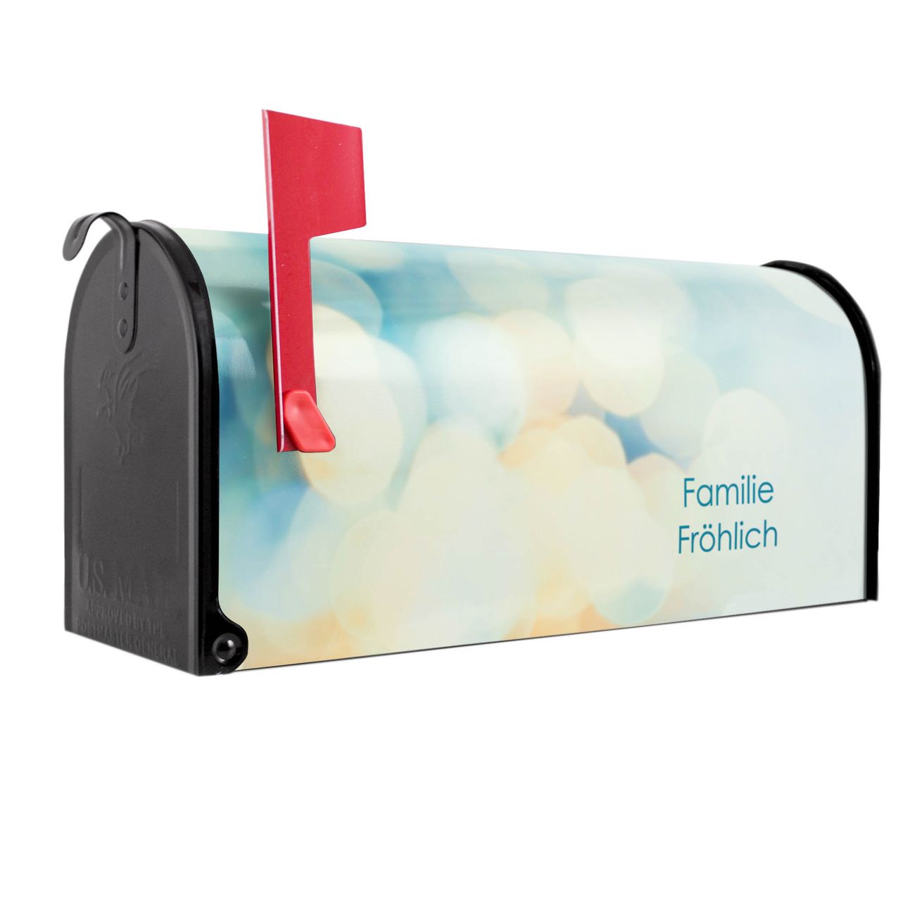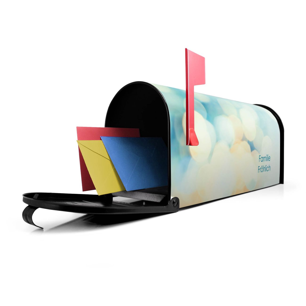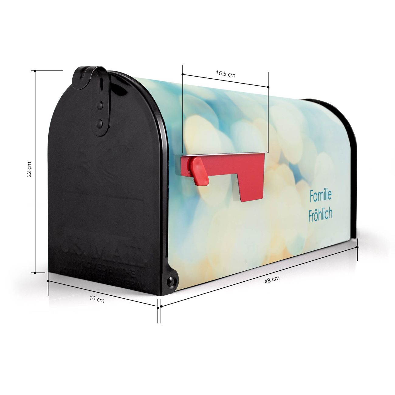 Der amerikanische Briefkasten von banjado mit Funkelnde Lichter Motiv bietet Ihnen ausreichend Fassungsvermögen, um große A4 Sendungen und Zeitschriften zu empfangen. Die typisch amerikanische rote Fahne zeigt Ihnen an, wenn Sie Post erhalten haben. Die US-Mailbox besteht aus verzinktem Stahlblech welches lackiert wurde und ist 48 x 22 x 16 CM (BxHxT) groß. Die Folie mit Motiv Funkelnde Lichter besteht aus einer wetter- und UV-resistenten Folie, die mit einem Schutzlaminat überzogen ist, sodass die US Mailbox zusätzlich vor Kratzern geschützt ist. An der Unterkante sind 4 Löcher je Seite um die Mailbox, typisch amerikanisch, an einem Holzpfahl oder einem Zaun zu befestigen. Auf Wunsch können Sie bei uns den passenden Standfuß oder die passende Wandhalterung kaufen um die US-Mailbox sicher zu befestigen. Wir bieten Ihnen ebenfalls Namensschilder, bereits beschriftet oder frei zu beschriften, und verschiedene selbst gestaltete Bitte-Keine-Werbung-Aufkleber.