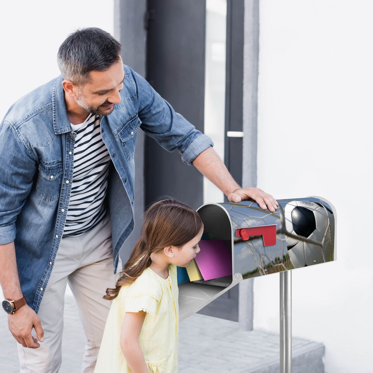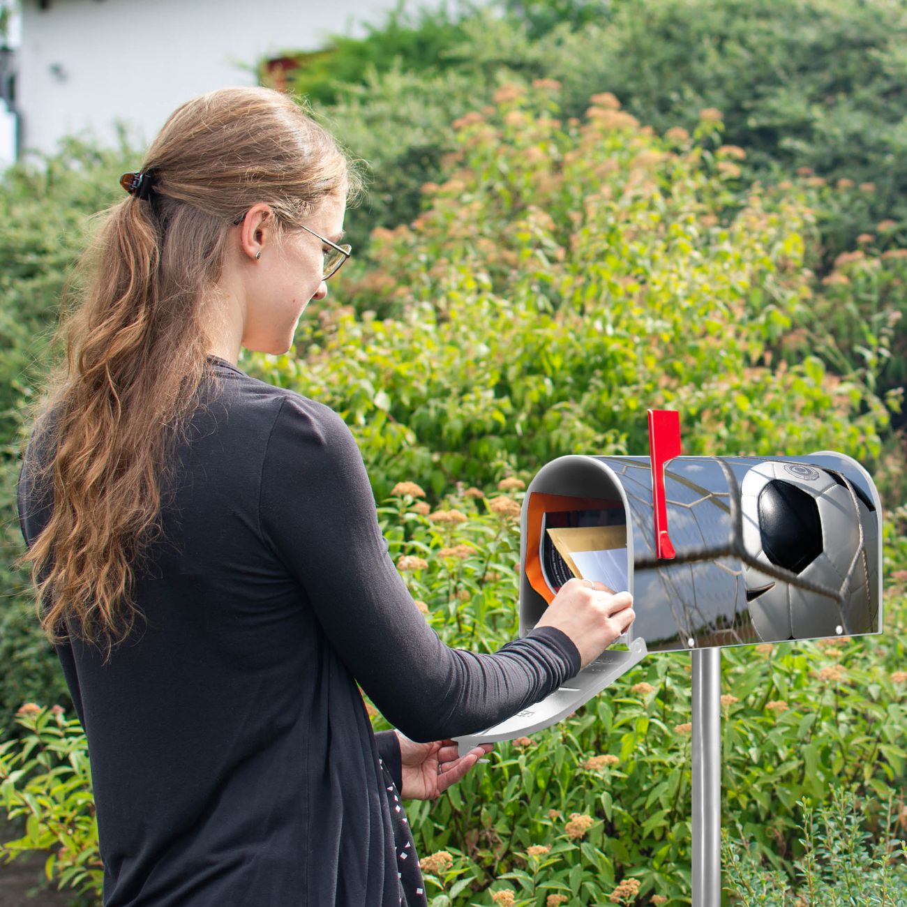 Unser amerikanischer Briefkasten mit dem Motiv Fußball hat ein sehr ansprechendes und ausgefallenes Design, ist in der Grundfarbe weiß, grün oder schwarz erhältlich. Damit entlocken Sie Ihren Nachbarn und dem Postboten immer wieder ein Lächeln. Die Mailbox ist ein Original Import aus Mississippi USA und wird von unserer kleinen Manufaktur in Sachsen von Hand veredelt. Die US-Mailbox bietet ausreichend Platz auch für große Sendungen, eine Fahne die Ihnen Post anzeigt, wetterfestes und äußerst stabiles Material - so macht Post empfangen Freude.