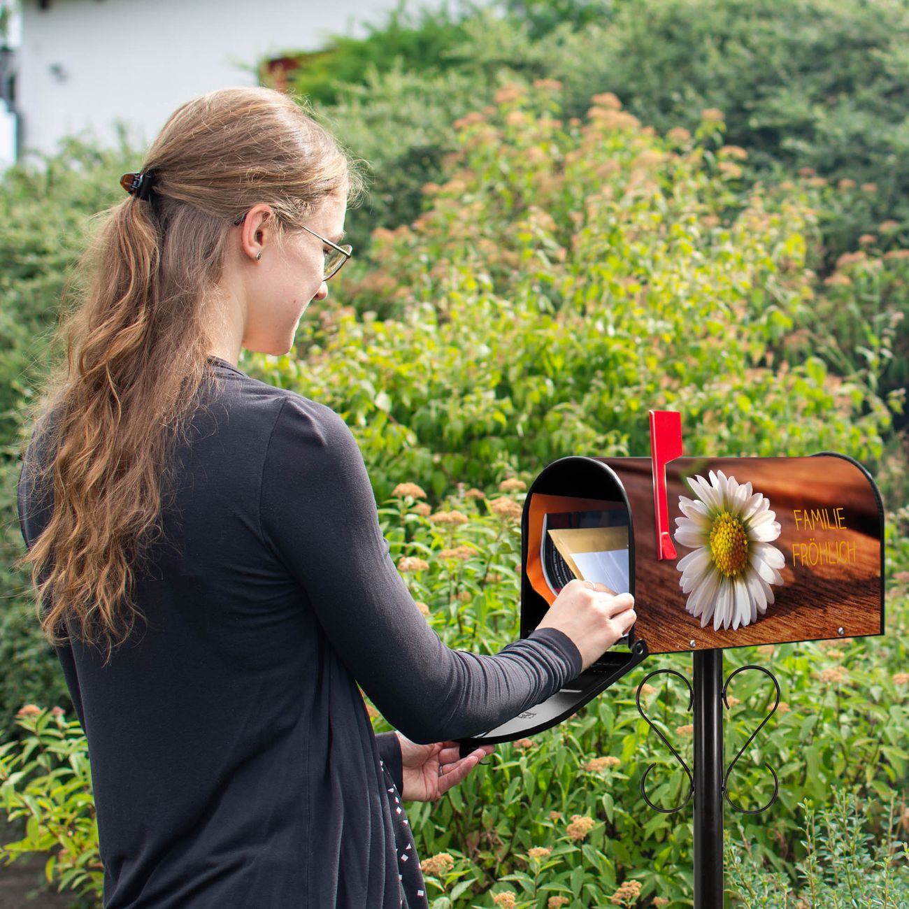 Unser amerikanischer Briefkasten mit dem Motiv Gänseblümchen hat ein sehr ansprechendes und ausgefallenes Design, ist in der Grundfarbe weiß, grün oder schwarz erhältlich. Damit entlocken Sie Ihren Nachbarn und dem Postboten immer wieder ein Lächeln. Die Mailbox ist ein Original Import aus Mississippi USA und wird von unserer kleinen Manufaktur in Sachsen von Hand veredelt. Die US-Mailbox bietet ausreichend Platz auch für große Sendungen, eine Fahne die Ihnen Post anzeigt, wetterfestes und äußerst stabiles Material - so macht Post empfangen Freude.