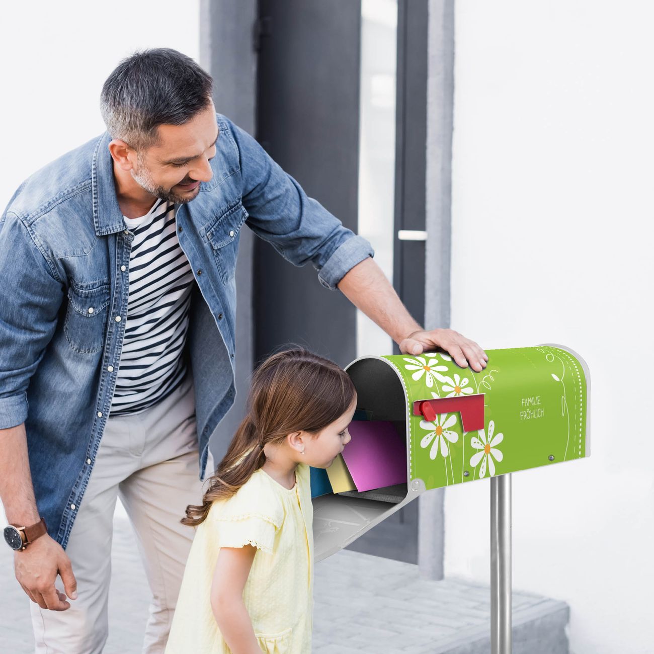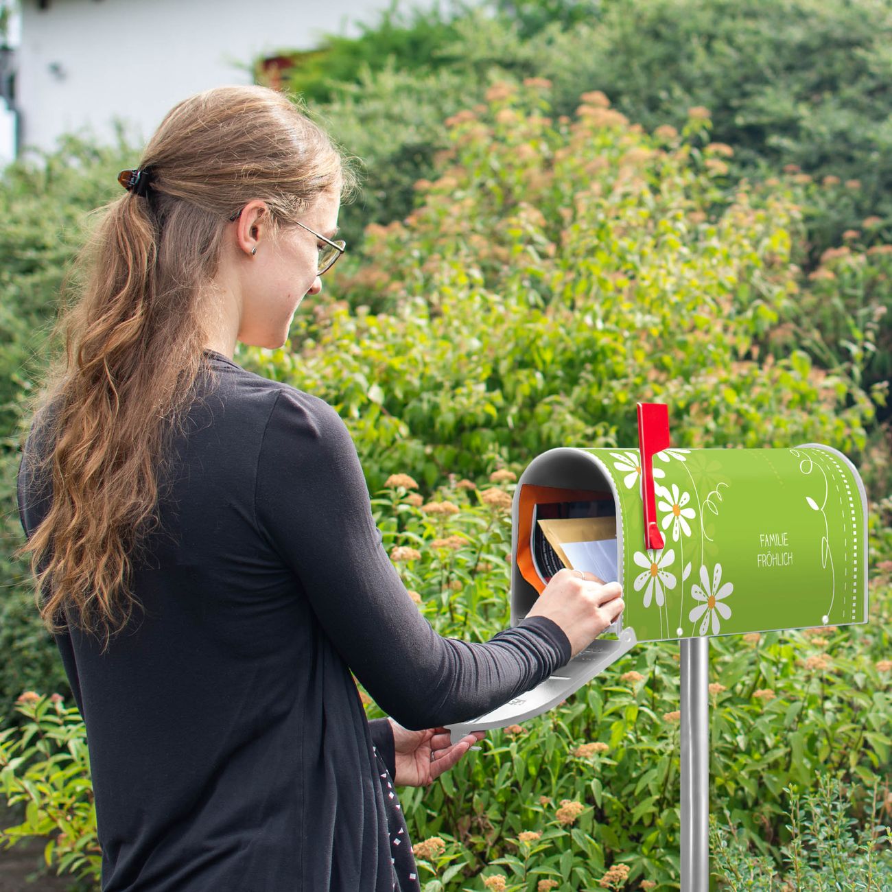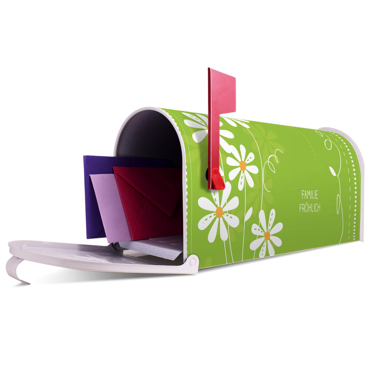 Unser amerikanischer Briefkasten mit dem Motiv WT Gänseblümchen hat ein sehr ansprechendes und ausgefallenes Design, ist in der Grundfarbe weiß, grün oder schwarz erhältlich. Damit entlocken Sie Ihren Nachbarn und dem Postboten immer wieder ein Lächeln. Die Mailbox ist ein Original Import aus Mississippi USA und wird von unserer kleinen Manufaktur in Sachsen von Hand veredelt. Die US-Mailbox bietet ausreichend Platz auch für große Sendungen, eine Fahne die Ihnen Post anzeigt, wetterfestes und äußerst stabiles Material - so macht Post empfangen Freude.