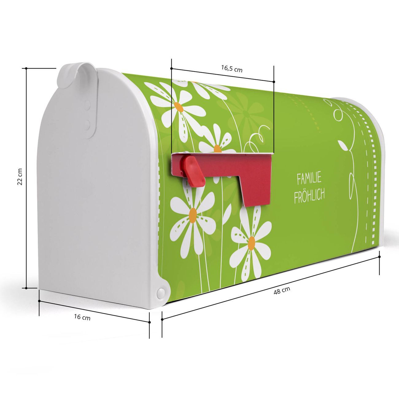Der amerikanische Briefkasten von banjado mit WT Gänseblümchen Motiv bietet Ihnen ausreichend Fassungsvermögen, um große A4 Sendungen und Zeitschriften zu empfangen. Die typisch amerikanische rote Fahne zeigt Ihnen an, wenn Sie Post erhalten haben. Die US-Mailbox besteht aus verzinktem Stahlblech welches lackiert wurde und ist 48 x 22 x 16 CM (BxHxT) groß. Die Folie mit Motiv WT Gänseblümchen besteht aus einer wetter- und UV-resistenten Folie, die mit einem Schutzlaminat überzogen ist, sodass die US Mailbox zusätzlich vor Kratzern geschützt ist. An der Unterkante sind 4 Löcher je Seite um die Mailbox, typisch amerikanisch, an einem Holzpfahl oder einem Zaun zu befestigen. Auf Wunsch können Sie bei uns den passenden Standfuß oder die passende Wandhalterung kaufen um die US-Mailbox sicher zu befestigen. Wir bieten Ihnen ebenfalls Namensschilder, bereits beschriftet oder frei zu beschriften, und verschiedene selbst gestaltete Bitte-Keine-Werbung-Aufkleber.