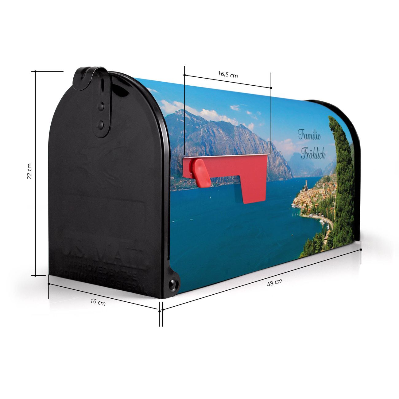 Der amerikanische Briefkasten von banjado mit Gardasee Motiv bietet Ihnen ausreichend Fassungsvermögen, um große A4 Sendungen und Zeitschriften zu empfangen. Die typisch amerikanische rote Fahne zeigt Ihnen an, wenn Sie Post erhalten haben. Die US-Mailbox besteht aus verzinktem Stahlblech welches lackiert wurde und ist 48 x 22 x 16 CM (BxHxT) groß. Die Folie mit Motiv Gardasee besteht aus einer wetter- und UV-resistenten Folie, die mit einem Schutzlaminat überzogen ist, sodass die US Mailbox zusätzlich vor Kratzern geschützt ist. An der Unterkante sind 4 Löcher je Seite um die Mailbox, typisch amerikanisch, an einem Holzpfahl oder einem Zaun zu befestigen. Auf Wunsch können Sie bei uns den passenden Standfuß oder die passende Wandhalterung kaufen um die US-Mailbox sicher zu befestigen. Wir bieten Ihnen ebenfalls Namensschilder, bereits beschriftet oder frei zu beschriften, und verschiedene selbst gestaltete Bitte-Keine-Werbung-Aufkleber.