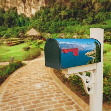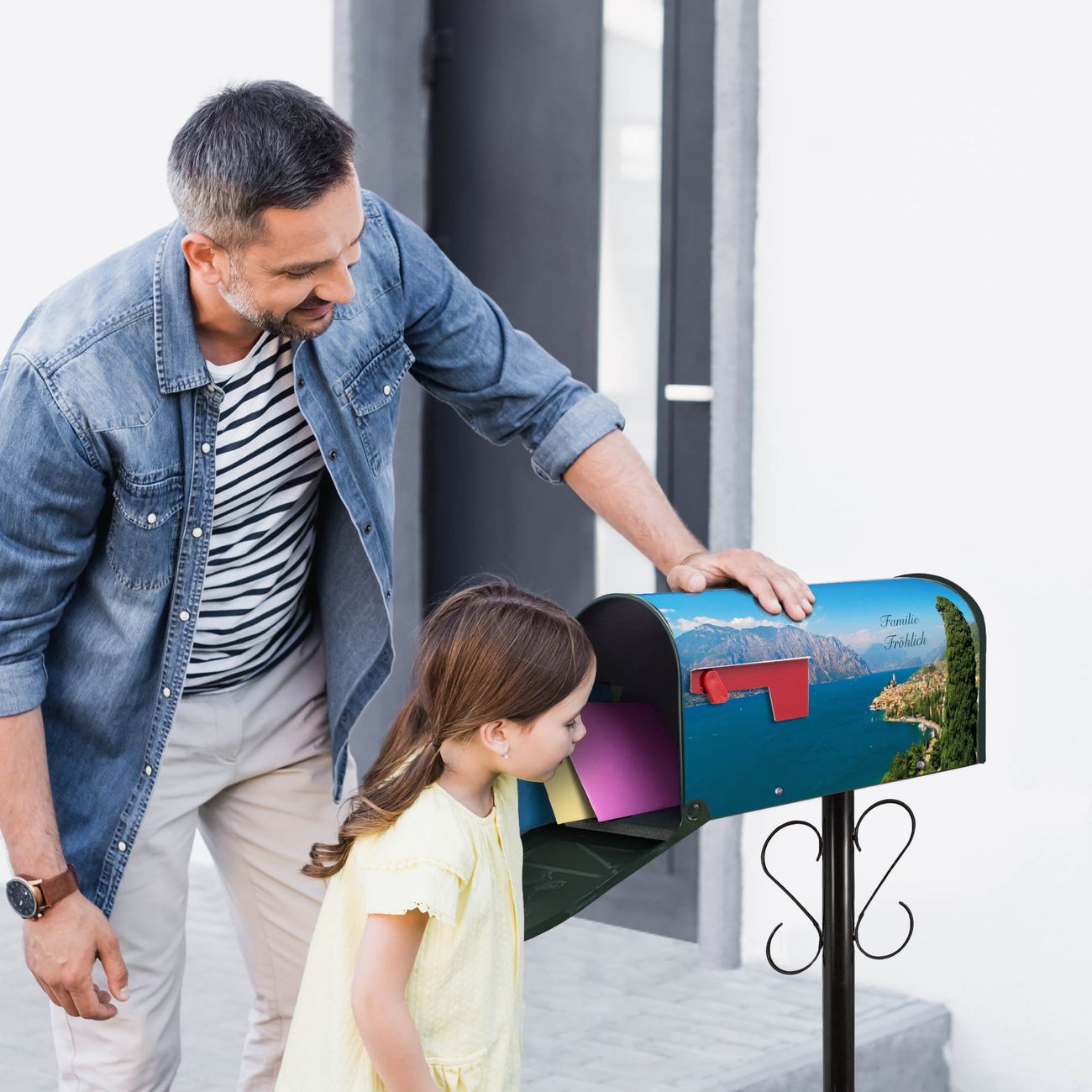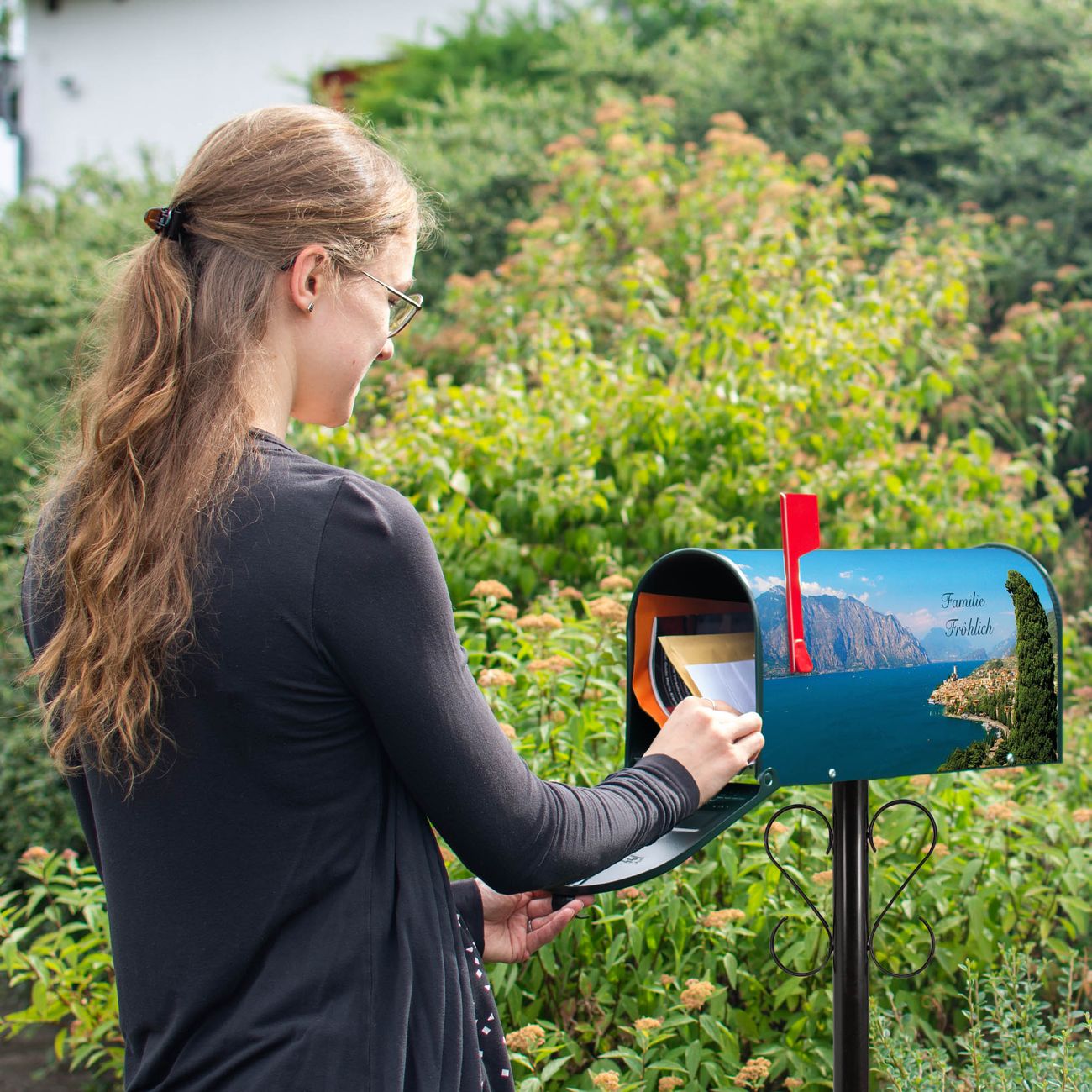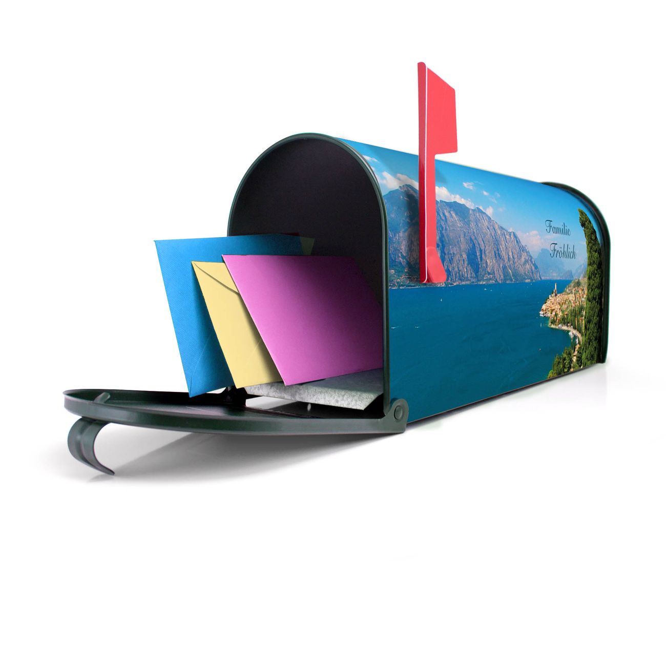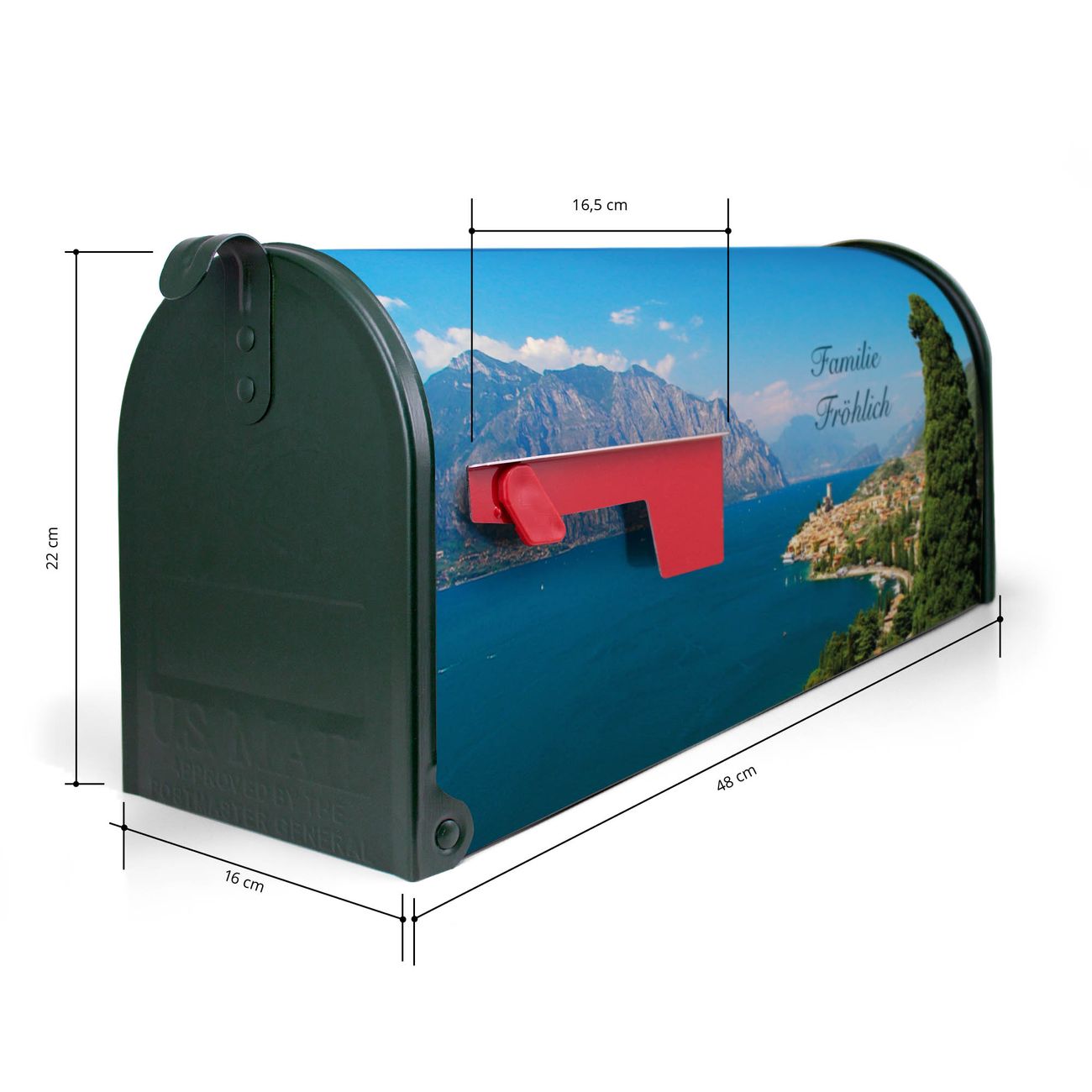 Der amerikanische Briefkasten von banjado mit Gardasee Motiv bietet Ihnen ausreichend Fassungsvermögen, um große A4 Sendungen und Zeitschriften zu empfangen. Die typisch amerikanische rote Fahne zeigt Ihnen an, wenn Sie Post erhalten haben. Die US-Mailbox besteht aus verzinktem Stahlblech welches lackiert wurde und ist 48 x 22 x 16 CM (BxHxT) groß. Die Folie mit Motiv Gardasee besteht aus einer wetter- und UV-resistenten Folie, die mit einem Schutzlaminat überzogen ist, sodass die US Mailbox zusätzlich vor Kratzern geschützt ist. An der Unterkante sind 4 Löcher je Seite um die Mailbox, typisch amerikanisch, an einem Holzpfahl oder einem Zaun zu befestigen. Auf Wunsch können Sie bei uns den passenden Standfuß oder die passende Wandhalterung kaufen um die US-Mailbox sicher zu befestigen. Wir bieten Ihnen ebenfalls Namensschilder, bereits beschriftet oder frei zu beschriften, und verschiedene selbst gestaltete Bitte-Keine-Werbung-Aufkleber.