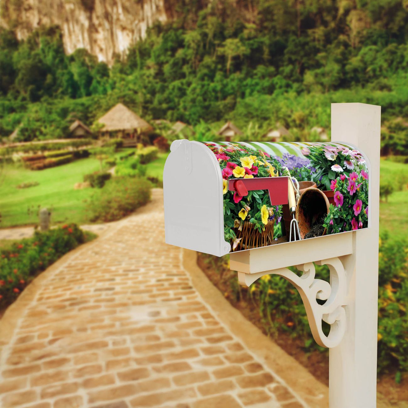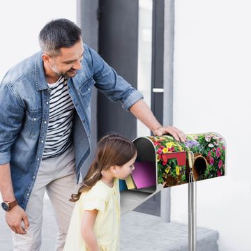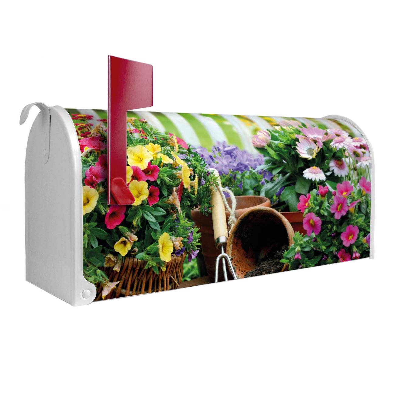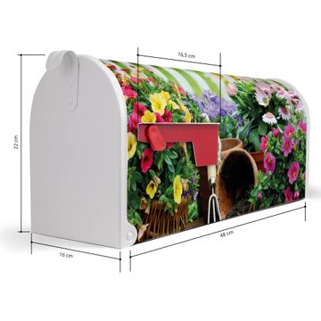 Der amerikanische Briefkasten von banjado mit Gartenfreude Motiv bietet Ihnen ausreichend Fassungsvermögen, um große A4 Sendungen und Zeitschriften zu empfangen. Die typisch amerikanische rote Fahne zeigt Ihnen an, wenn Sie Post erhalten haben. Die US-Mailbox besteht aus verzinktem Stahlblech welches lackiert wurde und ist 48 x 22 x 16 CM (BxHxT) groß. Die Folie mit Motiv Gartenfreude besteht aus einer wetter- und UV-resistenten Folie, die mit einem Schutzlaminat überzogen ist, sodass die US Mailbox zusätzlich vor Kratzern geschützt ist. An der Unterkante sind 4 Löcher je Seite um die Mailbox, typisch amerikanisch, an einem Holzpfahl oder einem Zaun zu befestigen. Auf Wunsch können Sie bei uns den passenden Standfuß oder die passende Wandhalterung kaufen um die US-Mailbox sicher zu befestigen. Wir bieten Ihnen ebenfalls Namensschilder, bereits beschriftet oder frei zu beschriften, und verschiedene selbst gestaltete Bitte-Keine-Werbung-Aufkleber.