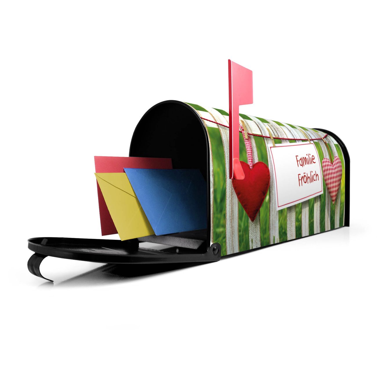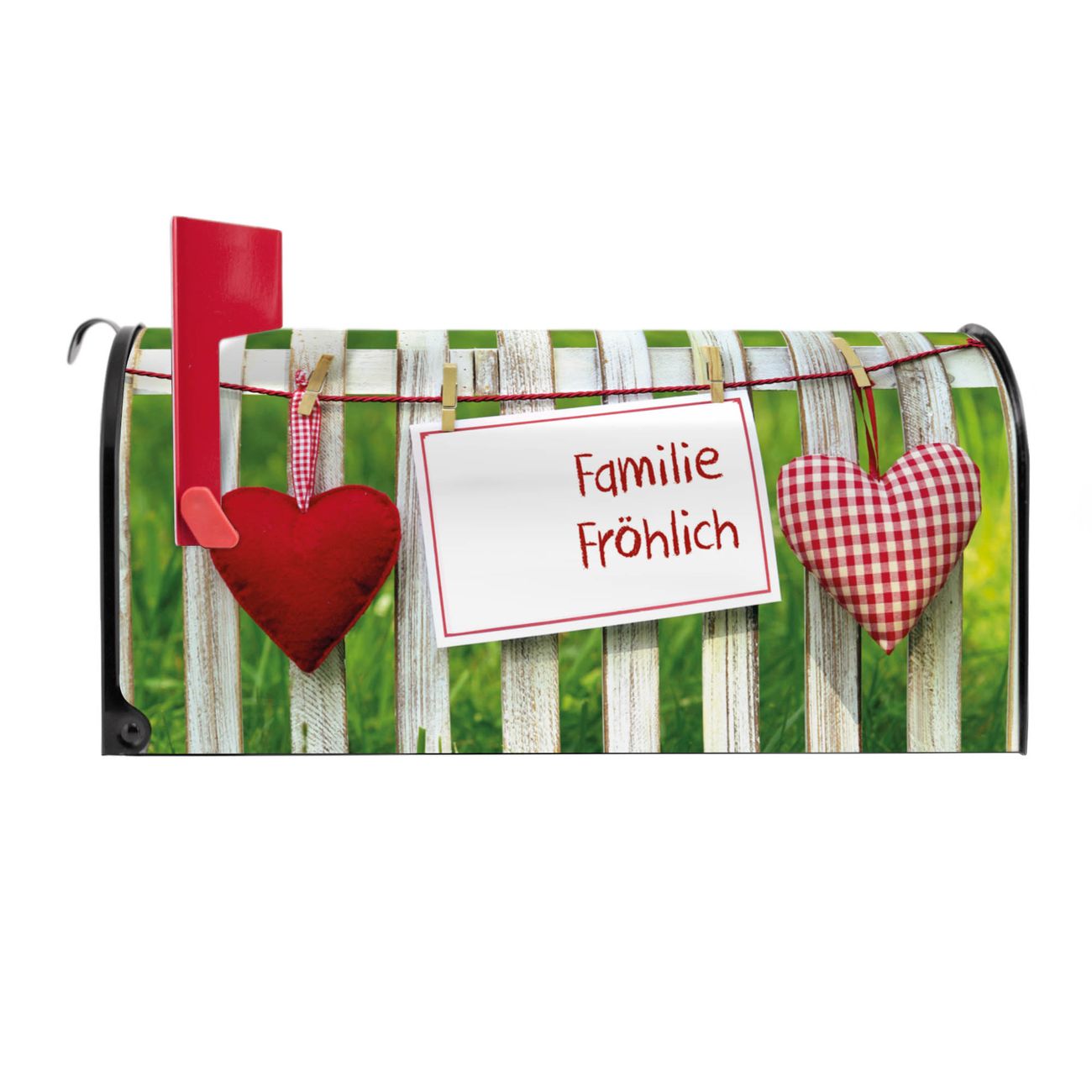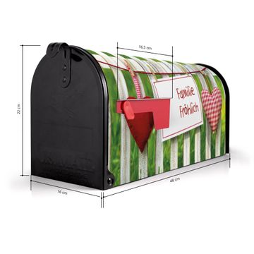 Der amerikanische Briefkasten von banjado mit Gartenzaun Motiv bietet Ihnen ausreichend Fassungsvermögen, um große A4 Sendungen und Zeitschriften zu empfangen. Die typisch amerikanische rote Fahne zeigt Ihnen an, wenn Sie Post erhalten haben. Die US-Mailbox besteht aus verzinktem Stahlblech welches lackiert wurde und ist 48 x 22 x 16 CM (BxHxT) groß. Die Folie mit Motiv Gartenzaun besteht aus einer wetter- und UV-resistenten Folie, die mit einem Schutzlaminat überzogen ist, sodass die US Mailbox zusätzlich vor Kratzern geschützt ist. An der Unterkante sind 4 Löcher je Seite um die Mailbox, typisch amerikanisch, an einem Holzpfahl oder einem Zaun zu befestigen. Auf Wunsch können Sie bei uns den passenden Standfuß oder die passende Wandhalterung kaufen um die US-Mailbox sicher zu befestigen. Wir bieten Ihnen ebenfalls Namensschilder, bereits beschriftet oder frei zu beschriften, und verschiedene selbst gestaltete Bitte-Keine-Werbung-Aufkleber.