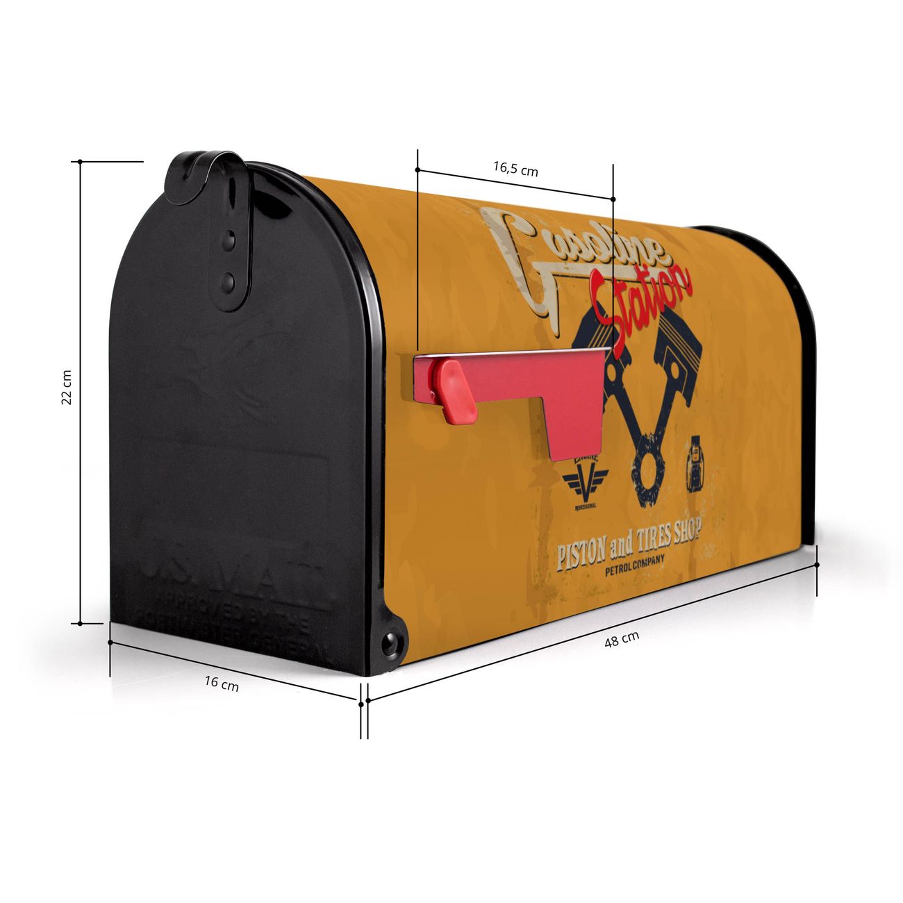 Der amerikanische Briefkasten von banjado mit Gasoline Station Motiv bietet Ihnen ausreichend Fassungsvermögen, um große A4 Sendungen und Zeitschriften zu empfangen. Die typisch amerikanische rote Fahne zeigt Ihnen an, wenn Sie Post erhalten haben. Die US-Mailbox besteht aus verzinktem Stahlblech welches lackiert wurde und ist 48 x 22 x 16 CM (BxHxT) groß. Die Folie mit Motiv Gasoline Station besteht aus einer wetter- und UV-resistenten Folie, die mit einem Schutzlaminat überzogen ist, sodass die US Mailbox zusätzlich vor Kratzern geschützt ist. An der Unterkante sind 4 Löcher je Seite um die Mailbox, typisch amerikanisch, an einem Holzpfahl oder einem Zaun zu befestigen. Auf Wunsch können Sie bei uns den passenden Standfuß oder die passende Wandhalterung kaufen um die US-Mailbox sicher zu befestigen. Wir bieten Ihnen ebenfalls Namensschilder, bereits beschriftet oder frei zu beschriften, und verschiedene selbst gestaltete Bitte-Keine-Werbung-Aufkleber.