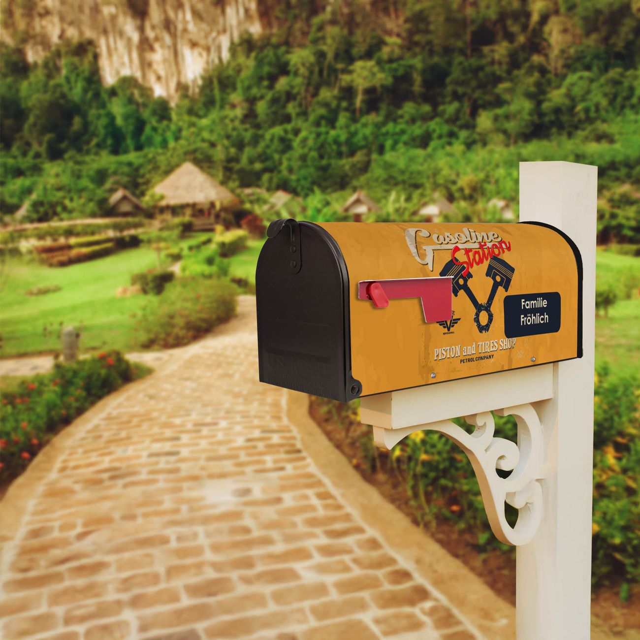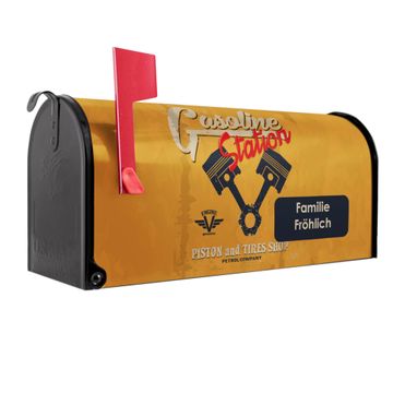 Der amerikanische Briefkasten von banjado mit Gasoline Station Motiv bietet Ihnen ausreichend Fassungsvermögen, um große A4 Sendungen und Zeitschriften zu empfangen. Die typisch amerikanische rote Fahne zeigt Ihnen an, wenn Sie Post erhalten haben. Die US-Mailbox besteht aus verzinktem Stahlblech welches lackiert wurde und ist 48 x 22 x 16 CM (BxHxT) groß. Die Folie mit Motiv Gasoline Station besteht aus einer wetter- und UV-resistenten Folie, die mit einem Schutzlaminat überzogen ist, sodass die US Mailbox zusätzlich vor Kratzern geschützt ist. An der Unterkante sind 4 Löcher je Seite um die Mailbox, typisch amerikanisch, an einem Holzpfahl oder einem Zaun zu befestigen. Auf Wunsch können Sie bei uns den passenden Standfuß oder die passende Wandhalterung kaufen um die US-Mailbox sicher zu befestigen. Wir bieten Ihnen ebenfalls Namensschilder, bereits beschriftet oder frei zu beschriften, und verschiedene selbst gestaltete Bitte-Keine-Werbung-Aufkleber.