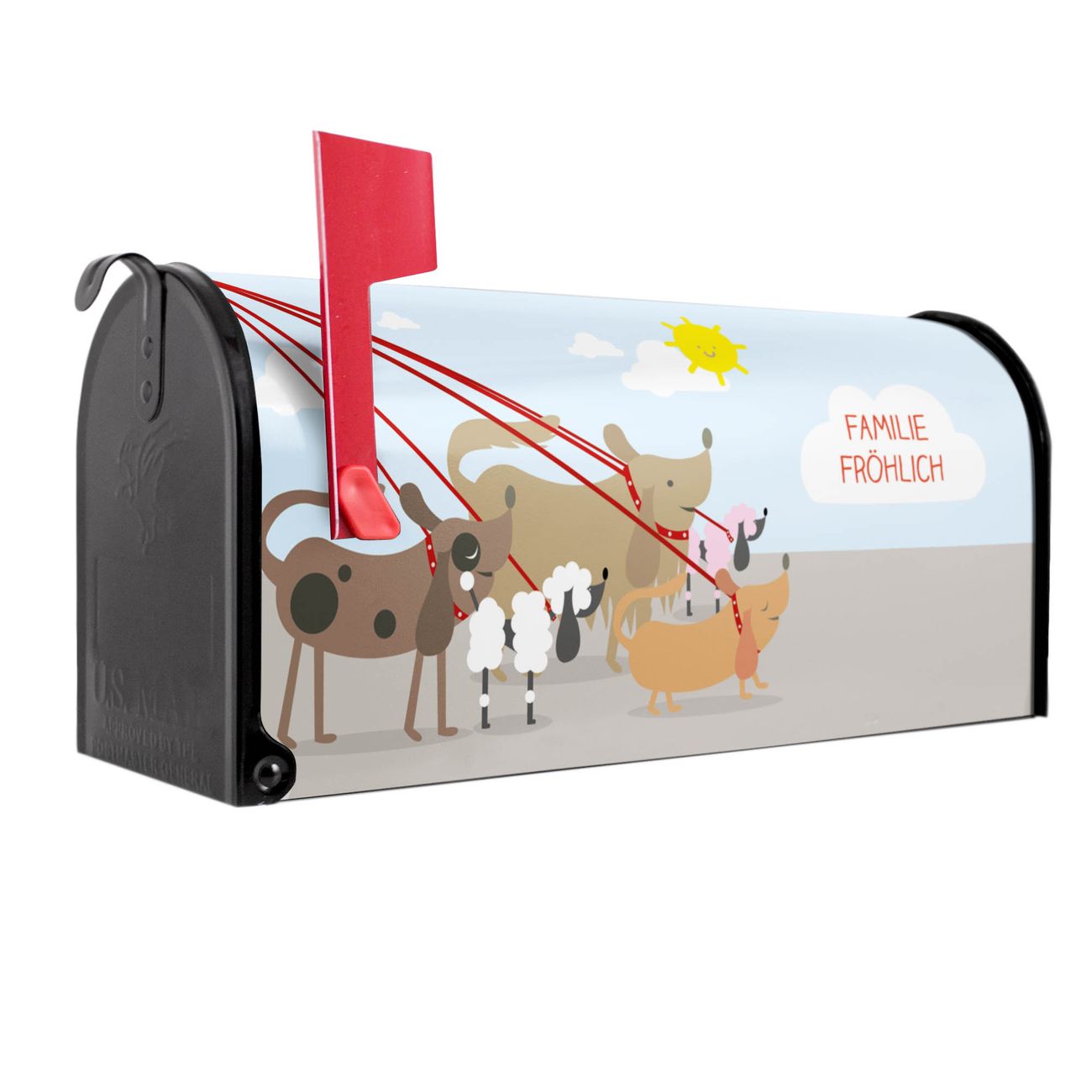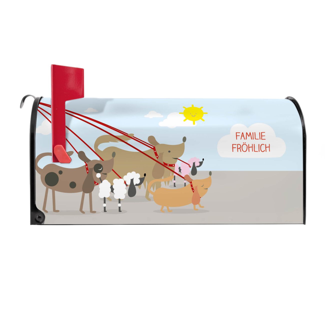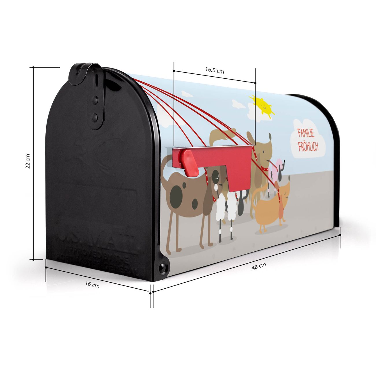 Der amerikanische Briefkasten von banjado mit Gassi Gehen Motiv bietet Ihnen ausreichend Fassungsvermögen, um große A4 Sendungen und Zeitschriften zu empfangen. Die typisch amerikanische rote Fahne zeigt Ihnen an, wenn Sie Post erhalten haben. Die US-Mailbox besteht aus verzinktem Stahlblech welches lackiert wurde und ist 48 x 22 x 16 CM (BxHxT) groß. Die Folie mit Motiv Gassi Gehen besteht aus einer wetter- und UV-resistenten Folie, die mit einem Schutzlaminat überzogen ist, sodass die US Mailbox zusätzlich vor Kratzern geschützt ist. An der Unterkante sind 4 Löcher je Seite um die Mailbox, typisch amerikanisch, an einem Holzpfahl oder einem Zaun zu befestigen. Auf Wunsch können Sie bei uns den passenden Standfuß oder die passende Wandhalterung kaufen um die US-Mailbox sicher zu befestigen. Wir bieten Ihnen ebenfalls Namensschilder, bereits beschriftet oder frei zu beschriften, und verschiedene selbst gestaltete Bitte-Keine-Werbung-Aufkleber.