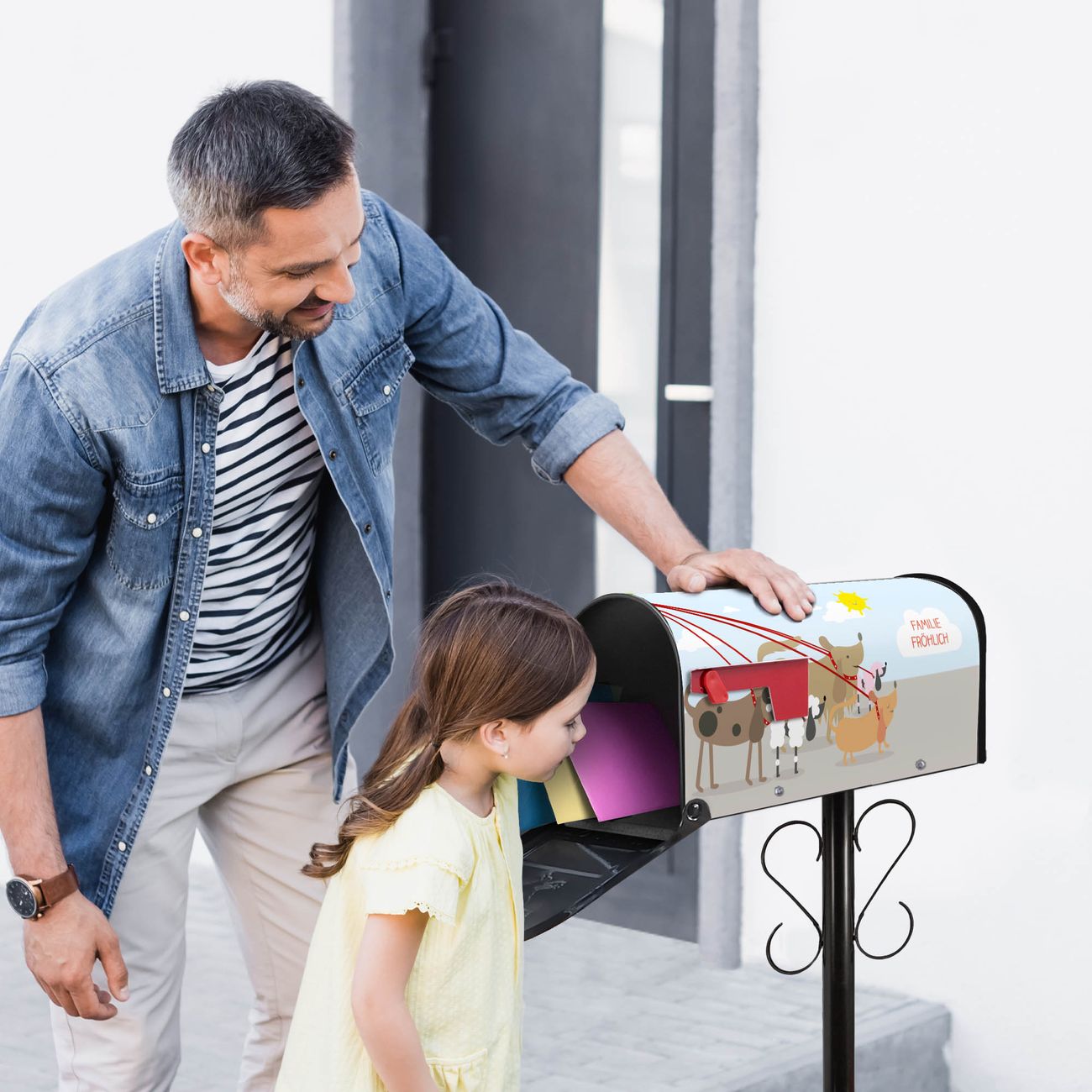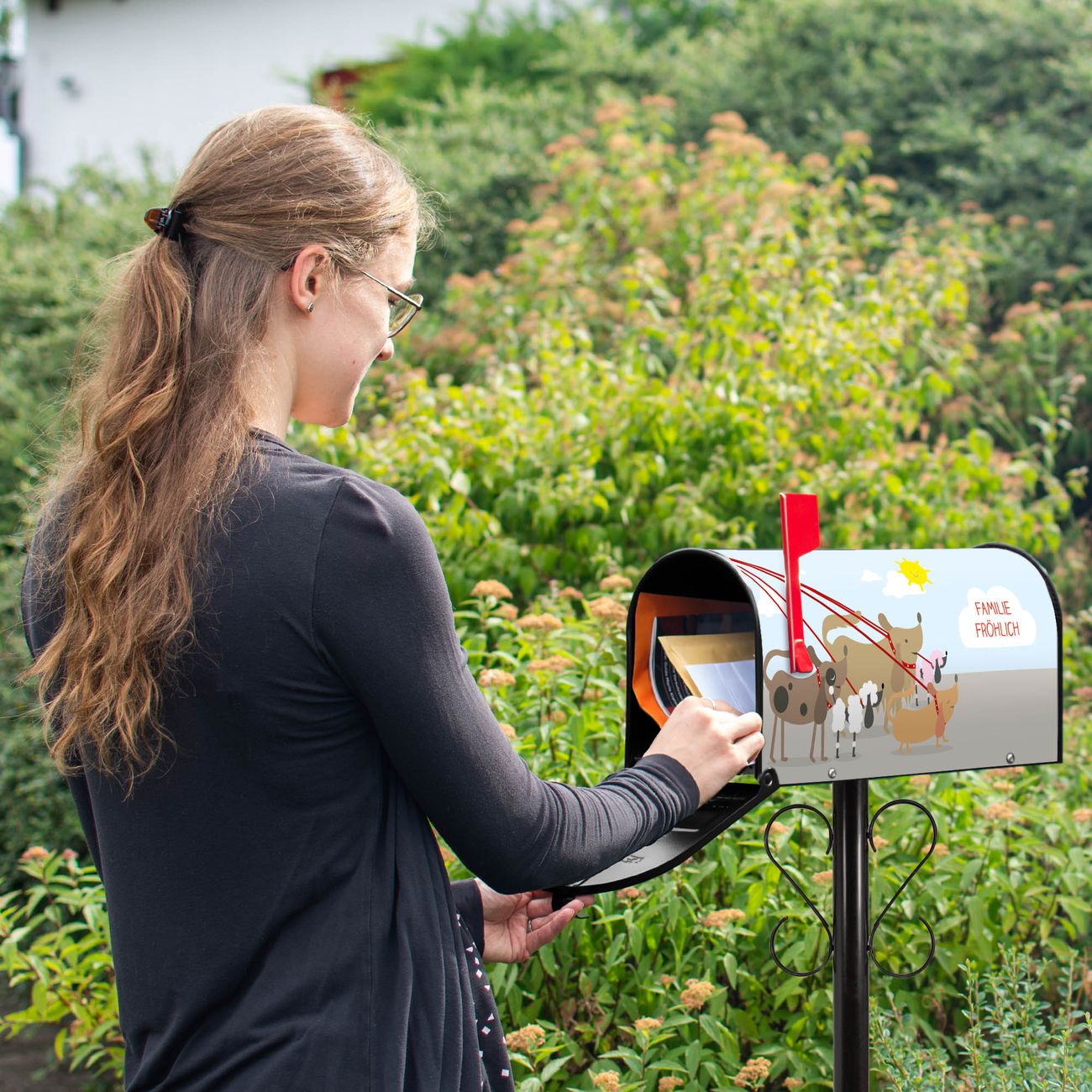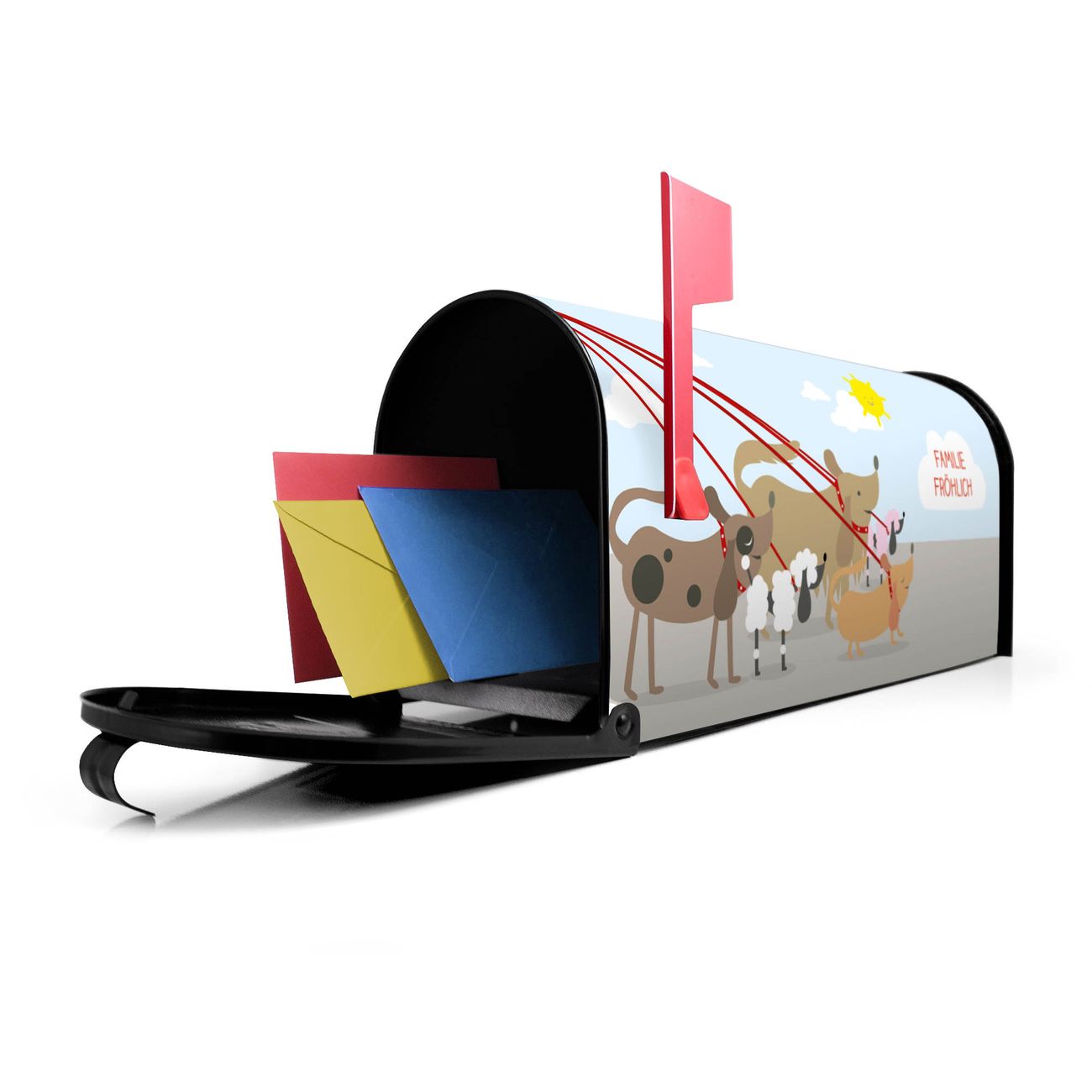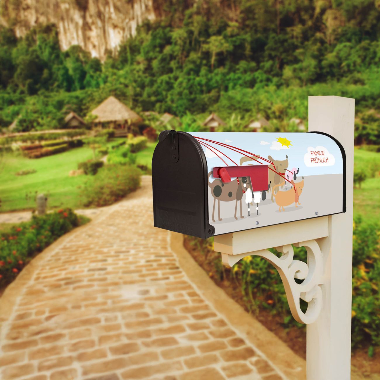 Der amerikanische Briefkasten von banjado mit Gassi Gehen Motiv bietet Ihnen ausreichend Fassungsvermögen, um große A4 Sendungen und Zeitschriften zu empfangen. Die typisch amerikanische rote Fahne zeigt Ihnen an, wenn Sie Post erhalten haben. Die US-Mailbox besteht aus verzinktem Stahlblech welches lackiert wurde und ist 48 x 22 x 16 CM (BxHxT) groß. Die Folie mit Motiv Gassi Gehen besteht aus einer wetter- und UV-resistenten Folie, die mit einem Schutzlaminat überzogen ist, sodass die US Mailbox zusätzlich vor Kratzern geschützt ist. An der Unterkante sind 4 Löcher je Seite um die Mailbox, typisch amerikanisch, an einem Holzpfahl oder einem Zaun zu befestigen. Auf Wunsch können Sie bei uns den passenden Standfuß oder die passende Wandhalterung kaufen um die US-Mailbox sicher zu befestigen. Wir bieten Ihnen ebenfalls Namensschilder, bereits beschriftet oder frei zu beschriften, und verschiedene selbst gestaltete Bitte-Keine-Werbung-Aufkleber.