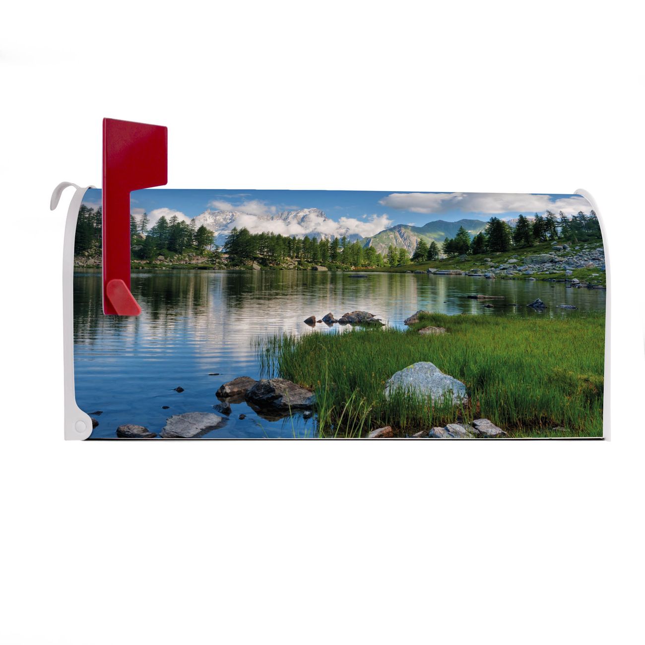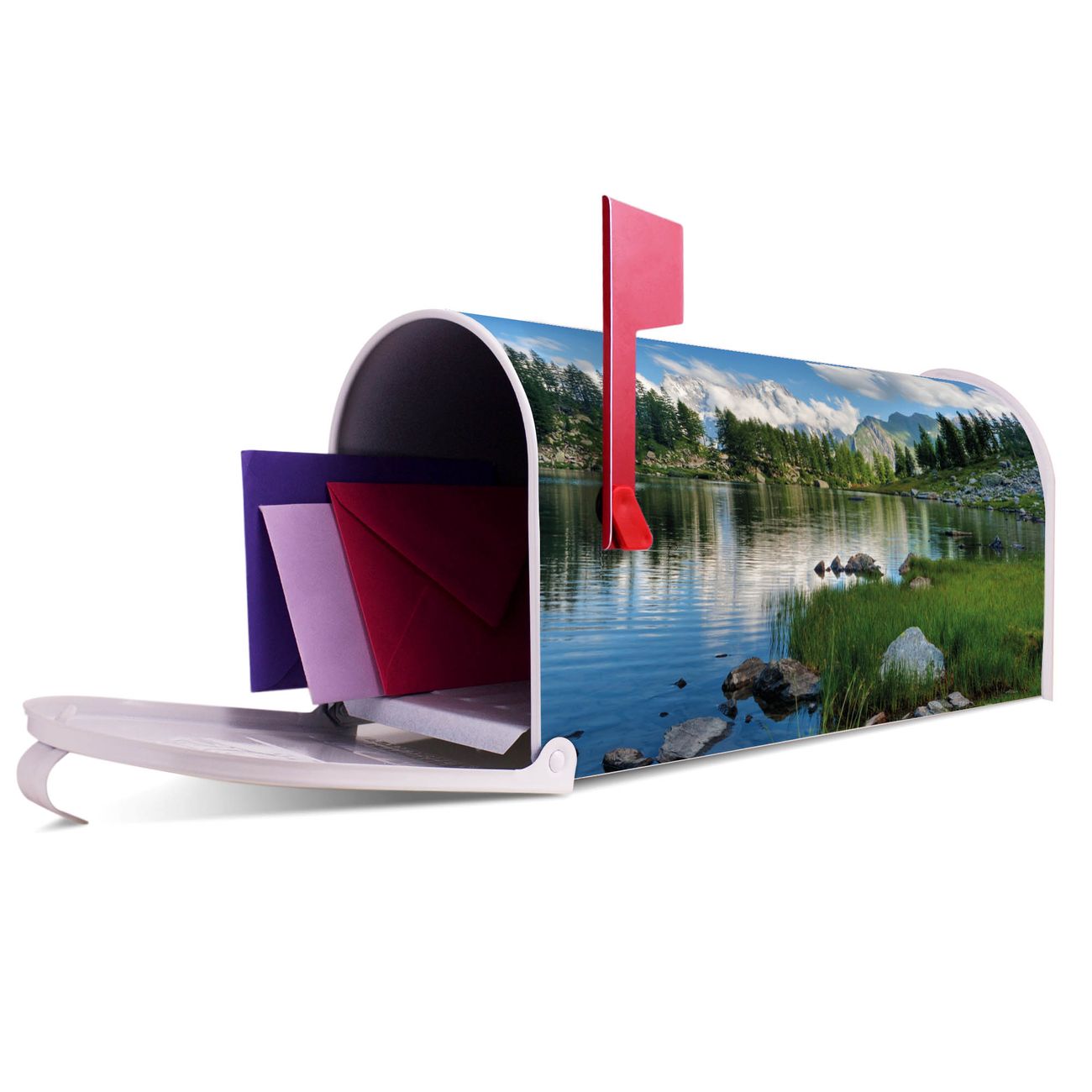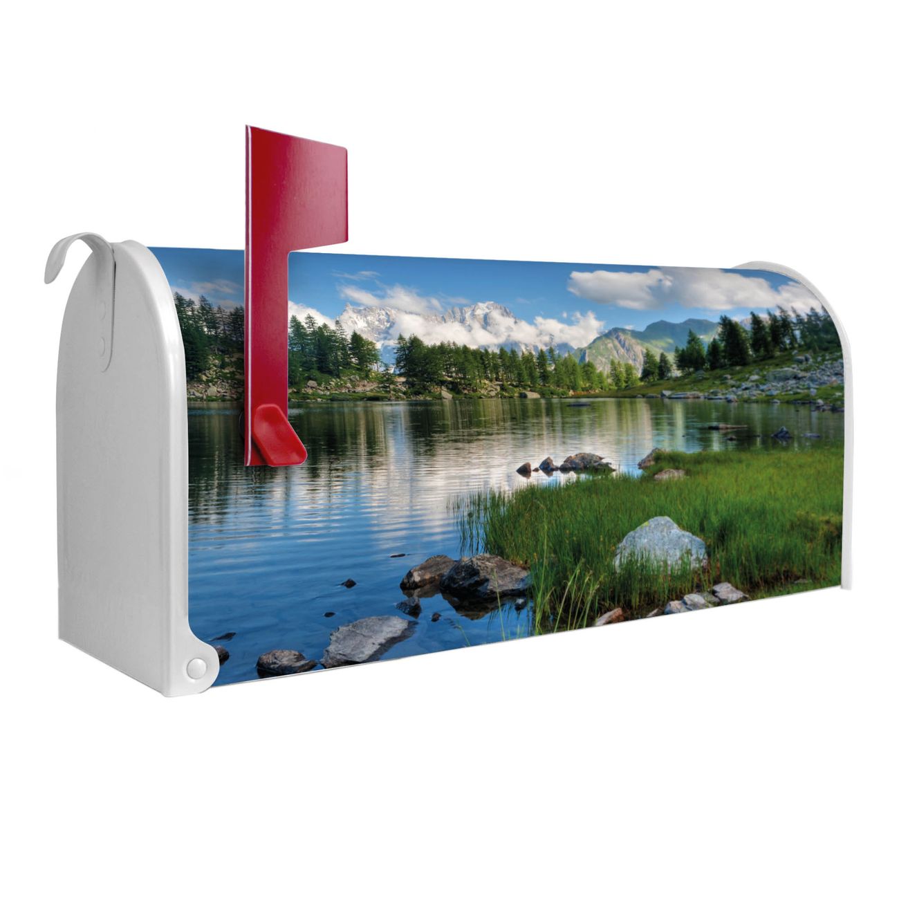 Unser amerikanischer Briefkasten mit dem Motiv Gebirgssee hat ein sehr ansprechendes und ausgefallenes Design, ist in der Grundfarbe weiß, grün oder schwarz erhältlich. Damit entlocken Sie Ihren Nachbarn und dem Postboten immer wieder ein Lächeln. Die Mailbox ist ein Original Import aus Mississippi USA und wird von unserer kleinen Manufaktur in Sachsen von Hand veredelt. Die US-Mailbox bietet ausreichend Platz auch für große Sendungen, eine Fahne die Ihnen Post anzeigt, wetterfestes und äußerst stabiles Material - so macht Post empfangen Freude.