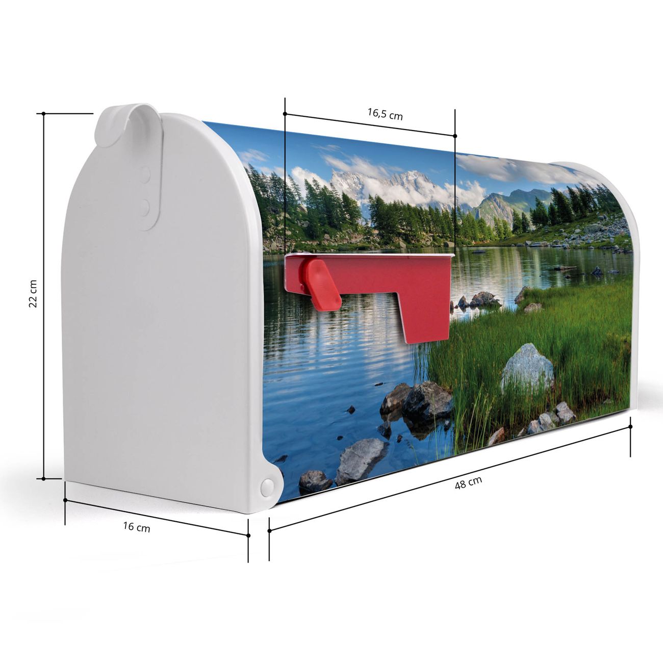 Der amerikanische Briefkasten von banjado mit Gebirgssee Motiv bietet Ihnen ausreichend Fassungsvermögen, um große A4 Sendungen und Zeitschriften zu empfangen. Die typisch amerikanische rote Fahne zeigt Ihnen an, wenn Sie Post erhalten haben. Die US-Mailbox besteht aus verzinktem Stahlblech welches lackiert wurde und ist 48 x 22 x 16 CM (BxHxT) groß. Die Folie mit Motiv Gebirgssee besteht aus einer wetter- und UV-resistenten Folie, die mit einem Schutzlaminat überzogen ist, sodass die US Mailbox zusätzlich vor Kratzern geschützt ist. An der Unterkante sind 4 Löcher je Seite um die Mailbox, typisch amerikanisch, an einem Holzpfahl oder einem Zaun zu befestigen. Auf Wunsch können Sie bei uns den passenden Standfuß oder die passende Wandhalterung kaufen um die US-Mailbox sicher zu befestigen. Wir bieten Ihnen ebenfalls Namensschilder, bereits beschriftet oder frei zu beschriften, und verschiedene selbst gestaltete Bitte-Keine-Werbung-Aufkleber.