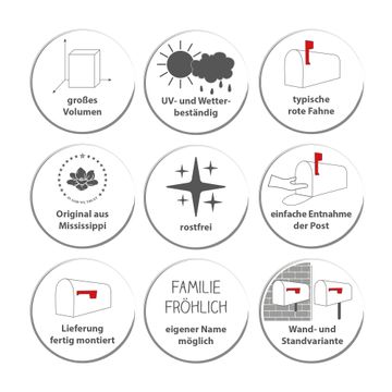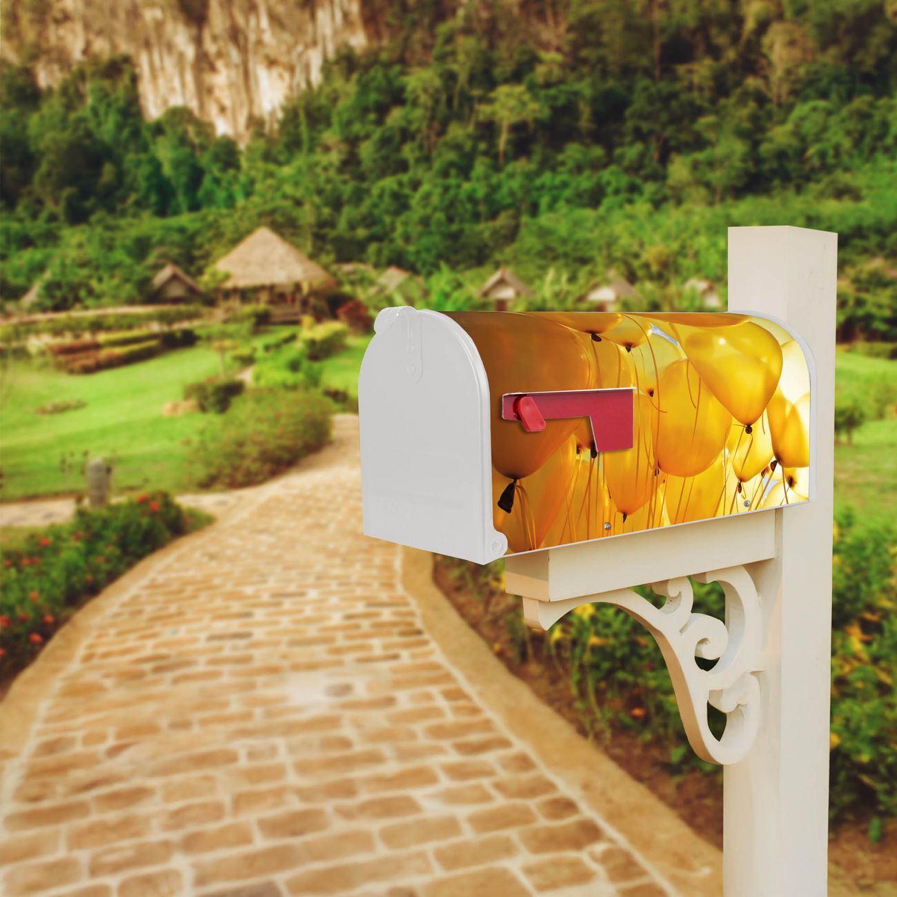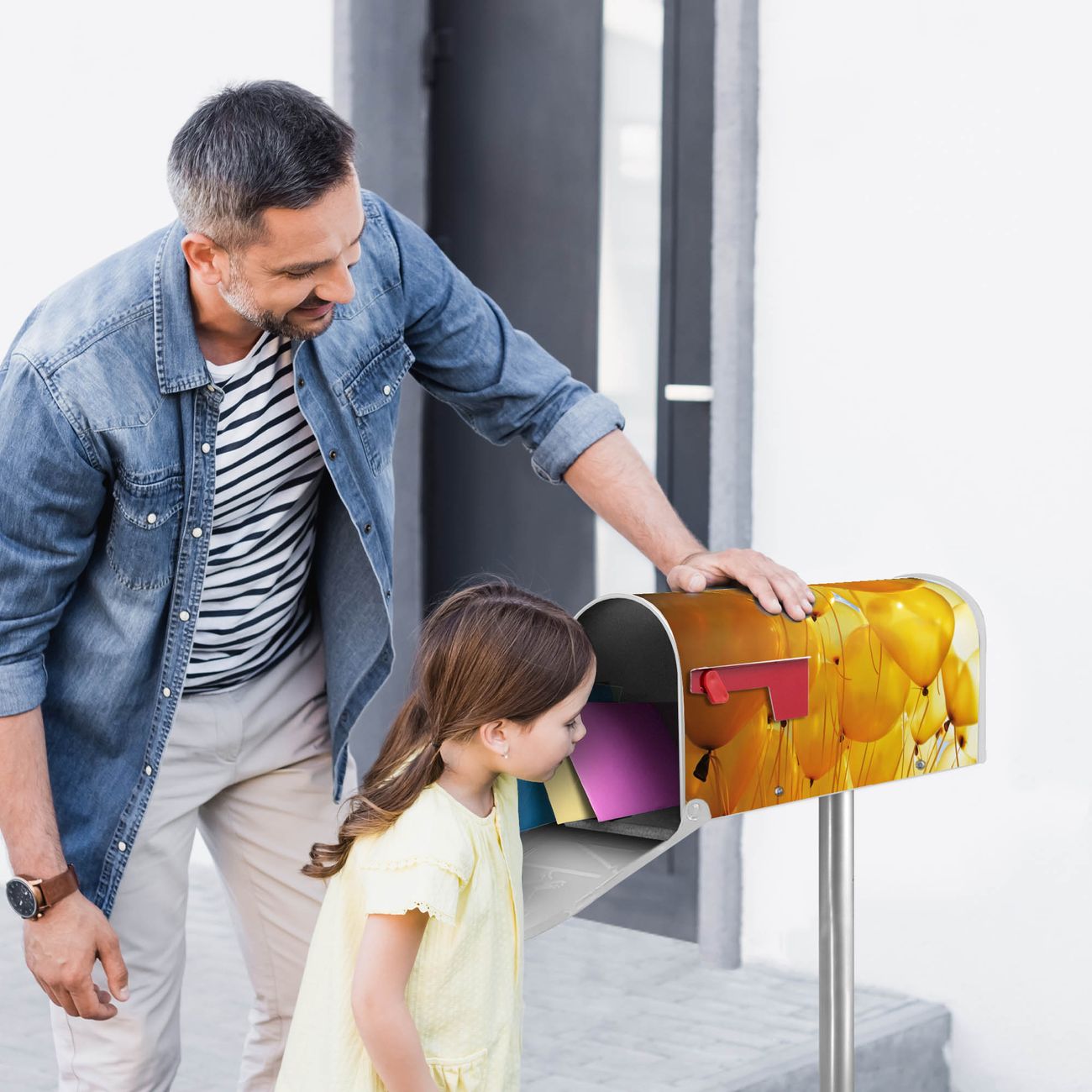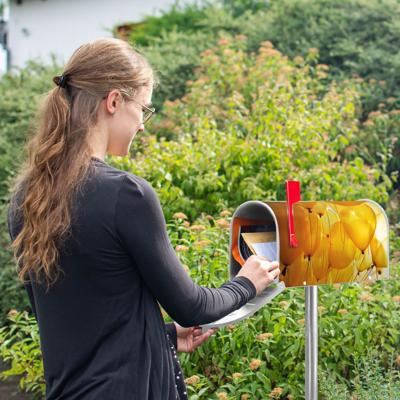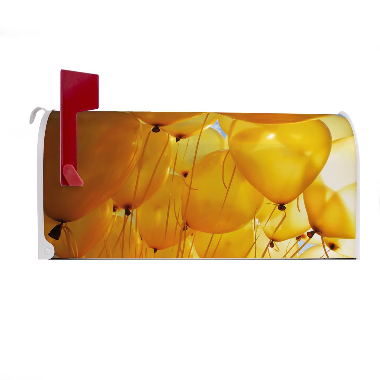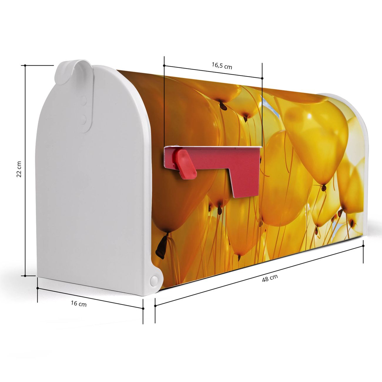 Der amerikanische Briefkasten von banjado mit Gelbe Luftballons Motiv bietet Ihnen ausreichend Fassungsvermögen, um große A4 Sendungen und Zeitschriften zu empfangen. Die typisch amerikanische rote Fahne zeigt Ihnen an, wenn Sie Post erhalten haben. Die US-Mailbox besteht aus verzinktem Stahlblech welches lackiert wurde und ist 48 x 22 x 16 CM (BxHxT) groß. Die Folie mit Motiv Gelbe Luftballons besteht aus einer wetter- und UV-resistenten Folie, die mit einem Schutzlaminat überzogen ist, sodass die US Mailbox zusätzlich vor Kratzern geschützt ist. An der Unterkante sind 4 Löcher je Seite um die Mailbox, typisch amerikanisch, an einem Holzpfahl oder einem Zaun zu befestigen. Auf Wunsch können Sie bei uns den passenden Standfuß oder die passende Wandhalterung kaufen um die US-Mailbox sicher zu befestigen. Wir bieten Ihnen ebenfalls Namensschilder, bereits beschriftet oder frei zu beschriften, und verschiedene selbst gestaltete Bitte-Keine-Werbung-Aufkleber.