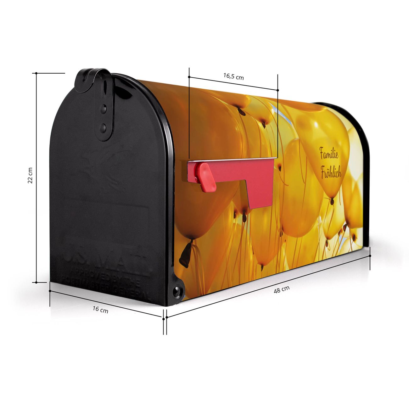 Der amerikanische Briefkasten von banjado mit Gelbe Luftballons Motiv bietet Ihnen ausreichend Fassungsvermögen, um große A4 Sendungen und Zeitschriften zu empfangen. Die typisch amerikanische rote Fahne zeigt Ihnen an, wenn Sie Post erhalten haben. Die US-Mailbox besteht aus verzinktem Stahlblech welches lackiert wurde und ist 48 x 22 x 16 CM (BxHxT) groß. Die Folie mit Motiv Gelbe Luftballons besteht aus einer wetter- und UV-resistenten Folie, die mit einem Schutzlaminat überzogen ist, sodass die US Mailbox zusätzlich vor Kratzern geschützt ist. An der Unterkante sind 4 Löcher je Seite um die Mailbox, typisch amerikanisch, an einem Holzpfahl oder einem Zaun zu befestigen. Auf Wunsch können Sie bei uns den passenden Standfuß oder die passende Wandhalterung kaufen um die US-Mailbox sicher zu befestigen. Wir bieten Ihnen ebenfalls Namensschilder, bereits beschriftet oder frei zu beschriften, und verschiedene selbst gestaltete Bitte-Keine-Werbung-Aufkleber.