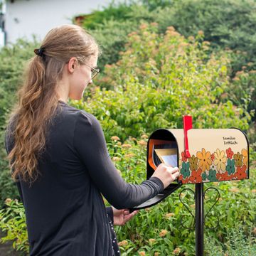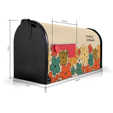 Der amerikanische Briefkasten von banjado mit WT Gemalte Blumen Motiv bietet Ihnen ausreichend Fassungsvermögen, um große A4 Sendungen und Zeitschriften zu empfangen. Die typisch amerikanische rote Fahne zeigt Ihnen an, wenn Sie Post erhalten haben. Die US-Mailbox besteht aus verzinktem Stahlblech welches lackiert wurde und ist 48 x 22 x 16 CM (BxHxT) groß. Die Folie mit Motiv WT Gemalte Blumen besteht aus einer wetter- und UV-resistenten Folie, die mit einem Schutzlaminat überzogen ist, sodass die US Mailbox zusätzlich vor Kratzern geschützt ist. An der Unterkante sind 4 Löcher je Seite um die Mailbox, typisch amerikanisch, an einem Holzpfahl oder einem Zaun zu befestigen. Auf Wunsch können Sie bei uns den passenden Standfuß oder die passende Wandhalterung kaufen um die US-Mailbox sicher zu befestigen. Wir bieten Ihnen ebenfalls Namensschilder, bereits beschriftet oder frei zu beschriften, und verschiedene selbst gestaltete Bitte-Keine-Werbung-Aufkleber.
