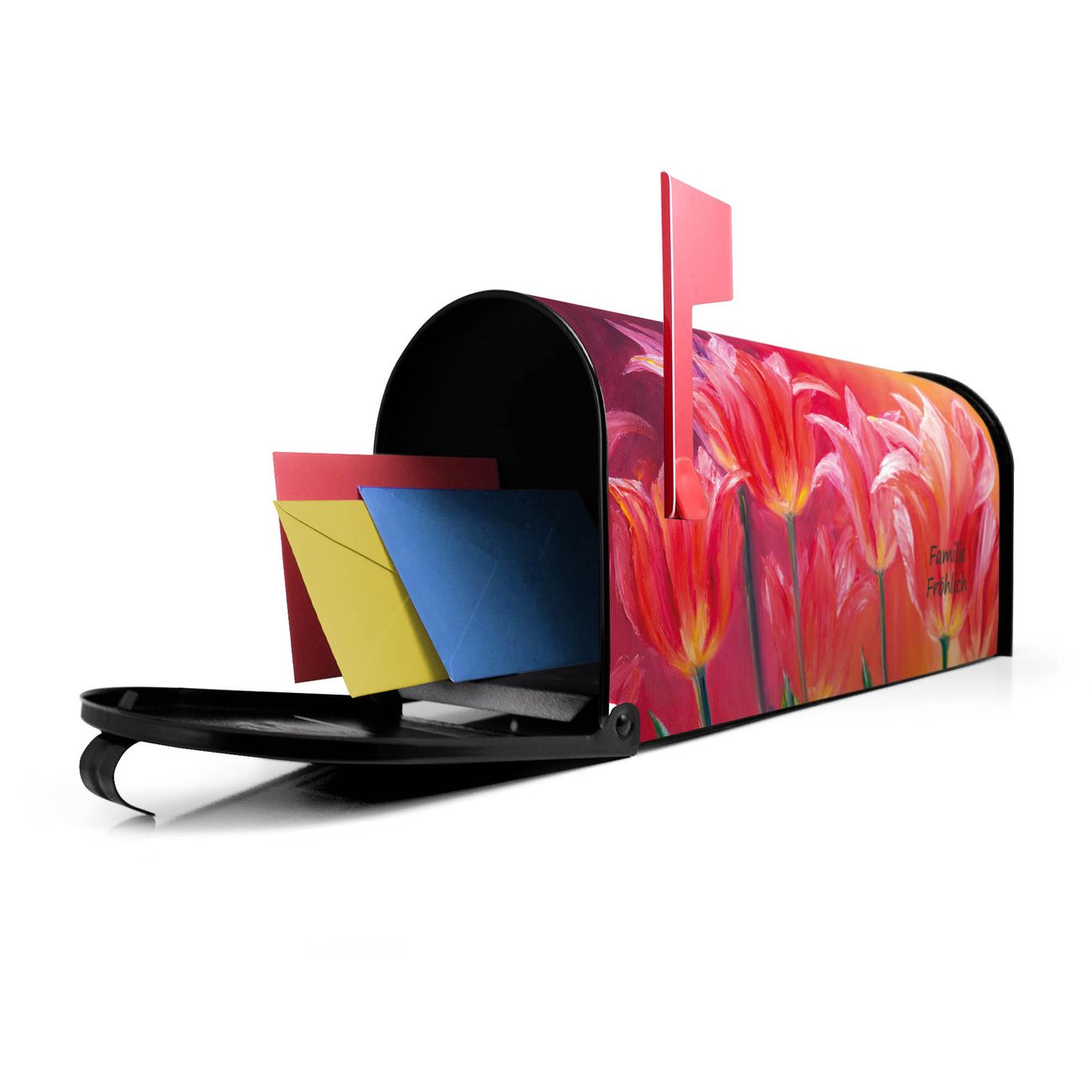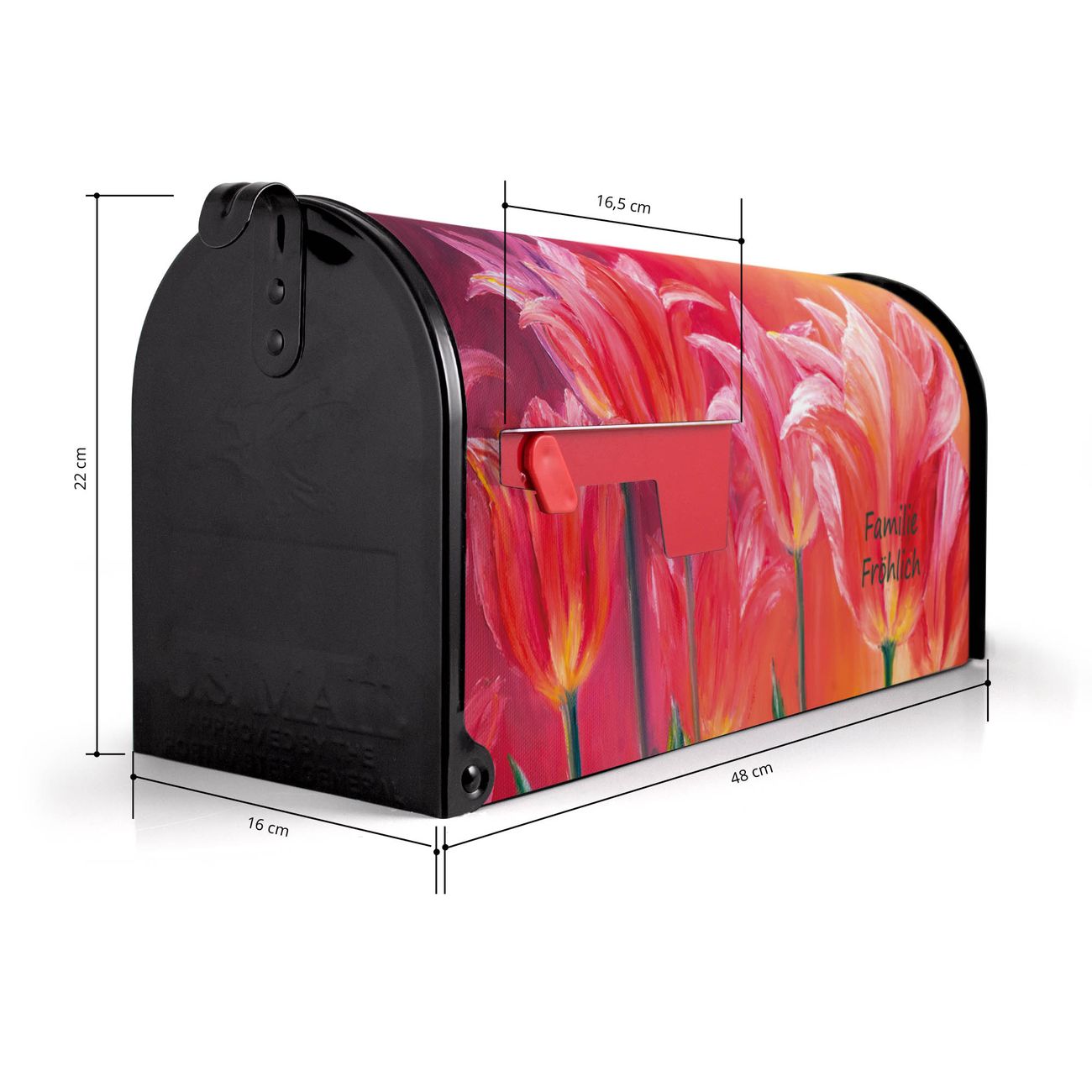 Der amerikanische Briefkasten von banjado mit Gemalte Tulpen Motiv bietet Ihnen ausreichend Fassungsvermögen, um große A4 Sendungen und Zeitschriften zu empfangen. Die typisch amerikanische rote Fahne zeigt Ihnen an, wenn Sie Post erhalten haben. Die US-Mailbox besteht aus verzinktem Stahlblech welches lackiert wurde und ist 48 x 22 x 16 CM (BxHxT) groß. Die Folie mit Motiv Gemalte Tulpen besteht aus einer wetter- und UV-resistenten Folie, die mit einem Schutzlaminat überzogen ist, sodass die US Mailbox zusätzlich vor Kratzern geschützt ist. An der Unterkante sind 4 Löcher je Seite um die Mailbox, typisch amerikanisch, an einem Holzpfahl oder einem Zaun zu befestigen. Auf Wunsch können Sie bei uns den passenden Standfuß oder die passende Wandhalterung kaufen um die US-Mailbox sicher zu befestigen. Wir bieten Ihnen ebenfalls Namensschilder, bereits beschriftet oder frei zu beschriften, und verschiedene selbst gestaltete Bitte-Keine-Werbung-Aufkleber.