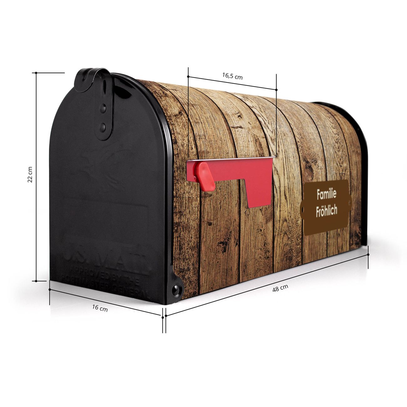 Der amerikanische Briefkasten von banjado mit Geöltes Holz Motiv bietet Ihnen ausreichend Fassungsvermögen, um große A4 Sendungen und Zeitschriften zu empfangen. Die typisch amerikanische rote Fahne zeigt Ihnen an, wenn Sie Post erhalten haben. Die US-Mailbox besteht aus verzinktem Stahlblech welches lackiert wurde und ist 48 x 22 x 16 CM (BxHxT) groß. Die Folie mit Motiv Geöltes Holz besteht aus einer wetter- und UV-resistenten Folie, die mit einem Schutzlaminat überzogen ist, sodass die US Mailbox zusätzlich vor Kratzern geschützt ist. An der Unterkante sind 4 Löcher je Seite um die Mailbox, typisch amerikanisch, an einem Holzpfahl oder einem Zaun zu befestigen. Auf Wunsch können Sie bei uns den passenden Standfuß oder die passende Wandhalterung kaufen um die US-Mailbox sicher zu befestigen. Wir bieten Ihnen ebenfalls Namensschilder, bereits beschriftet oder frei zu beschriften, und verschiedene selbst gestaltete Bitte-Keine-Werbung-Aufkleber.