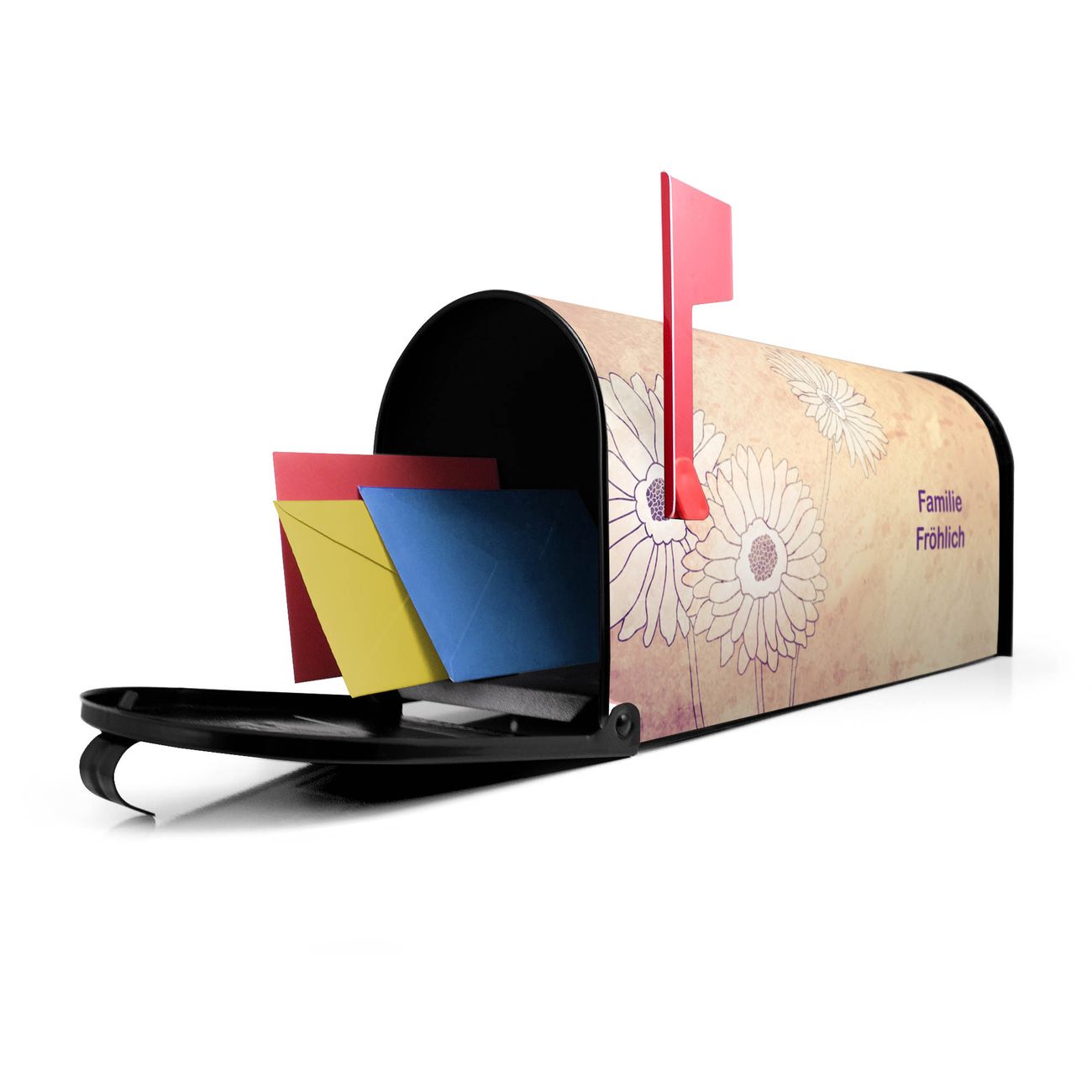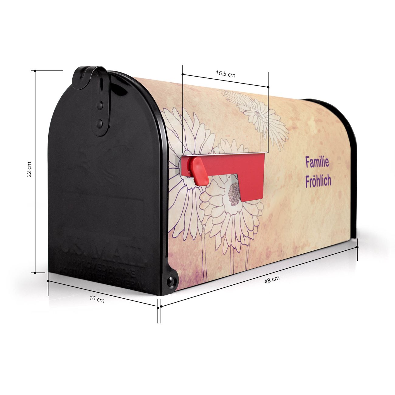 Der amerikanische Briefkasten von banjado mit Gerbera Motiv bietet Ihnen ausreichend Fassungsvermögen, um große A4 Sendungen und Zeitschriften zu empfangen. Die typisch amerikanische rote Fahne zeigt Ihnen an, wenn Sie Post erhalten haben. Die US-Mailbox besteht aus verzinktem Stahlblech welches lackiert wurde und ist 48 x 22 x 16 CM (BxHxT) groß. Die Folie mit Motiv Gerbera besteht aus einer wetter- und UV-resistenten Folie, die mit einem Schutzlaminat überzogen ist, sodass die US Mailbox zusätzlich vor Kratzern geschützt ist. An der Unterkante sind 4 Löcher je Seite um die Mailbox, typisch amerikanisch, an einem Holzpfahl oder einem Zaun zu befestigen. Auf Wunsch können Sie bei uns den passenden Standfuß oder die passende Wandhalterung kaufen um die US-Mailbox sicher zu befestigen. Wir bieten Ihnen ebenfalls Namensschilder, bereits beschriftet oder frei zu beschriften, und verschiedene selbst gestaltete Bitte-Keine-Werbung-Aufkleber.