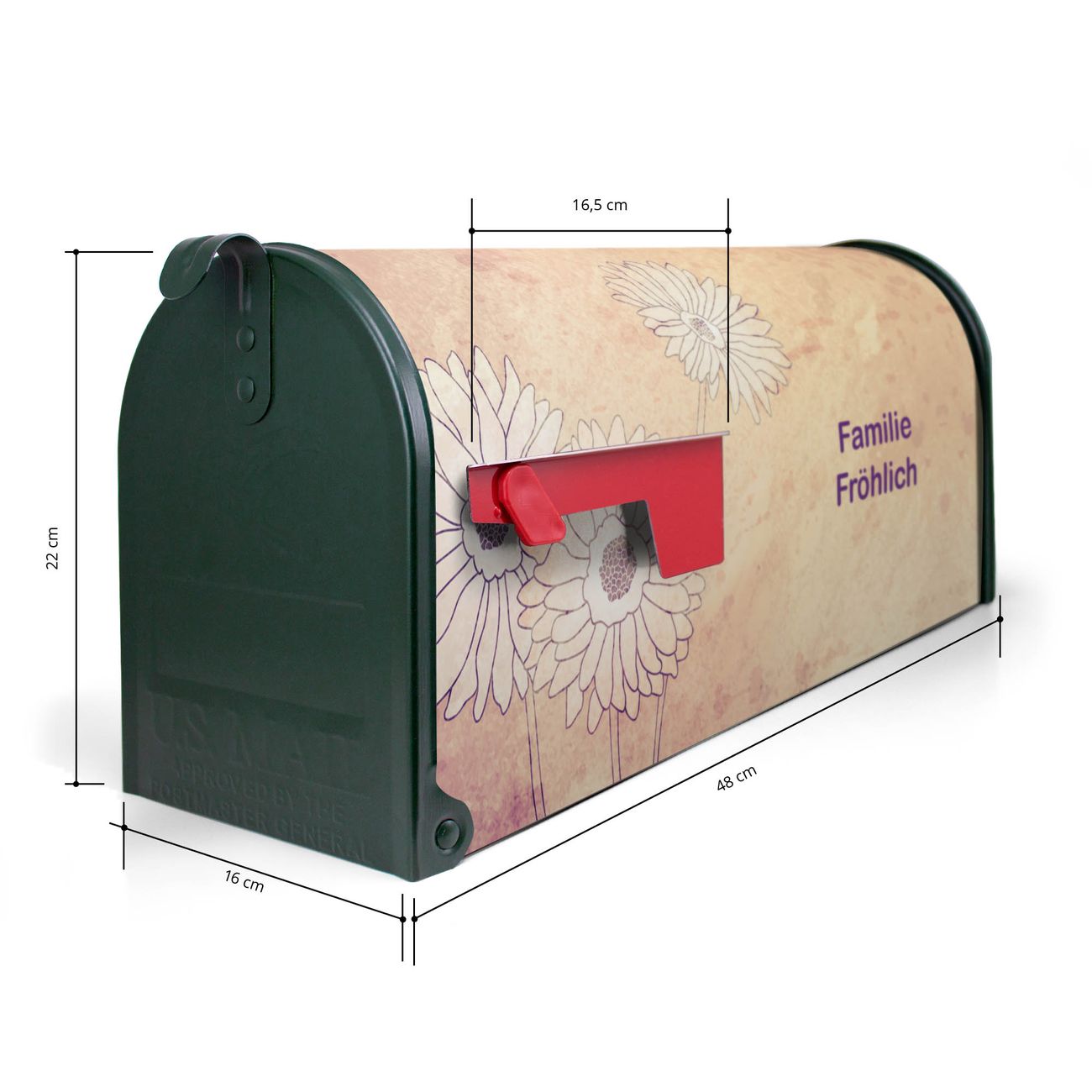 Der amerikanische Briefkasten von banjado mit WT Gerbera Motiv bietet Ihnen ausreichend Fassungsvermögen, um große A4 Sendungen und Zeitschriften zu empfangen. Die typisch amerikanische rote Fahne zeigt Ihnen an, wenn Sie Post erhalten haben. Die US-Mailbox besteht aus verzinktem Stahlblech welches lackiert wurde und ist 48 x 22 x 16 CM (BxHxT) groß. Die Folie mit Motiv WT Gerbera besteht aus einer wetter- und UV-resistenten Folie, die mit einem Schutzlaminat überzogen ist, sodass die US Mailbox zusätzlich vor Kratzern geschützt ist. An der Unterkante sind 4 Löcher je Seite um die Mailbox, typisch amerikanisch, an einem Holzpfahl oder einem Zaun zu befestigen. Auf Wunsch können Sie bei uns den passenden Standfuß oder die passende Wandhalterung kaufen um die US-Mailbox sicher zu befestigen. Wir bieten Ihnen ebenfalls Namensschilder, bereits beschriftet oder frei zu beschriften, und verschiedene selbst gestaltete Bitte-Keine-Werbung-Aufkleber.