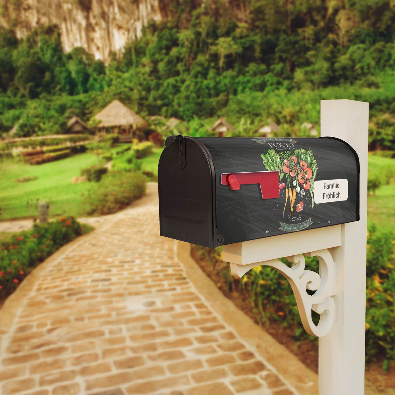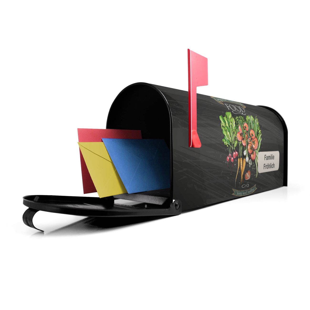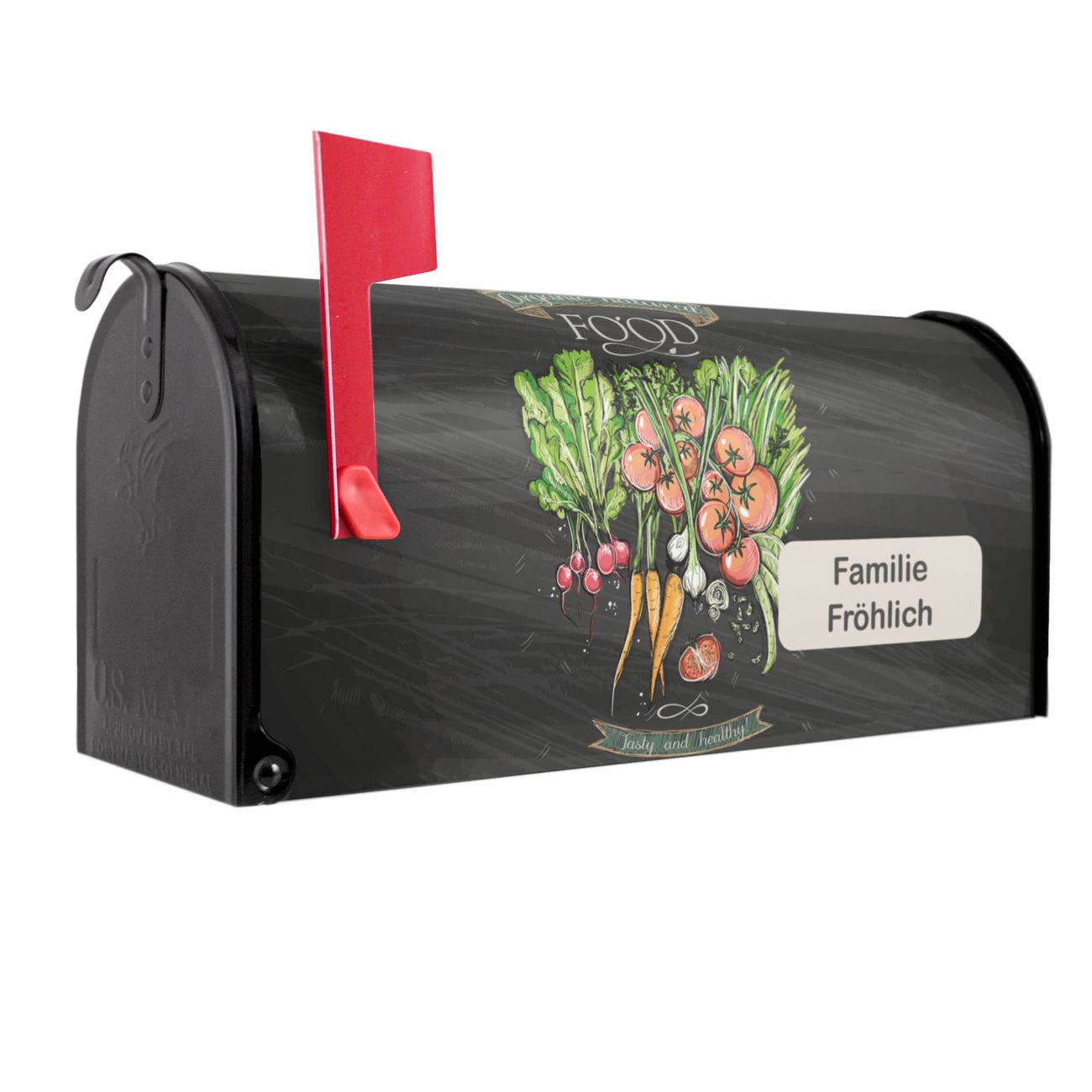 Unser amerikanischer Briefkasten mit dem Motiv Gesund Und Lecker hat ein sehr ansprechendes und ausgefallenes Design, ist in der Grundfarbe weiß, grün oder schwarz erhältlich. Damit entlocken Sie Ihren Nachbarn und dem Postboten immer wieder ein Lächeln. Die Mailbox ist ein Original Import aus Mississippi USA und wird von unserer kleinen Manufaktur in Sachsen von Hand veredelt. Die US-Mailbox bietet ausreichend Platz auch für große Sendungen, eine Fahne die Ihnen Post anzeigt, wetterfestes und äußerst stabiles Material - so macht Post empfangen Freude.