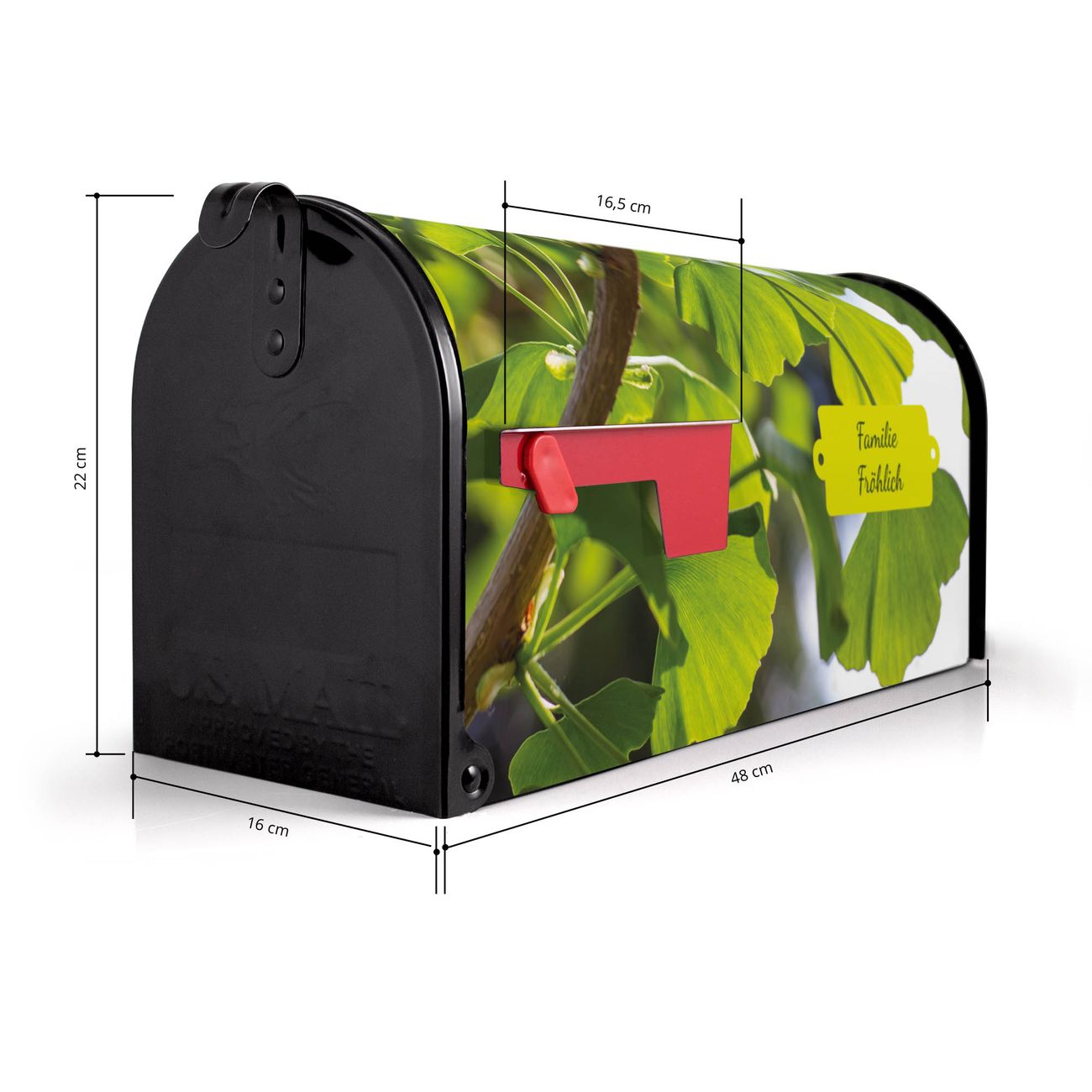 Der amerikanische Briefkasten von banjado mit Gingko Motiv bietet Ihnen ausreichend Fassungsvermögen, um große A4 Sendungen und Zeitschriften zu empfangen. Die typisch amerikanische rote Fahne zeigt Ihnen an, wenn Sie Post erhalten haben. Die US-Mailbox besteht aus verzinktem Stahlblech welches lackiert wurde und ist 48 x 22 x 16 CM (BxHxT) groß. Die Folie mit Motiv Gingko besteht aus einer wetter- und UV-resistenten Folie, die mit einem Schutzlaminat überzogen ist, sodass die US Mailbox zusätzlich vor Kratzern geschützt ist. An der Unterkante sind 4 Löcher je Seite um die Mailbox, typisch amerikanisch, an einem Holzpfahl oder einem Zaun zu befestigen. Auf Wunsch können Sie bei uns den passenden Standfuß oder die passende Wandhalterung kaufen um die US-Mailbox sicher zu befestigen. Wir bieten Ihnen ebenfalls Namensschilder, bereits beschriftet oder frei zu beschriften, und verschiedene selbst gestaltete Bitte-Keine-Werbung-Aufkleber.