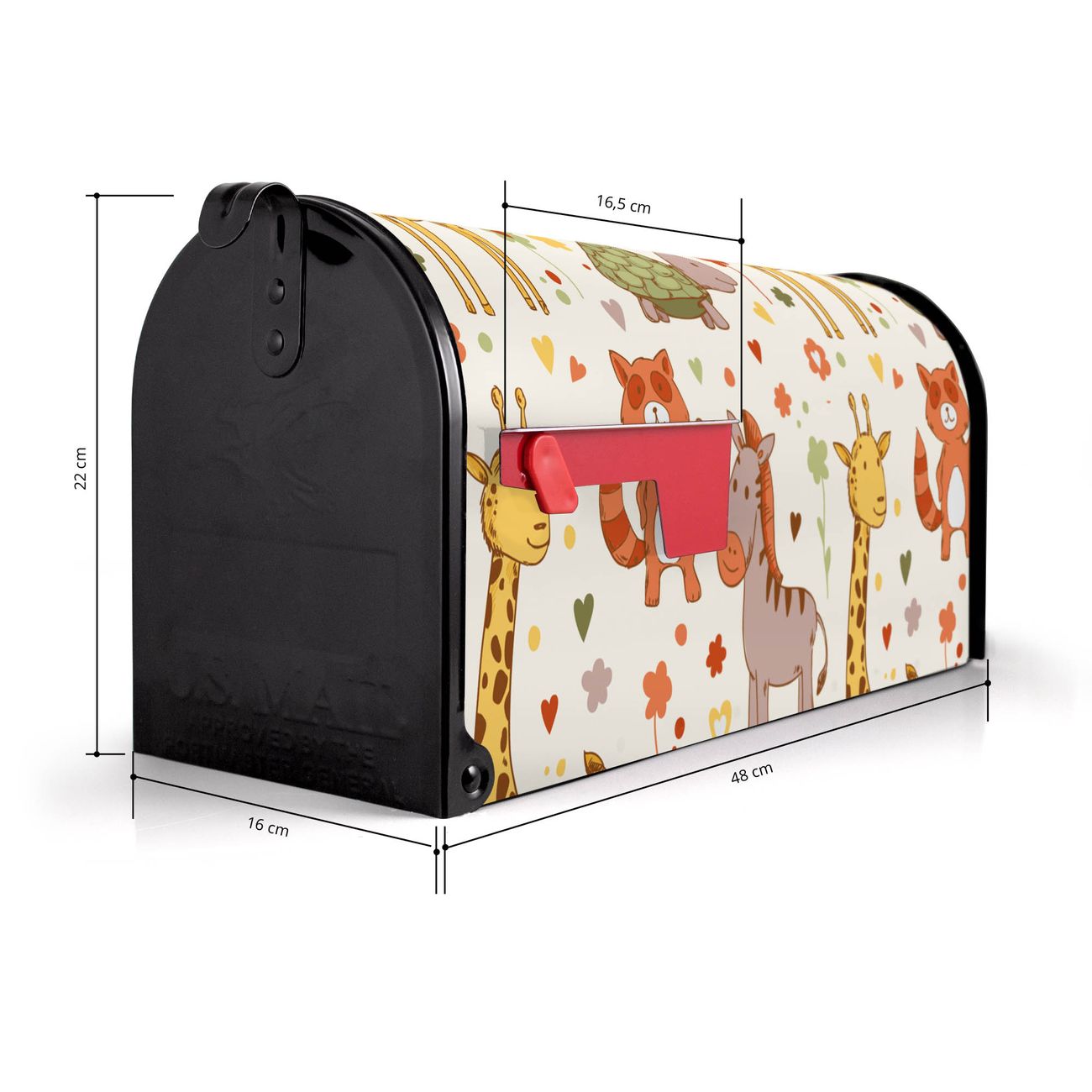 Der amerikanische Briefkasten von banjado mit Giraffe & Co Motiv bietet Ihnen ausreichend Fassungsvermögen, um große A4 Sendungen und Zeitschriften zu empfangen. Die typisch amerikanische rote Fahne zeigt Ihnen an, wenn Sie Post erhalten haben. Die US-Mailbox besteht aus verzinktem Stahlblech welches lackiert wurde und ist 48 x 22 x 16 CM (BxHxT) groß. Die Folie mit Motiv Giraffe & Co besteht aus einer wetter- und UV-resistenten Folie, die mit einem Schutzlaminat überzogen ist, sodass die US Mailbox zusätzlich vor Kratzern geschützt ist. An der Unterkante sind 4 Löcher je Seite um die Mailbox, typisch amerikanisch, an einem Holzpfahl oder einem Zaun zu befestigen. Auf Wunsch können Sie bei uns den passenden Standfuß oder die passende Wandhalterung kaufen um die US-Mailbox sicher zu befestigen. Wir bieten Ihnen ebenfalls Namensschilder, bereits beschriftet oder frei zu beschriften, und verschiedene selbst gestaltete Bitte-Keine-Werbung-Aufkleber.