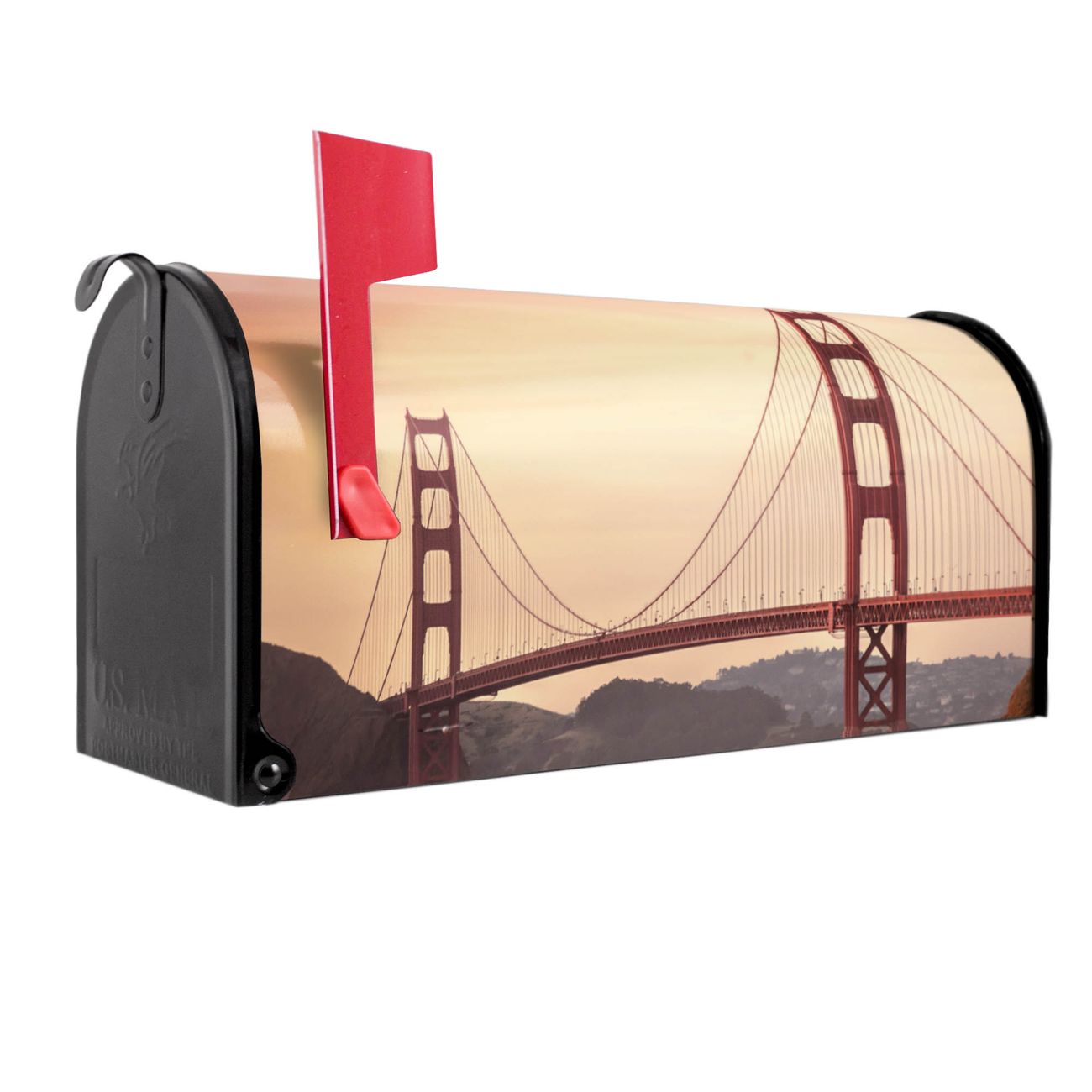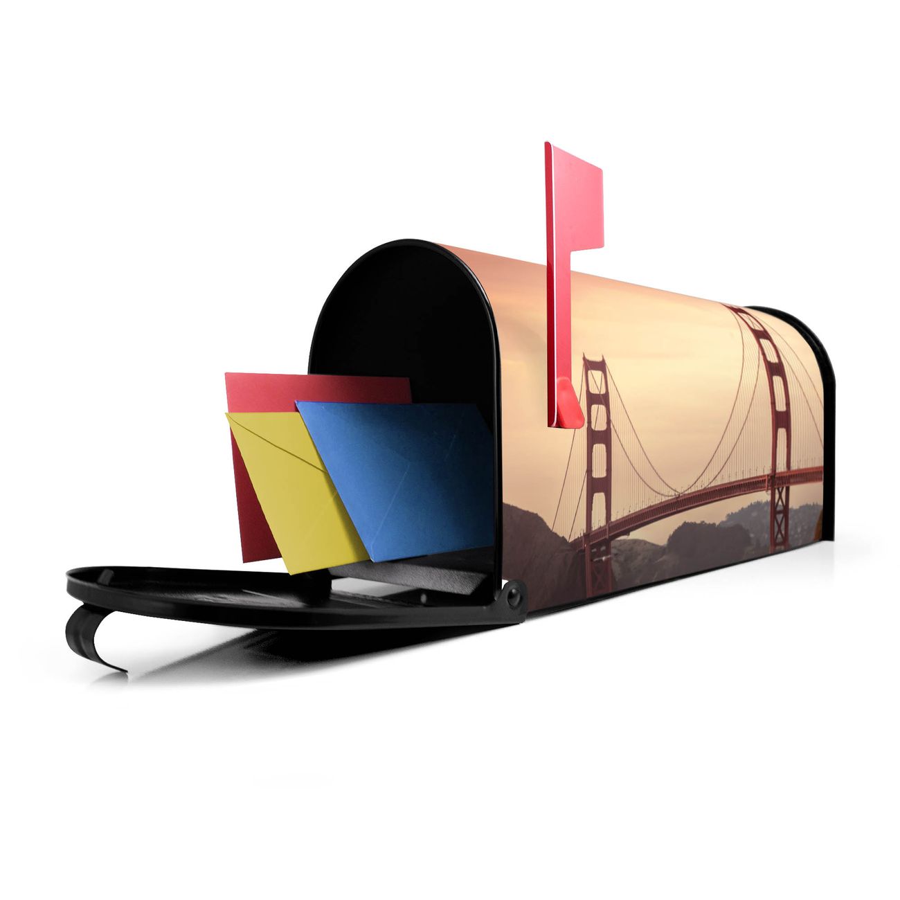 Unser amerikanischer Briefkasten mit dem Motiv Golden Gate Bridge 2 hat ein sehr ansprechendes und ausgefallenes Design, ist in der Grundfarbe weiß, grün oder schwarz erhältlich. Damit entlocken Sie Ihren Nachbarn und dem Postboten immer wieder ein Lächeln. Die Mailbox ist ein Original Import aus Mississippi USA und wird von unserer kleinen Manufaktur in Sachsen von Hand veredelt. Die US-Mailbox bietet ausreichend Platz auch für große Sendungen, eine Fahne die Ihnen Post anzeigt, wetterfestes und äußerst stabiles Material - so macht Post empfangen Freude.