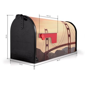 Der amerikanische Briefkasten von banjado mit Golden Gate Bridge 2 Motiv bietet Ihnen ausreichend Fassungsvermögen, um große A4 Sendungen und Zeitschriften zu empfangen. Die typisch amerikanische rote Fahne zeigt Ihnen an, wenn Sie Post erhalten haben. Die US-Mailbox besteht aus verzinktem Stahlblech welches lackiert wurde und ist 48 x 22 x 16 CM (BxHxT) groß. Die Folie mit Motiv Golden Gate Bridge 2 besteht aus einer wetter- und UV-resistenten Folie, die mit einem Schutzlaminat überzogen ist, sodass die US Mailbox zusätzlich vor Kratzern geschützt ist. An der Unterkante sind 4 Löcher je Seite um die Mailbox, typisch amerikanisch, an einem Holzpfahl oder einem Zaun zu befestigen. Auf Wunsch können Sie bei uns den passenden Standfuß oder die passende Wandhalterung kaufen um die US-Mailbox sicher zu befestigen. Wir bieten Ihnen ebenfalls Namensschilder, bereits beschriftet oder frei zu beschriften, und verschiedene selbst gestaltete Bitte-Keine-Werbung-Aufkleber.