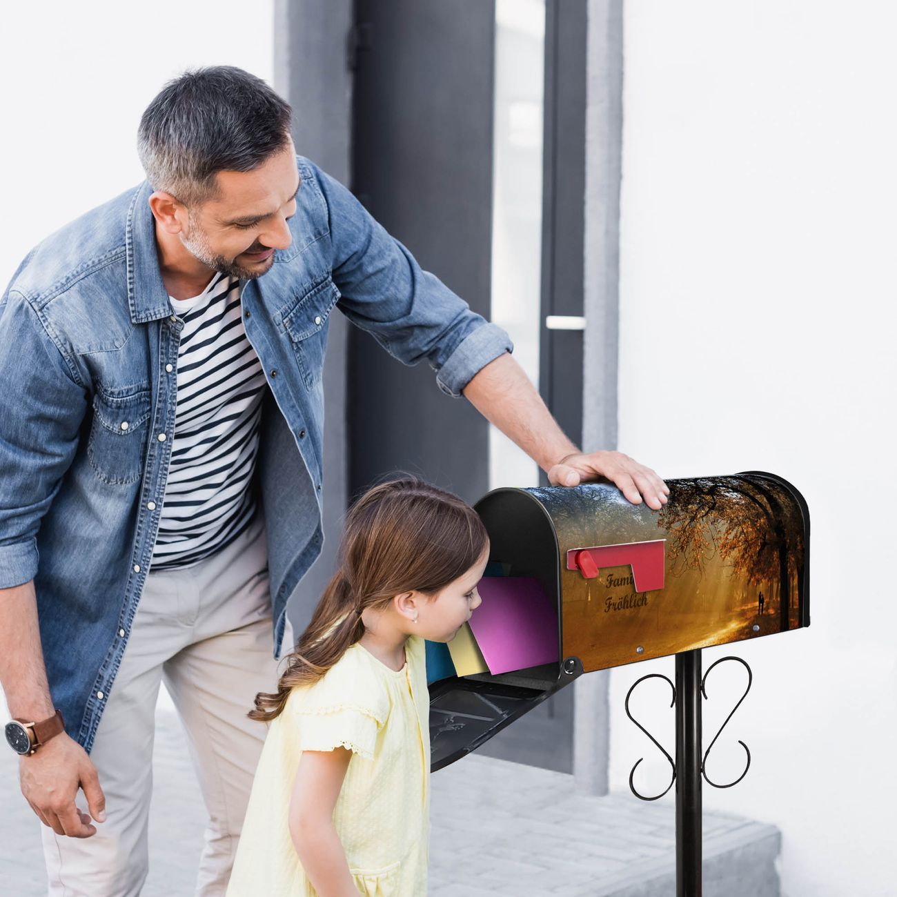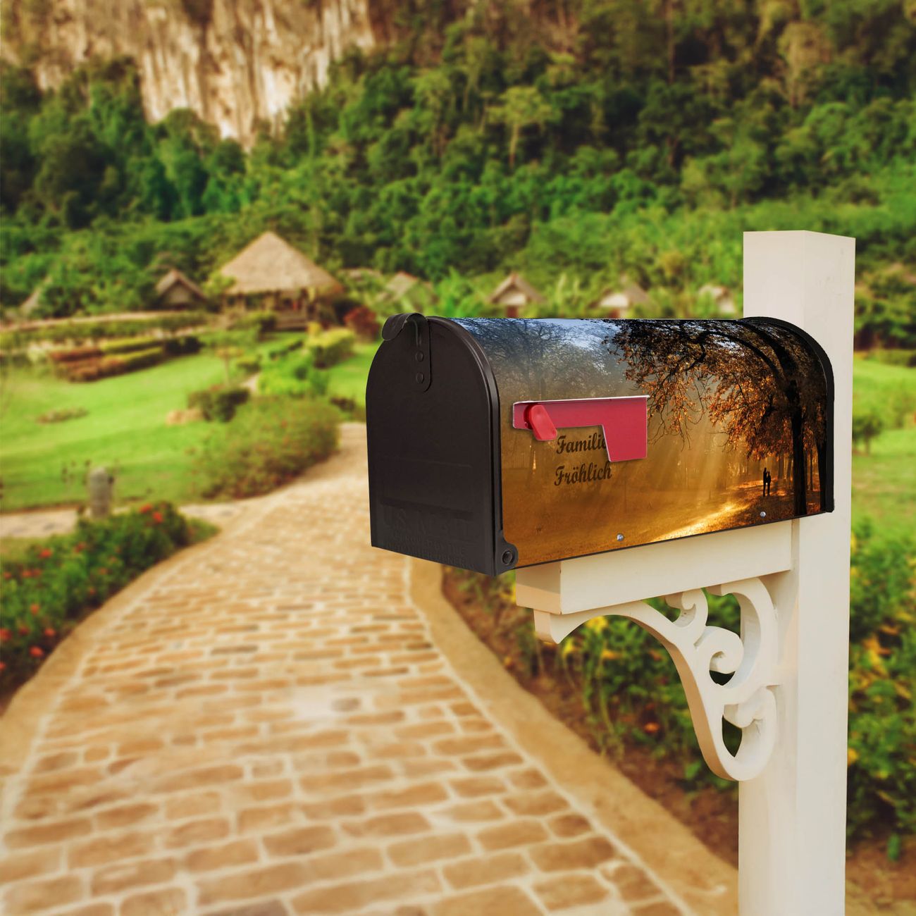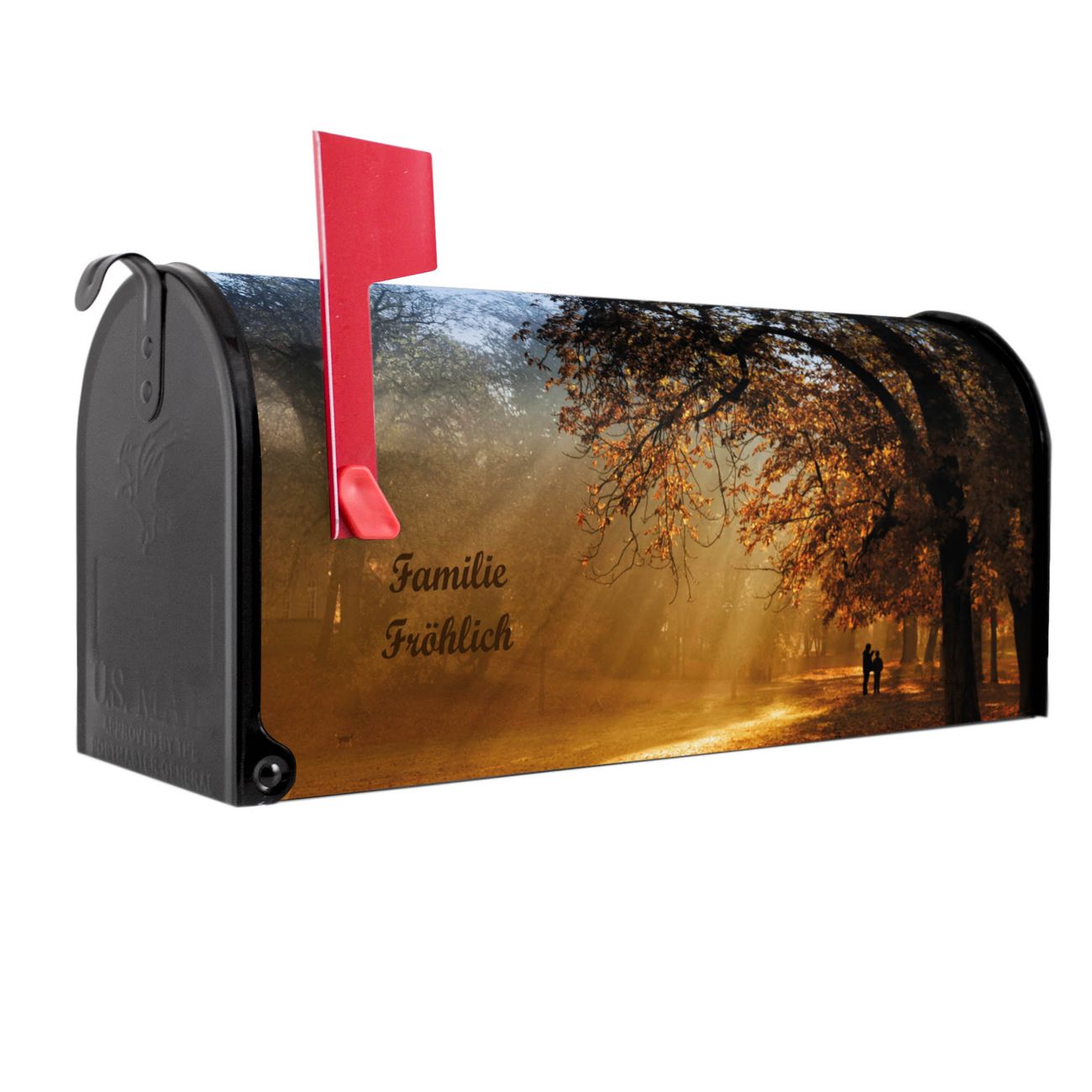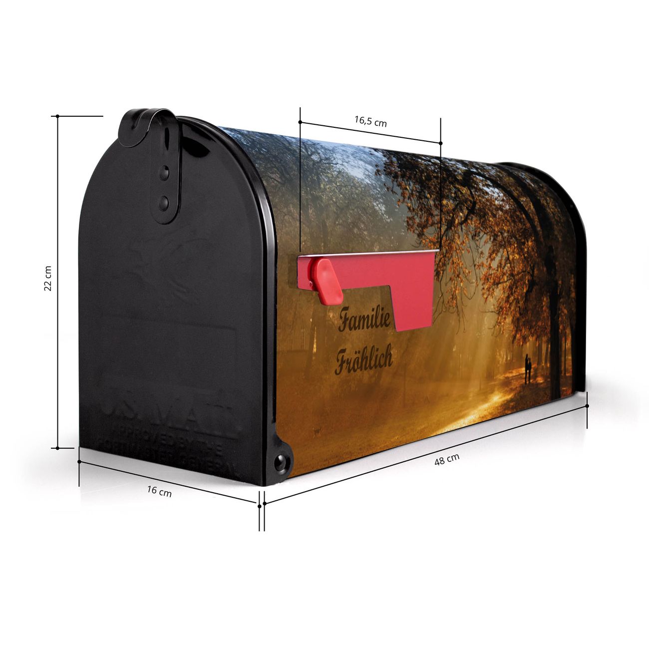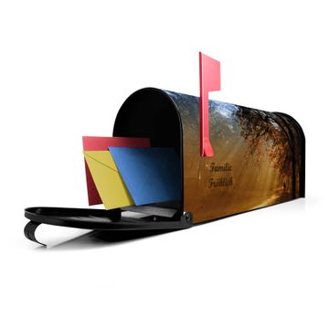 Der amerikanische Briefkasten von banjado mit Goldener Herbst Motiv bietet Ihnen ausreichend Fassungsvermögen, um große A4 Sendungen und Zeitschriften zu empfangen. Die typisch amerikanische rote Fahne zeigt Ihnen an, wenn Sie Post erhalten haben. Die US-Mailbox besteht aus verzinktem Stahlblech welches lackiert wurde und ist 48 x 22 x 16 CM (BxHxT) groß. Die Folie mit Motiv Goldener Herbst besteht aus einer wetter- und UV-resistenten Folie, die mit einem Schutzlaminat überzogen ist, sodass die US Mailbox zusätzlich vor Kratzern geschützt ist. An der Unterkante sind 4 Löcher je Seite um die Mailbox, typisch amerikanisch, an einem Holzpfahl oder einem Zaun zu befestigen. Auf Wunsch können Sie bei uns den passenden Standfuß oder die passende Wandhalterung kaufen um die US-Mailbox sicher zu befestigen. Wir bieten Ihnen ebenfalls Namensschilder, bereits beschriftet oder frei zu beschriften, und verschiedene selbst gestaltete Bitte-Keine-Werbung-Aufkleber.