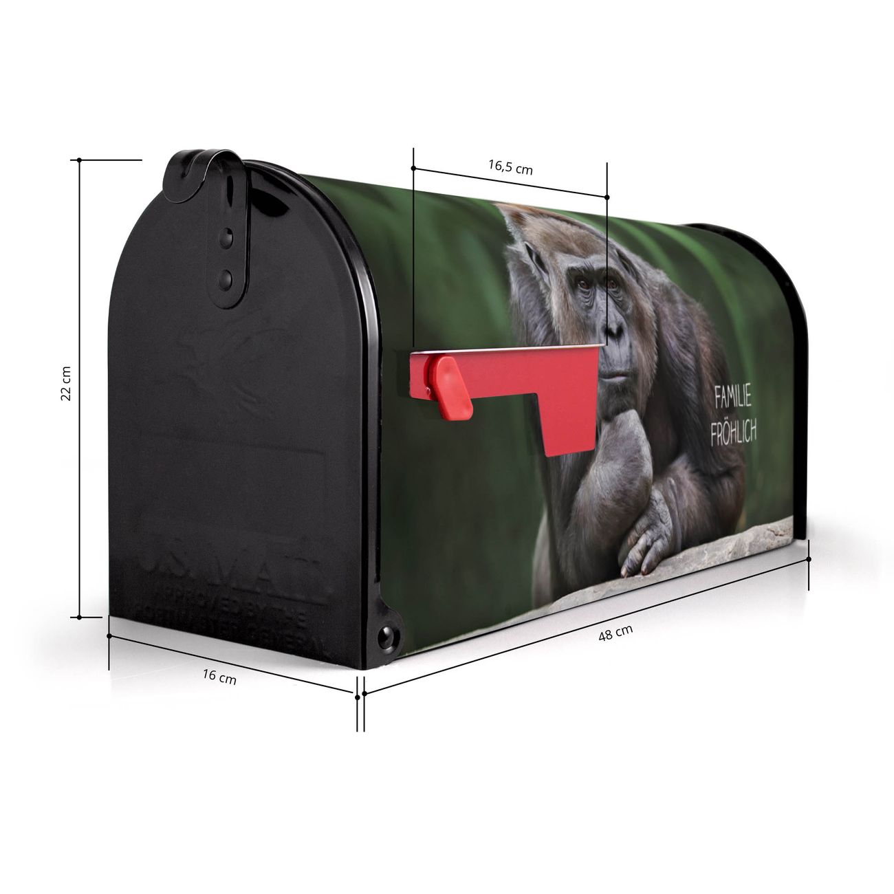 Der amerikanische Briefkasten von banjado mit Gorilla Motiv bietet Ihnen ausreichend Fassungsvermögen, um große A4 Sendungen und Zeitschriften zu empfangen. Die typisch amerikanische rote Fahne zeigt Ihnen an, wenn Sie Post erhalten haben. Die US-Mailbox besteht aus verzinktem Stahlblech welches lackiert wurde und ist 48 x 22 x 16 CM (BxHxT) groß. Die Folie mit Motiv Gorilla besteht aus einer wetter- und UV-resistenten Folie, die mit einem Schutzlaminat überzogen ist, sodass die US Mailbox zusätzlich vor Kratzern geschützt ist. An der Unterkante sind 4 Löcher je Seite um die Mailbox, typisch amerikanisch, an einem Holzpfahl oder einem Zaun zu befestigen. Auf Wunsch können Sie bei uns den passenden Standfuß oder die passende Wandhalterung kaufen um die US-Mailbox sicher zu befestigen. Wir bieten Ihnen ebenfalls Namensschilder, bereits beschriftet oder frei zu beschriften, und verschiedene selbst gestaltete Bitte-Keine-Werbung-Aufkleber.