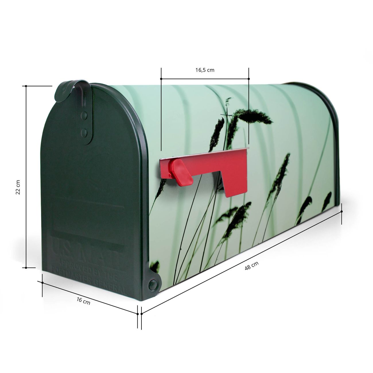 Der amerikanische Briefkasten von banjado mit Gräser Motiv bietet Ihnen ausreichend Fassungsvermögen, um große A4 Sendungen und Zeitschriften zu empfangen. Die typisch amerikanische rote Fahne zeigt Ihnen an, wenn Sie Post erhalten haben. Die US-Mailbox besteht aus verzinktem Stahlblech welches lackiert wurde und ist 48 x 22 x 16 CM (BxHxT) groß. Die Folie mit Motiv Gräser besteht aus einer wetter- und UV-resistenten Folie, die mit einem Schutzlaminat überzogen ist, sodass die US Mailbox zusätzlich vor Kratzern geschützt ist. An der Unterkante sind 4 Löcher je Seite um die Mailbox, typisch amerikanisch, an einem Holzpfahl oder einem Zaun zu befestigen. Auf Wunsch können Sie bei uns den passenden Standfuß oder die passende Wandhalterung kaufen um die US-Mailbox sicher zu befestigen. Wir bieten Ihnen ebenfalls Namensschilder, bereits beschriftet oder frei zu beschriften, und verschiedene selbst gestaltete Bitte-Keine-Werbung-Aufkleber.