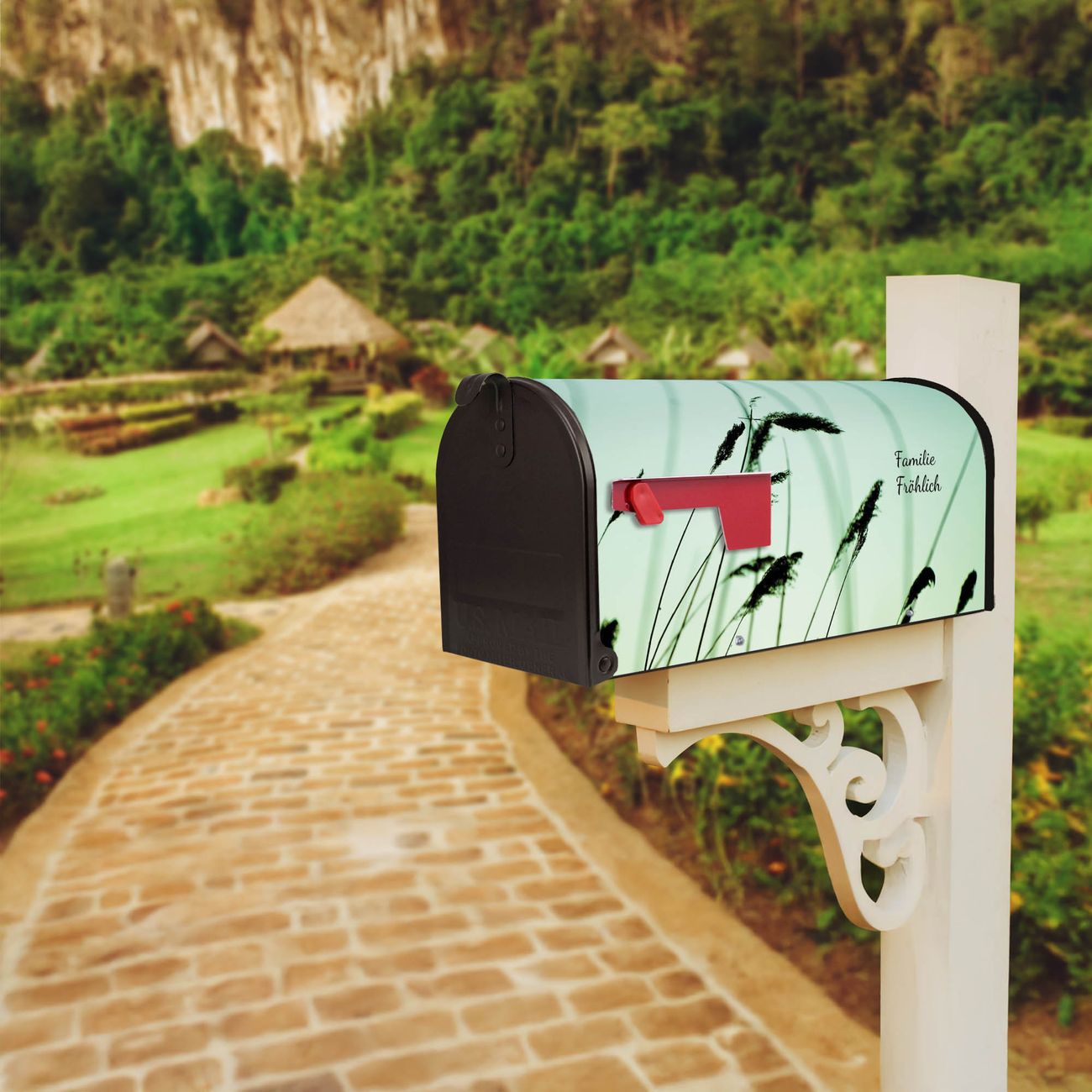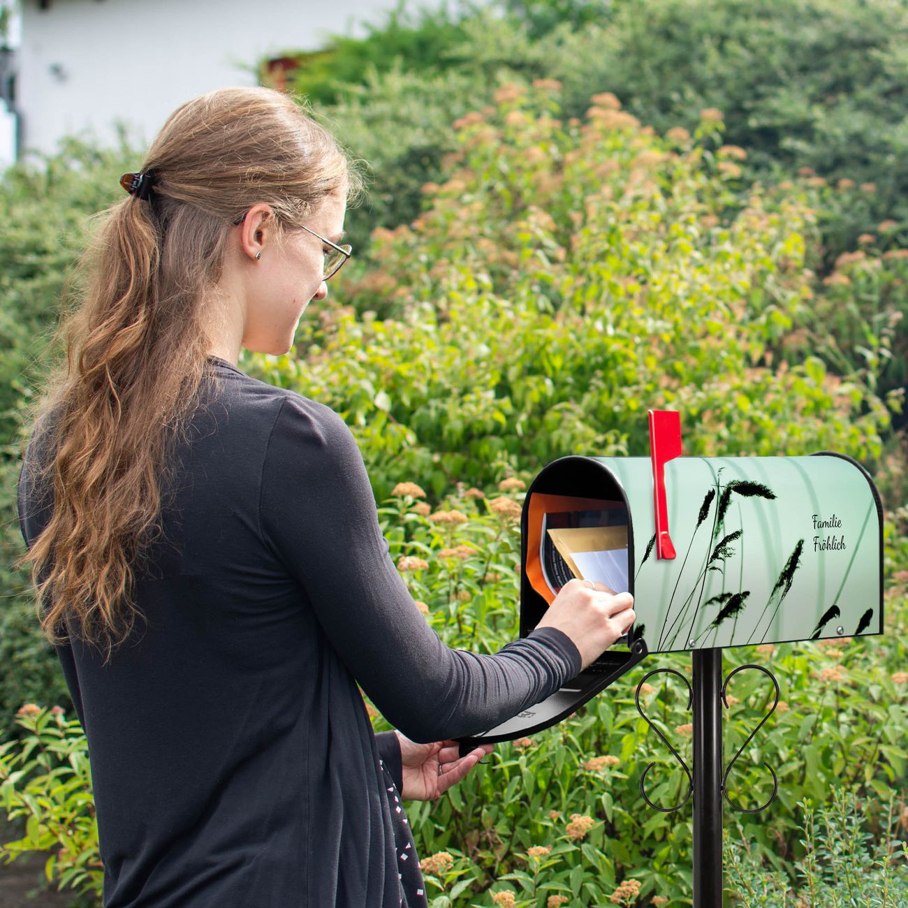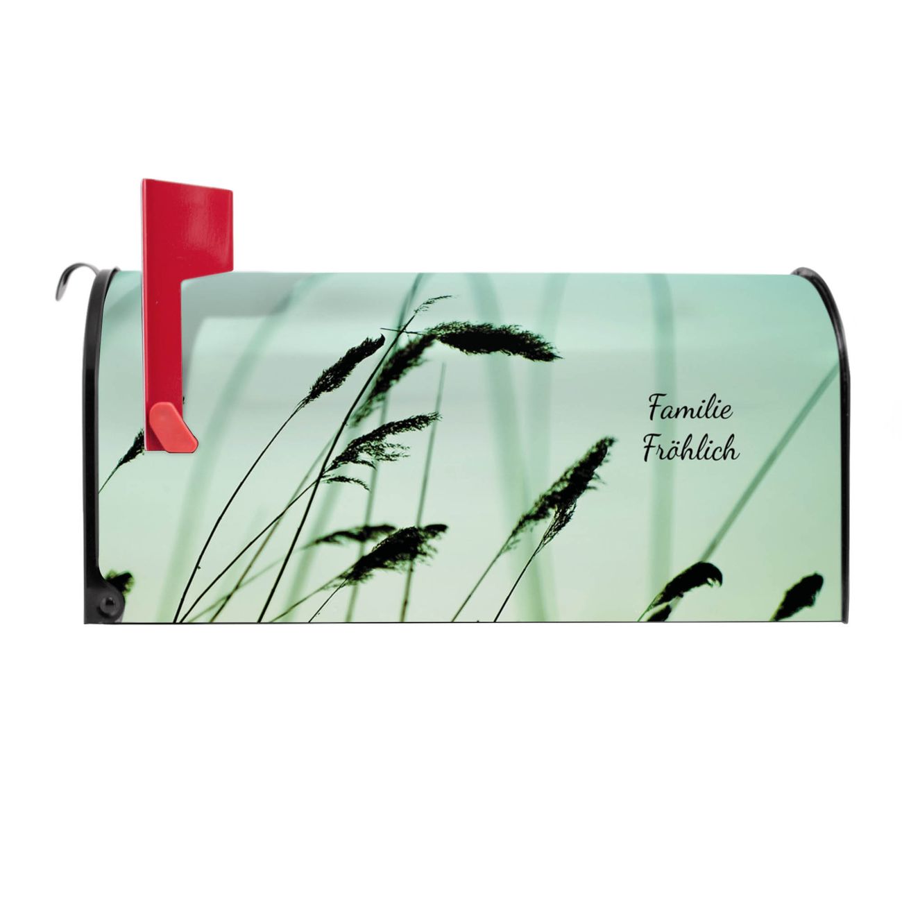 Der amerikanische Briefkasten von banjado mit Gräser Motiv bietet Ihnen ausreichend Fassungsvermögen, um große A4 Sendungen und Zeitschriften zu empfangen. Die typisch amerikanische rote Fahne zeigt Ihnen an, wenn Sie Post erhalten haben. Die US-Mailbox besteht aus verzinktem Stahlblech welches lackiert wurde und ist 48 x 22 x 16 CM (BxHxT) groß. Die Folie mit Motiv Gräser besteht aus einer wetter- und UV-resistenten Folie, die mit einem Schutzlaminat überzogen ist, sodass die US Mailbox zusätzlich vor Kratzern geschützt ist. An der Unterkante sind 4 Löcher je Seite um die Mailbox, typisch amerikanisch, an einem Holzpfahl oder einem Zaun zu befestigen. Auf Wunsch können Sie bei uns den passenden Standfuß oder die passende Wandhalterung kaufen um die US-Mailbox sicher zu befestigen. Wir bieten Ihnen ebenfalls Namensschilder, bereits beschriftet oder frei zu beschriften, und verschiedene selbst gestaltete Bitte-Keine-Werbung-Aufkleber.