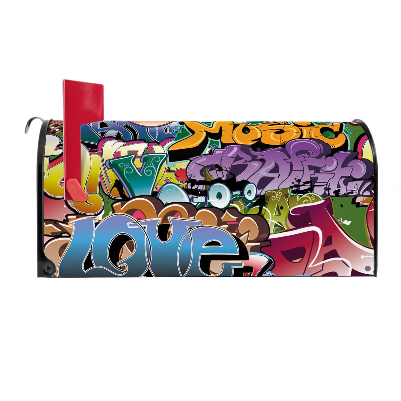 Der amerikanische Briefkasten von banjado mit Graffiti Motiv bietet Ihnen ausreichend Fassungsvermögen, um große A4 Sendungen und Zeitschriften zu empfangen. Die typisch amerikanische rote Fahne zeigt Ihnen an, wenn Sie Post erhalten haben. Die US-Mailbox besteht aus verzinktem Stahlblech welches lackiert wurde und ist 48 x 22 x 16 CM (BxHxT) groß. Die Folie mit Motiv Graffiti besteht aus einer wetter- und UV-resistenten Folie, die mit einem Schutzlaminat überzogen ist, sodass die US Mailbox zusätzlich vor Kratzern geschützt ist. An der Unterkante sind 4 Löcher je Seite um die Mailbox, typisch amerikanisch, an einem Holzpfahl oder einem Zaun zu befestigen. Auf Wunsch können Sie bei uns den passenden Standfuß oder die passende Wandhalterung kaufen um die US-Mailbox sicher zu befestigen. Wir bieten Ihnen ebenfalls Namensschilder, bereits beschriftet oder frei zu beschriften, und verschiedene selbst gestaltete Bitte-Keine-Werbung-Aufkleber.