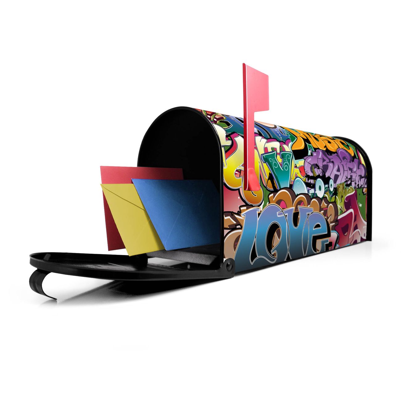 Unser amerikanischer Briefkasten mit dem Motiv Graffiti hat ein sehr ansprechendes und ausgefallenes Design, ist in der Grundfarbe weiß, grün oder schwarz erhältlich. Damit entlocken Sie Ihren Nachbarn und dem Postboten immer wieder ein Lächeln. Die Mailbox ist ein Original Import aus Mississippi USA und wird von unserer kleinen Manufaktur in Sachsen von Hand veredelt. Die US-Mailbox bietet ausreichend Platz auch für große Sendungen, eine Fahne die Ihnen Post anzeigt, wetterfestes und äußerst stabiles Material - so macht Post empfangen Freude.