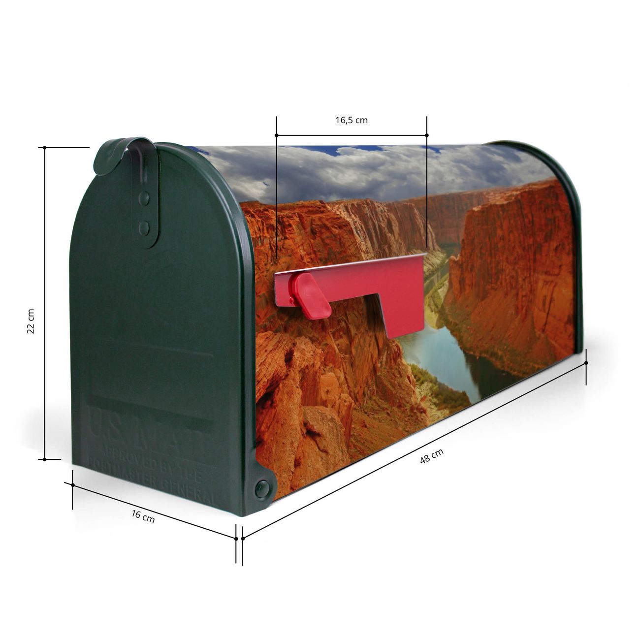 Der amerikanische Briefkasten von banjado mit Grand Canyon Motiv bietet Ihnen ausreichend Fassungsvermögen, um große A4 Sendungen und Zeitschriften zu empfangen. Die typisch amerikanische rote Fahne zeigt Ihnen an, wenn Sie Post erhalten haben. Die US-Mailbox besteht aus verzinktem Stahlblech welches lackiert wurde und ist 48 x 22 x 16 CM (BxHxT) groß. Die Folie mit Motiv Grand Canyon besteht aus einer wetter- und UV-resistenten Folie, die mit einem Schutzlaminat überzogen ist, sodass die US Mailbox zusätzlich vor Kratzern geschützt ist. An der Unterkante sind 4 Löcher je Seite um die Mailbox, typisch amerikanisch, an einem Holzpfahl oder einem Zaun zu befestigen. Auf Wunsch können Sie bei uns den passenden Standfuß oder die passende Wandhalterung kaufen um die US-Mailbox sicher zu befestigen. Wir bieten Ihnen ebenfalls Namensschilder, bereits beschriftet oder frei zu beschriften, und verschiedene selbst gestaltete Bitte-Keine-Werbung-Aufkleber.