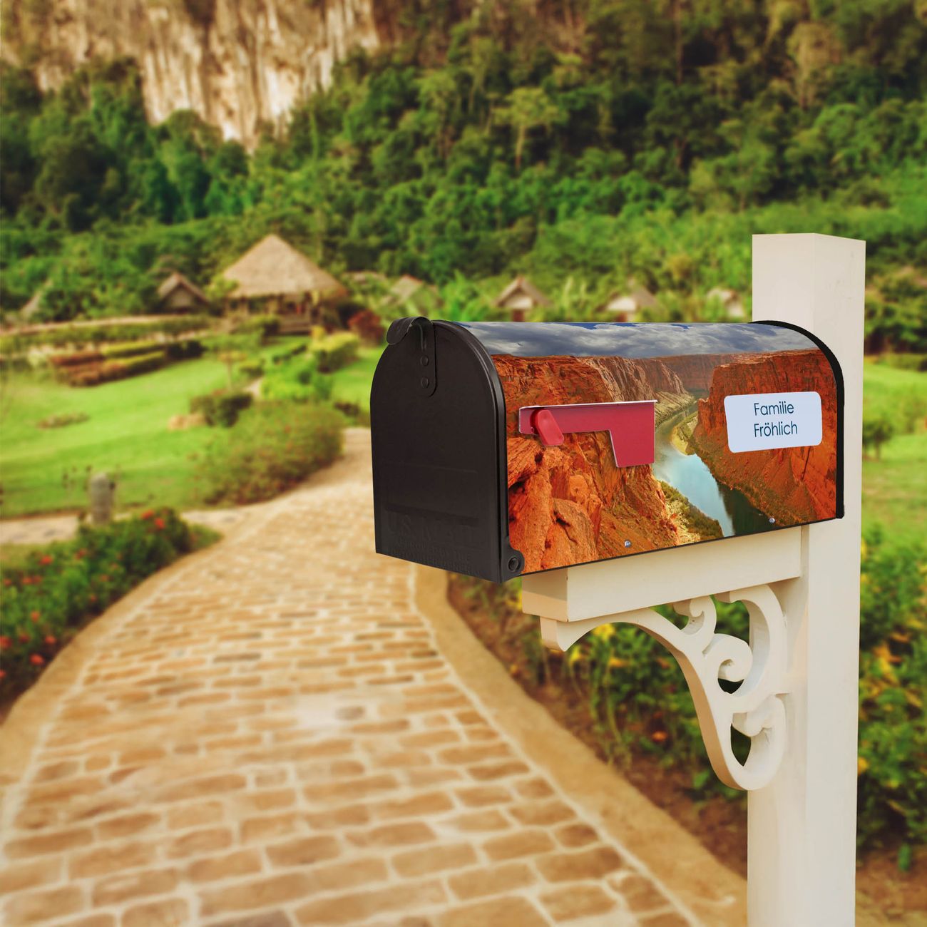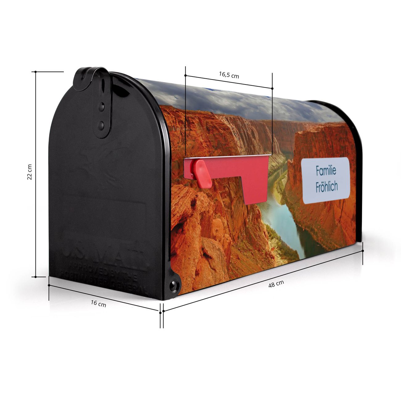 Der amerikanische Briefkasten von banjado mit Grand Canyon Motiv bietet Ihnen ausreichend Fassungsvermögen, um große A4 Sendungen und Zeitschriften zu empfangen. Die typisch amerikanische rote Fahne zeigt Ihnen an, wenn Sie Post erhalten haben. Die US-Mailbox besteht aus verzinktem Stahlblech welches lackiert wurde und ist 48 x 22 x 16 CM (BxHxT) groß. Die Folie mit Motiv Grand Canyon besteht aus einer wetter- und UV-resistenten Folie, die mit einem Schutzlaminat überzogen ist, sodass die US Mailbox zusätzlich vor Kratzern geschützt ist. An der Unterkante sind 4 Löcher je Seite um die Mailbox, typisch amerikanisch, an einem Holzpfahl oder einem Zaun zu befestigen. Auf Wunsch können Sie bei uns den passenden Standfuß oder die passende Wandhalterung kaufen um die US-Mailbox sicher zu befestigen. Wir bieten Ihnen ebenfalls Namensschilder, bereits beschriftet oder frei zu beschriften, und verschiedene selbst gestaltete Bitte-Keine-Werbung-Aufkleber.