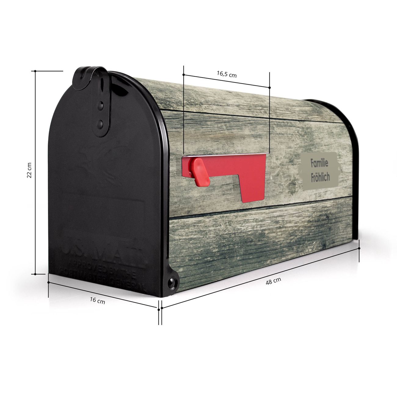 Der amerikanische Briefkasten von banjado mit Graue Planken Motiv bietet Ihnen ausreichend Fassungsvermögen, um große A4 Sendungen und Zeitschriften zu empfangen. Die typisch amerikanische rote Fahne zeigt Ihnen an, wenn Sie Post erhalten haben. Die US-Mailbox besteht aus verzinktem Stahlblech welches lackiert wurde und ist 48 x 22 x 16 CM (BxHxT) groß. Die Folie mit Motiv Graue Planken besteht aus einer wetter- und UV-resistenten Folie, die mit einem Schutzlaminat überzogen ist, sodass die US Mailbox zusätzlich vor Kratzern geschützt ist. An der Unterkante sind 4 Löcher je Seite um die Mailbox, typisch amerikanisch, an einem Holzpfahl oder einem Zaun zu befestigen. Auf Wunsch können Sie bei uns den passenden Standfuß oder die passende Wandhalterung kaufen um die US-Mailbox sicher zu befestigen. Wir bieten Ihnen ebenfalls Namensschilder, bereits beschriftet oder frei zu beschriften, und verschiedene selbst gestaltete Bitte-Keine-Werbung-Aufkleber.