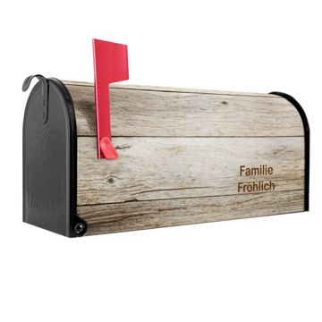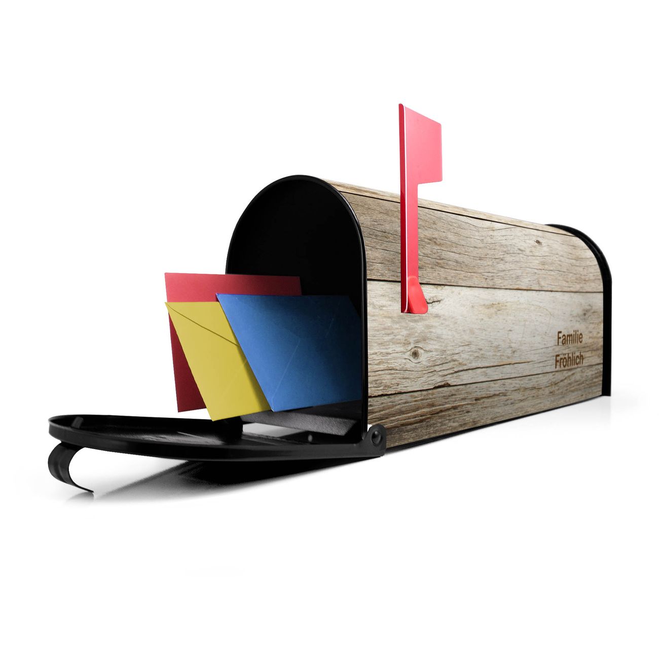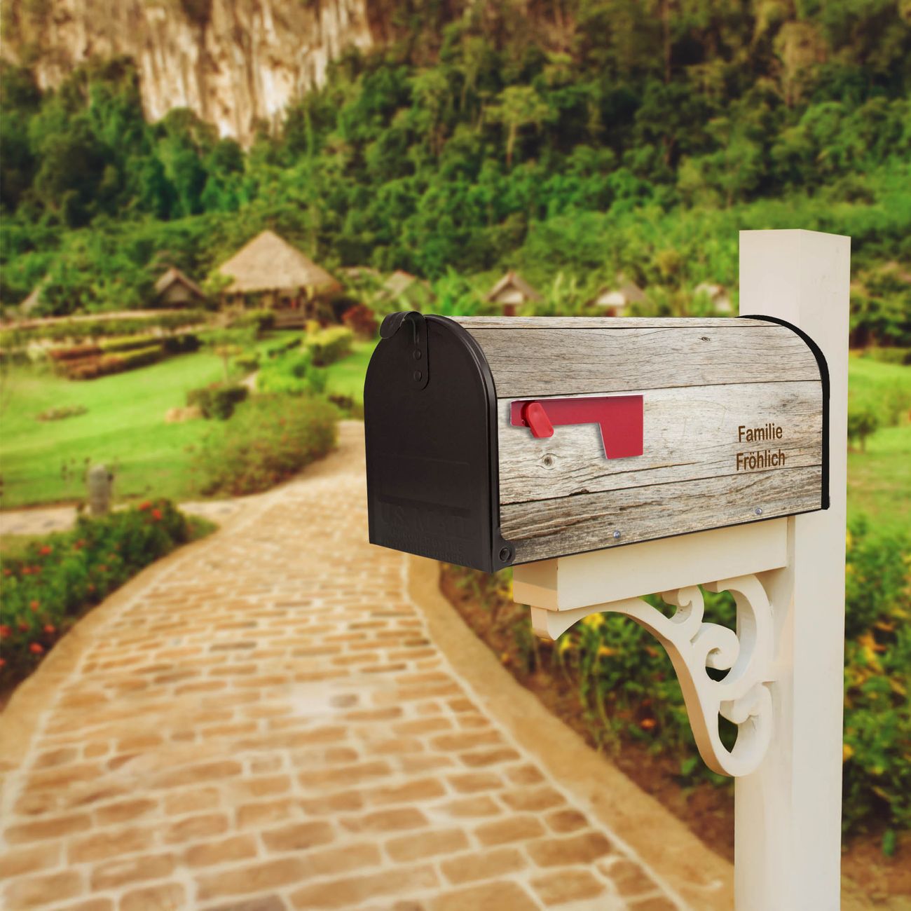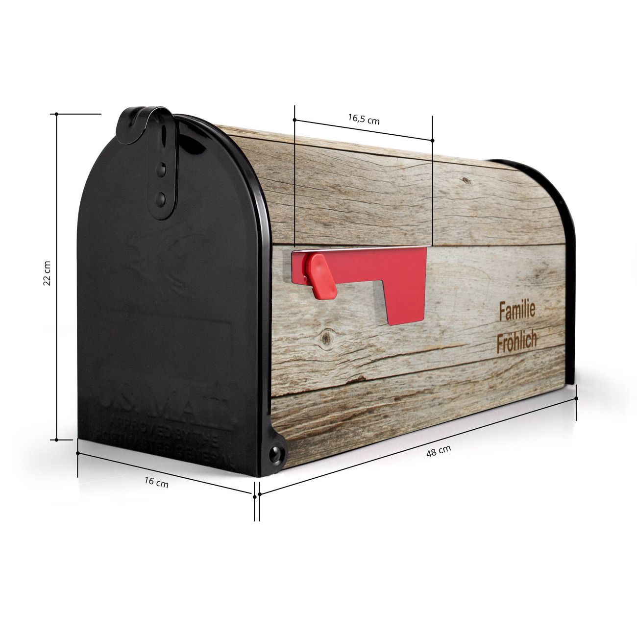Der amerikanische Briefkasten von banjado mit Graues Holz Motiv bietet Ihnen ausreichend Fassungsvermögen, um große A4 Sendungen und Zeitschriften zu empfangen. Die typisch amerikanische rote Fahne zeigt Ihnen an, wenn Sie Post erhalten haben. Die US-Mailbox besteht aus verzinktem Stahlblech welches lackiert wurde und ist 48 x 22 x 16 CM (BxHxT) groß. Die Folie mit Motiv Graues Holz besteht aus einer wetter- und UV-resistenten Folie, die mit einem Schutzlaminat überzogen ist, sodass die US Mailbox zusätzlich vor Kratzern geschützt ist. An der Unterkante sind 4 Löcher je Seite um die Mailbox, typisch amerikanisch, an einem Holzpfahl oder einem Zaun zu befestigen. Auf Wunsch können Sie bei uns den passenden Standfuß oder die passende Wandhalterung kaufen um die US-Mailbox sicher zu befestigen. Wir bieten Ihnen ebenfalls Namensschilder, bereits beschriftet oder frei zu beschriften, und verschiedene selbst gestaltete Bitte-Keine-Werbung-Aufkleber.