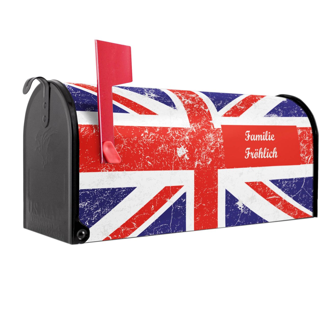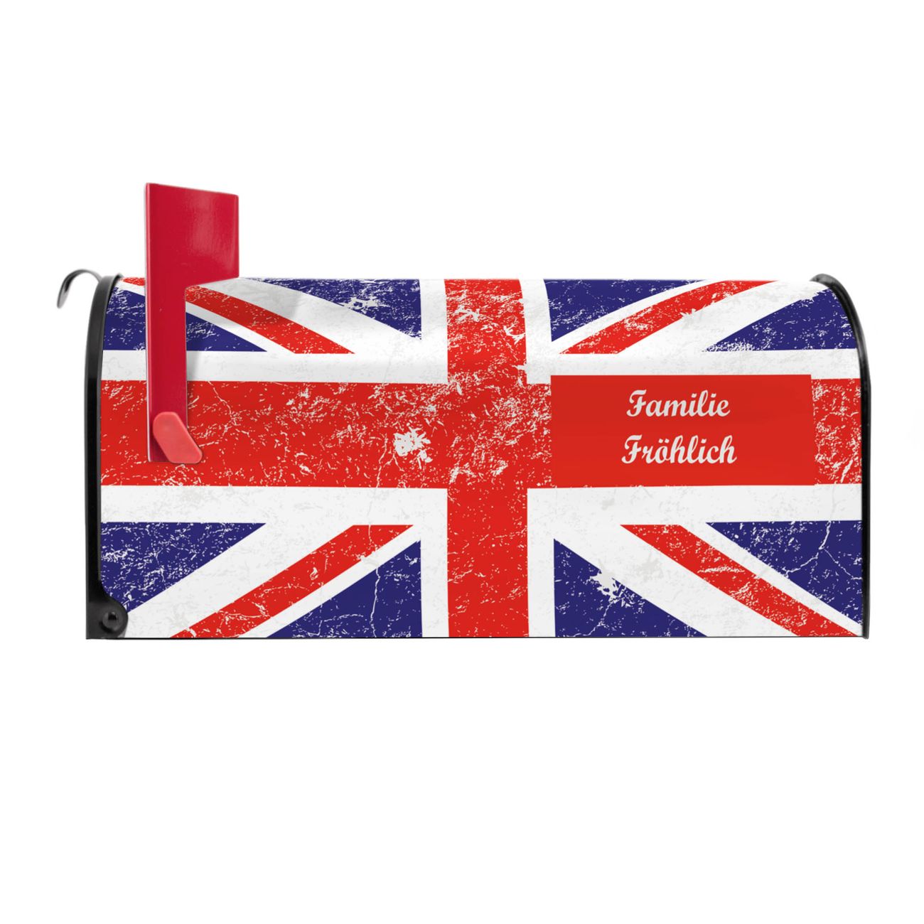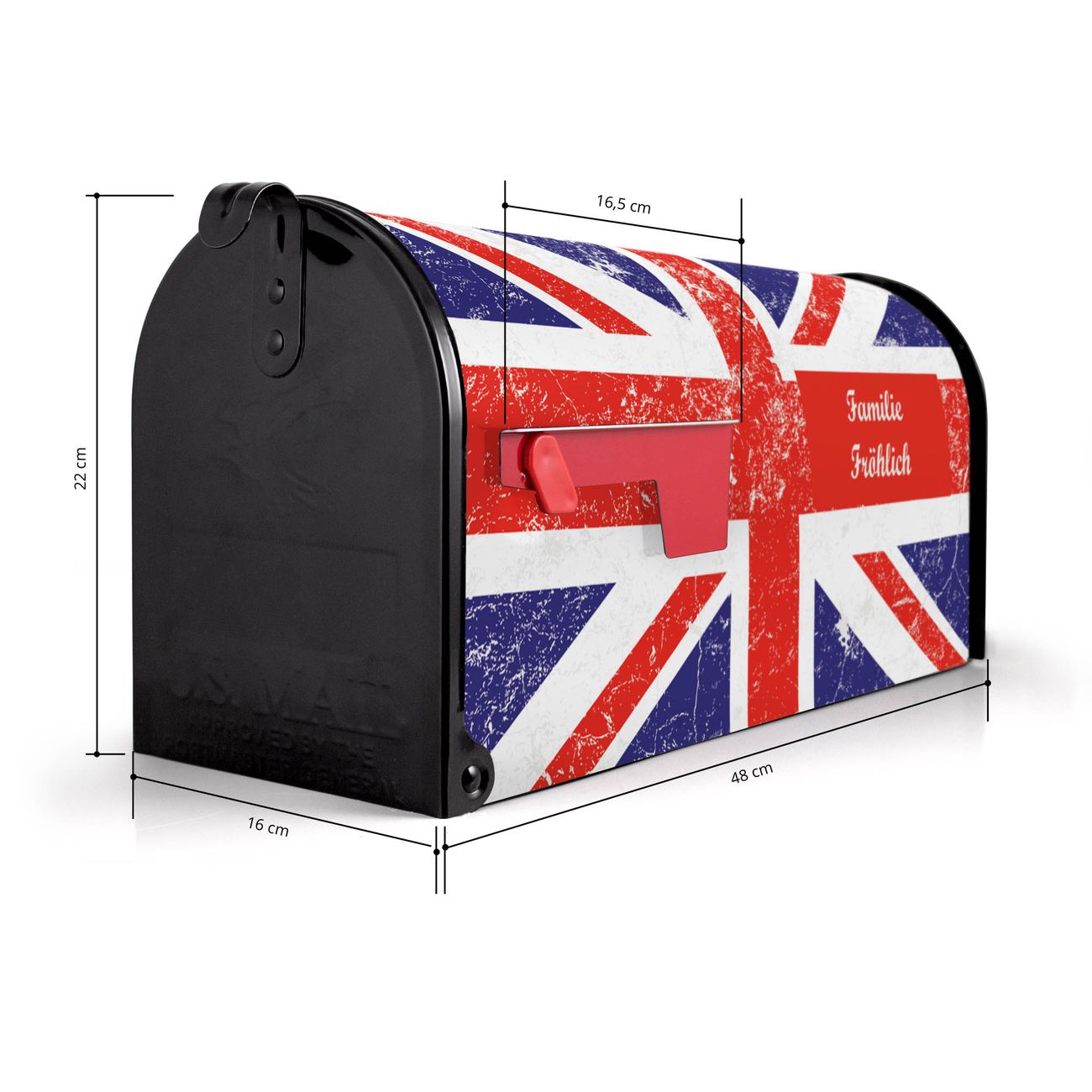 Der amerikanische Briefkasten von banjado mit Great Britain Motiv bietet Ihnen ausreichend Fassungsvermögen, um große A4 Sendungen und Zeitschriften zu empfangen. Die typisch amerikanische rote Fahne zeigt Ihnen an, wenn Sie Post erhalten haben. Die US-Mailbox besteht aus verzinktem Stahlblech welches lackiert wurde und ist 48 x 22 x 16 CM (BxHxT) groß. Die Folie mit Motiv Great Britain besteht aus einer wetter- und UV-resistenten Folie, die mit einem Schutzlaminat überzogen ist, sodass die US Mailbox zusätzlich vor Kratzern geschützt ist. An der Unterkante sind 4 Löcher je Seite um die Mailbox, typisch amerikanisch, an einem Holzpfahl oder einem Zaun zu befestigen. Auf Wunsch können Sie bei uns den passenden Standfuß oder die passende Wandhalterung kaufen um die US-Mailbox sicher zu befestigen. Wir bieten Ihnen ebenfalls Namensschilder, bereits beschriftet oder frei zu beschriften, und verschiedene selbst gestaltete Bitte-Keine-Werbung-Aufkleber.
