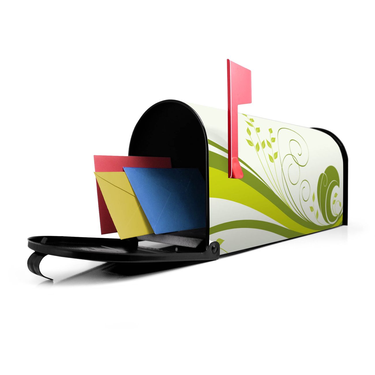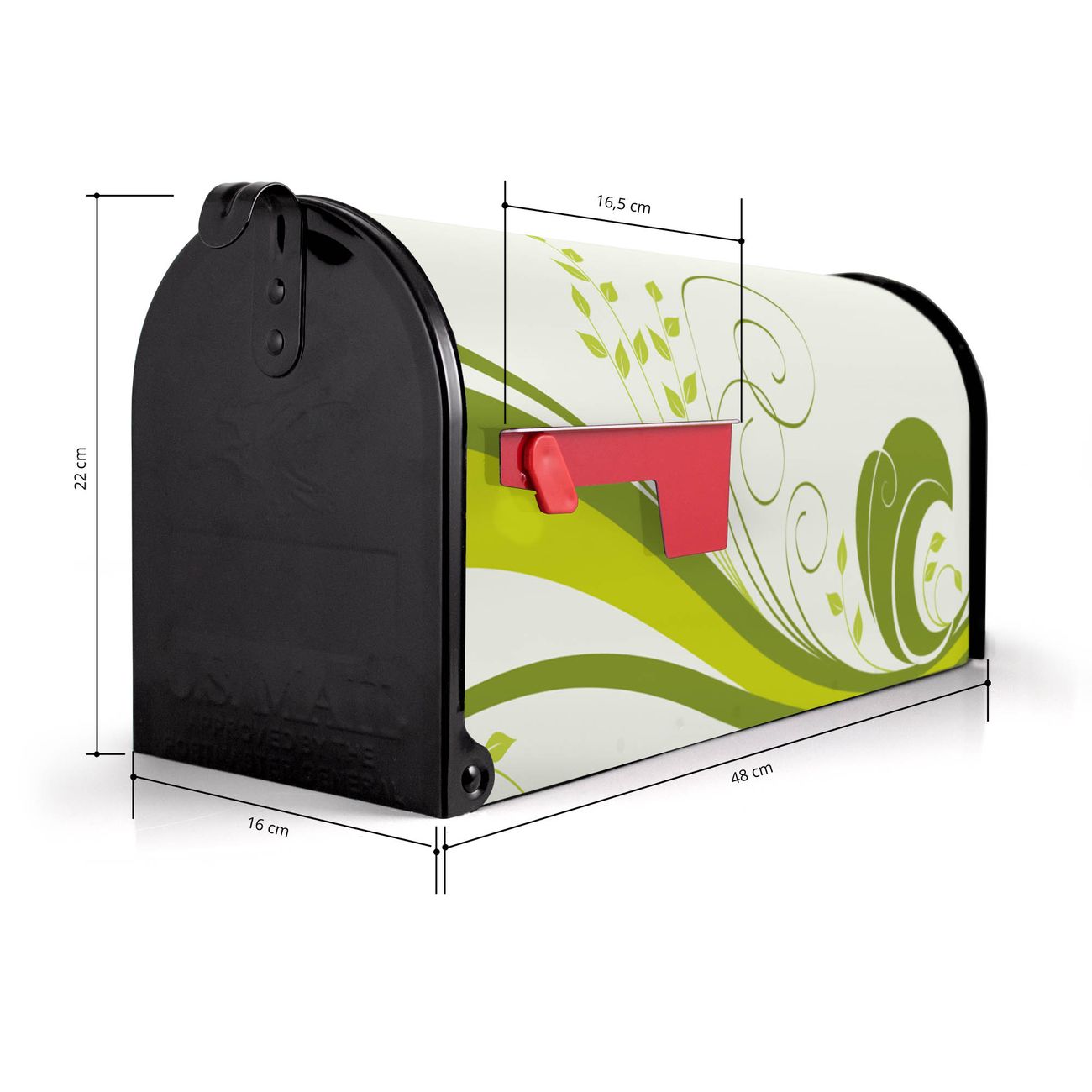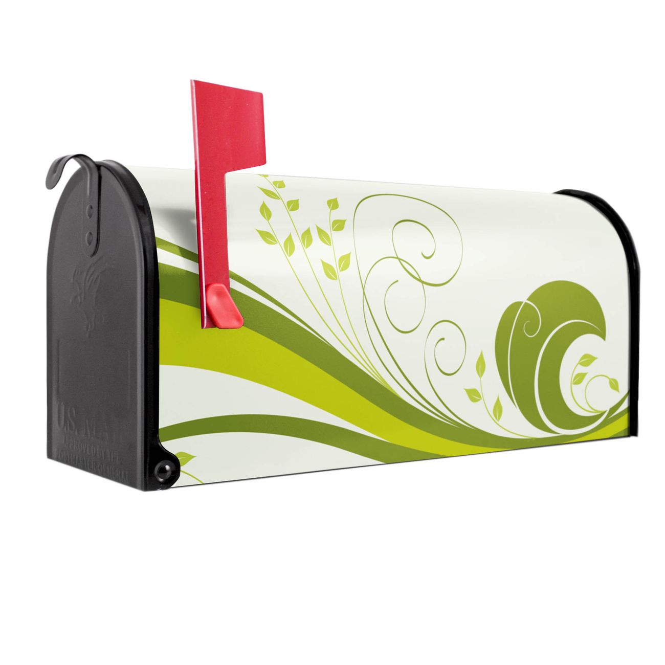 Der amerikanische Briefkasten von banjado mit Green Swirl Motiv bietet Ihnen ausreichend Fassungsvermögen, um große A4 Sendungen und Zeitschriften zu empfangen. Die typisch amerikanische rote Fahne zeigt Ihnen an, wenn Sie Post erhalten haben. Die US-Mailbox besteht aus verzinktem Stahlblech welches lackiert wurde und ist 48 x 22 x 16 CM (BxHxT) groß. Die Folie mit Motiv Green Swirl besteht aus einer wetter- und UV-resistenten Folie, die mit einem Schutzlaminat überzogen ist, sodass die US Mailbox zusätzlich vor Kratzern geschützt ist. An der Unterkante sind 4 Löcher je Seite um die Mailbox, typisch amerikanisch, an einem Holzpfahl oder einem Zaun zu befestigen. Auf Wunsch können Sie bei uns den passenden Standfuß oder die passende Wandhalterung kaufen um die US-Mailbox sicher zu befestigen. Wir bieten Ihnen ebenfalls Namensschilder, bereits beschriftet oder frei zu beschriften, und verschiedene selbst gestaltete Bitte-Keine-Werbung-Aufkleber.