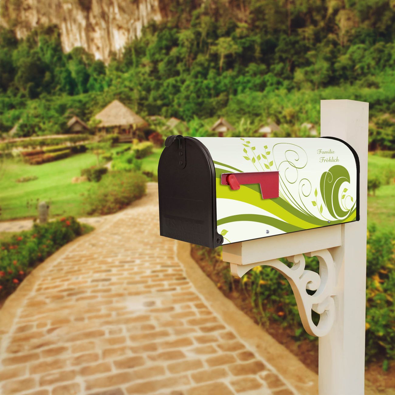 Der amerikanische Briefkasten von banjado mit Green Swirl Motiv bietet Ihnen ausreichend Fassungsvermögen, um große A4 Sendungen und Zeitschriften zu empfangen. Die typisch amerikanische rote Fahne zeigt Ihnen an, wenn Sie Post erhalten haben. Die US-Mailbox besteht aus verzinktem Stahlblech welches lackiert wurde und ist 48 x 22 x 16 CM (BxHxT) groß. Die Folie mit Motiv Green Swirl besteht aus einer wetter- und UV-resistenten Folie, die mit einem Schutzlaminat überzogen ist, sodass die US Mailbox zusätzlich vor Kratzern geschützt ist. An der Unterkante sind 4 Löcher je Seite um die Mailbox, typisch amerikanisch, an einem Holzpfahl oder einem Zaun zu befestigen. Auf Wunsch können Sie bei uns den passenden Standfuß oder die passende Wandhalterung kaufen um die US-Mailbox sicher zu befestigen. Wir bieten Ihnen ebenfalls Namensschilder, bereits beschriftet oder frei zu beschriften, und verschiedene selbst gestaltete Bitte-Keine-Werbung-Aufkleber.