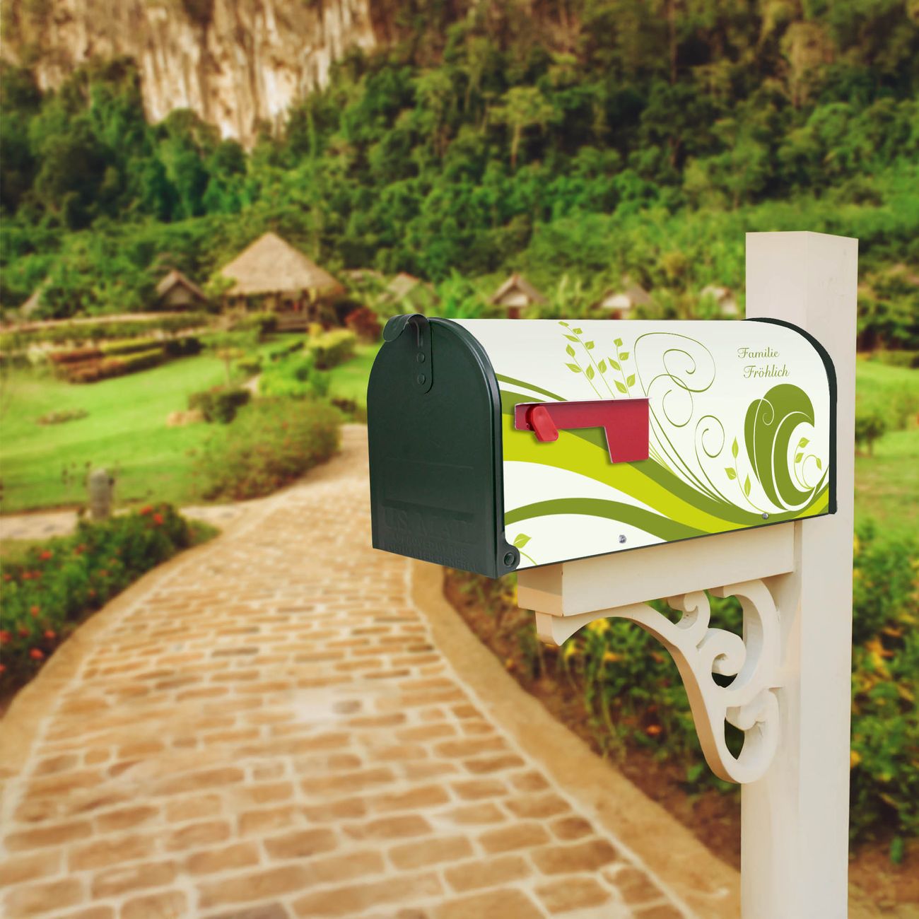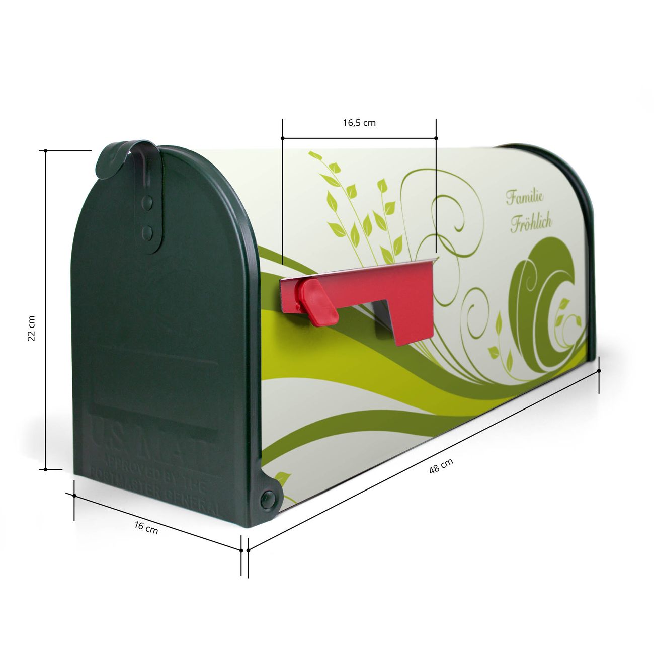 Der amerikanische Briefkasten von banjado mit WT Green Swirl Motiv bietet Ihnen ausreichend Fassungsvermögen, um große A4 Sendungen und Zeitschriften zu empfangen. Die typisch amerikanische rote Fahne zeigt Ihnen an, wenn Sie Post erhalten haben. Die US-Mailbox besteht aus verzinktem Stahlblech welches lackiert wurde und ist 48 x 22 x 16 CM (BxHxT) groß. Die Folie mit Motiv WT Green Swirl besteht aus einer wetter- und UV-resistenten Folie, die mit einem Schutzlaminat überzogen ist, sodass die US Mailbox zusätzlich vor Kratzern geschützt ist. An der Unterkante sind 4 Löcher je Seite um die Mailbox, typisch amerikanisch, an einem Holzpfahl oder einem Zaun zu befestigen. Auf Wunsch können Sie bei uns den passenden Standfuß oder die passende Wandhalterung kaufen um die US-Mailbox sicher zu befestigen. Wir bieten Ihnen ebenfalls Namensschilder, bereits beschriftet oder frei zu beschriften, und verschiedene selbst gestaltete Bitte-Keine-Werbung-Aufkleber.