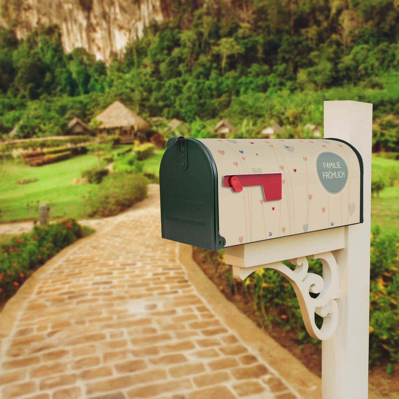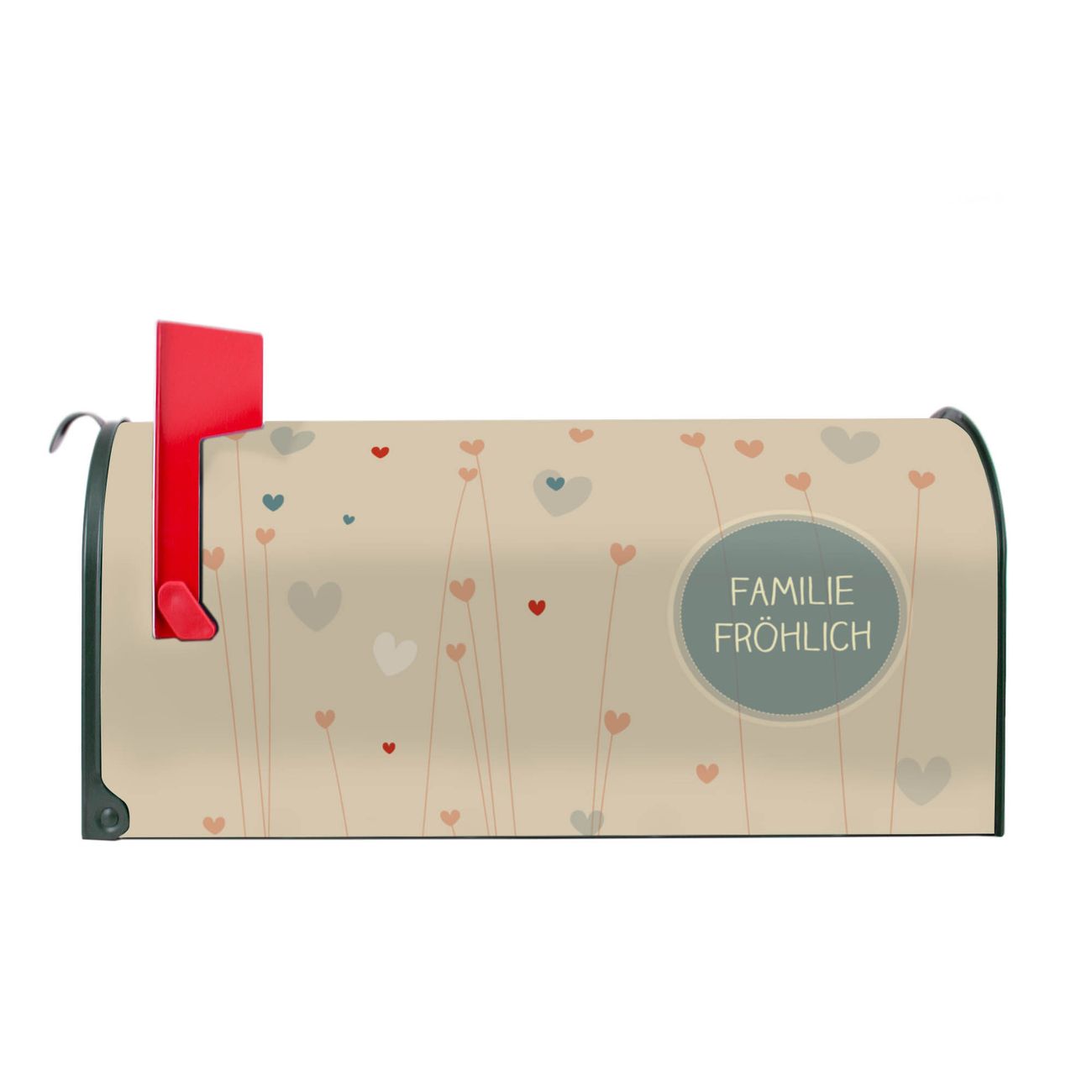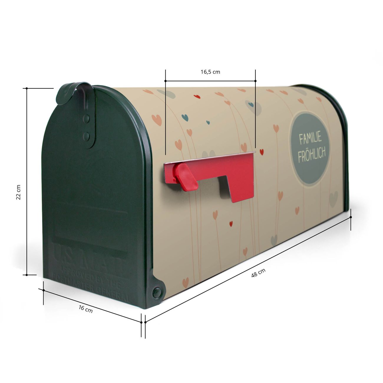 Der amerikanische Briefkasten von banjado mit WT Große Liebe Motiv bietet Ihnen ausreichend Fassungsvermögen, um große A4 Sendungen und Zeitschriften zu empfangen. Die typisch amerikanische rote Fahne zeigt Ihnen an, wenn Sie Post erhalten haben. Die US-Mailbox besteht aus verzinktem Stahlblech welches lackiert wurde und ist 48 x 22 x 16 CM (BxHxT) groß. Die Folie mit Motiv WT Große Liebe besteht aus einer wetter- und UV-resistenten Folie, die mit einem Schutzlaminat überzogen ist, sodass die US Mailbox zusätzlich vor Kratzern geschützt ist. An der Unterkante sind 4 Löcher je Seite um die Mailbox, typisch amerikanisch, an einem Holzpfahl oder einem Zaun zu befestigen. Auf Wunsch können Sie bei uns den passenden Standfuß oder die passende Wandhalterung kaufen um die US-Mailbox sicher zu befestigen. Wir bieten Ihnen ebenfalls Namensschilder, bereits beschriftet oder frei zu beschriften, und verschiedene selbst gestaltete Bitte-Keine-Werbung-Aufkleber.