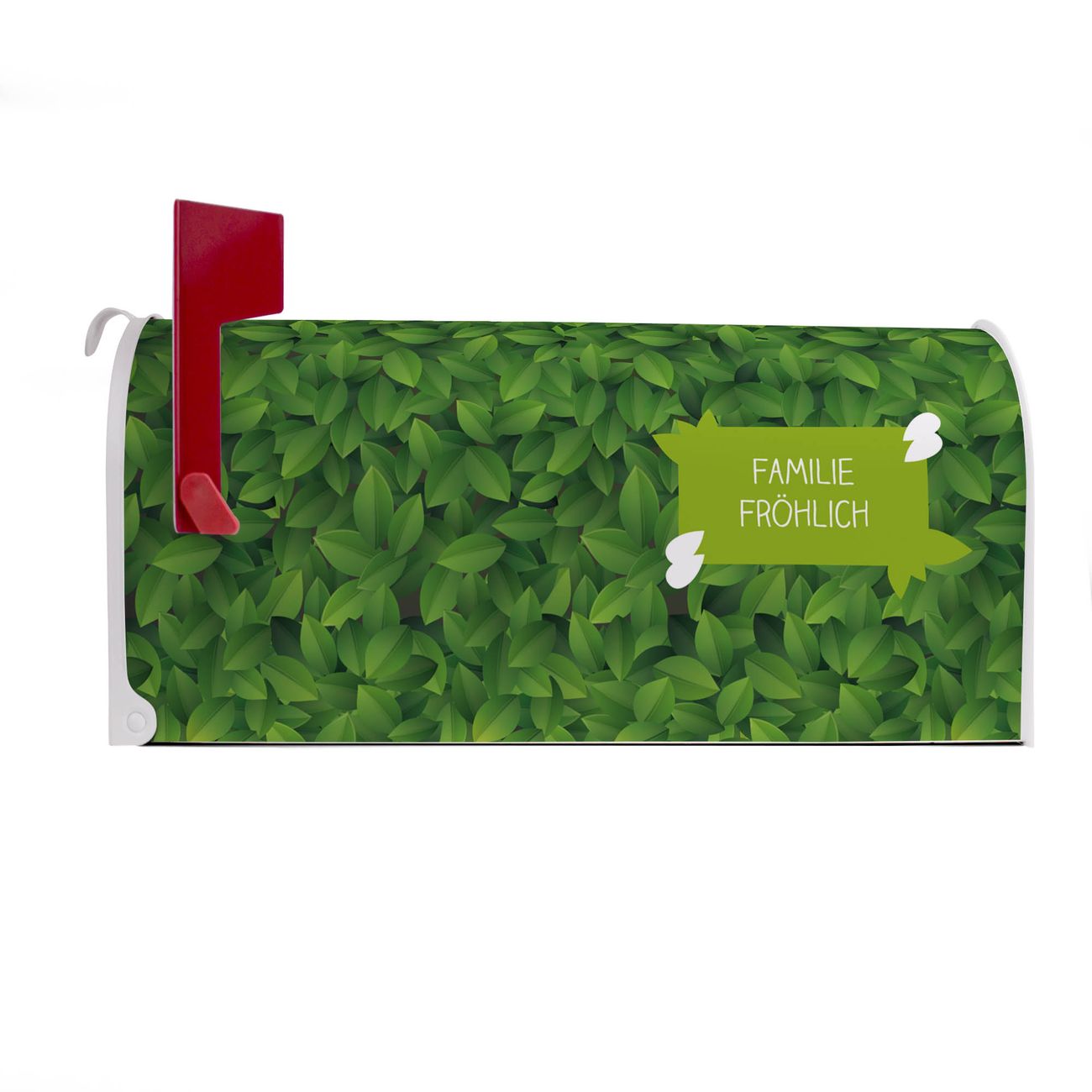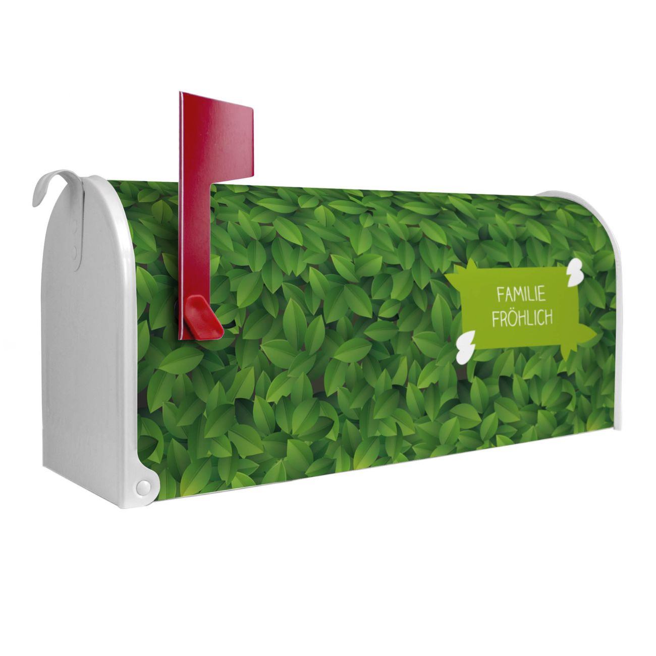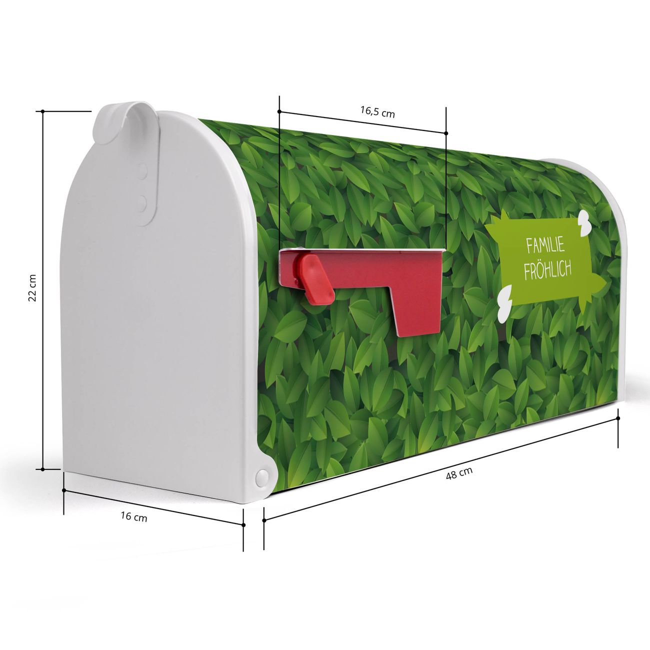 Der amerikanische Briefkasten von banjado mit WT Grüne Blätter Motiv bietet Ihnen ausreichend Fassungsvermögen, um große A4 Sendungen und Zeitschriften zu empfangen. Die typisch amerikanische rote Fahne zeigt Ihnen an, wenn Sie Post erhalten haben. Die US-Mailbox besteht aus verzinktem Stahlblech welches lackiert wurde und ist 48 x 22 x 16 CM (BxHxT) groß. Die Folie mit Motiv WT Grüne Blätter besteht aus einer wetter- und UV-resistenten Folie, die mit einem Schutzlaminat überzogen ist, sodass die US Mailbox zusätzlich vor Kratzern geschützt ist. An der Unterkante sind 4 Löcher je Seite um die Mailbox, typisch amerikanisch, an einem Holzpfahl oder einem Zaun zu befestigen. Auf Wunsch können Sie bei uns den passenden Standfuß oder die passende Wandhalterung kaufen um die US-Mailbox sicher zu befestigen. Wir bieten Ihnen ebenfalls Namensschilder, bereits beschriftet oder frei zu beschriften, und verschiedene selbst gestaltete Bitte-Keine-Werbung-Aufkleber.