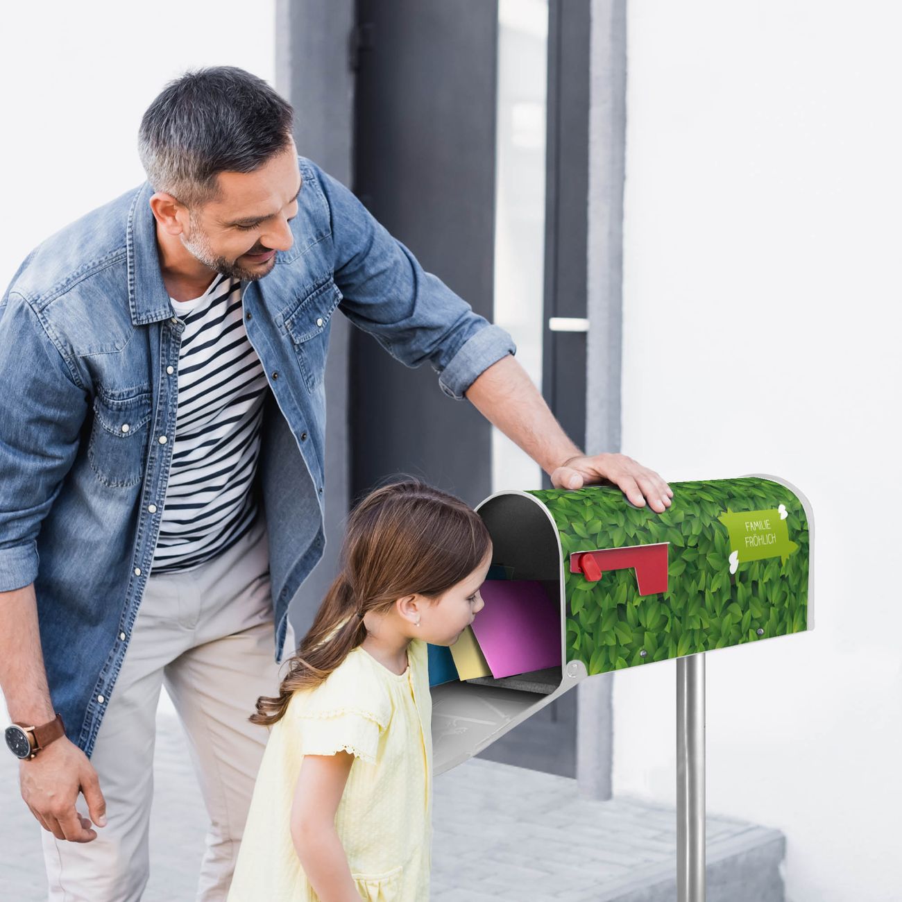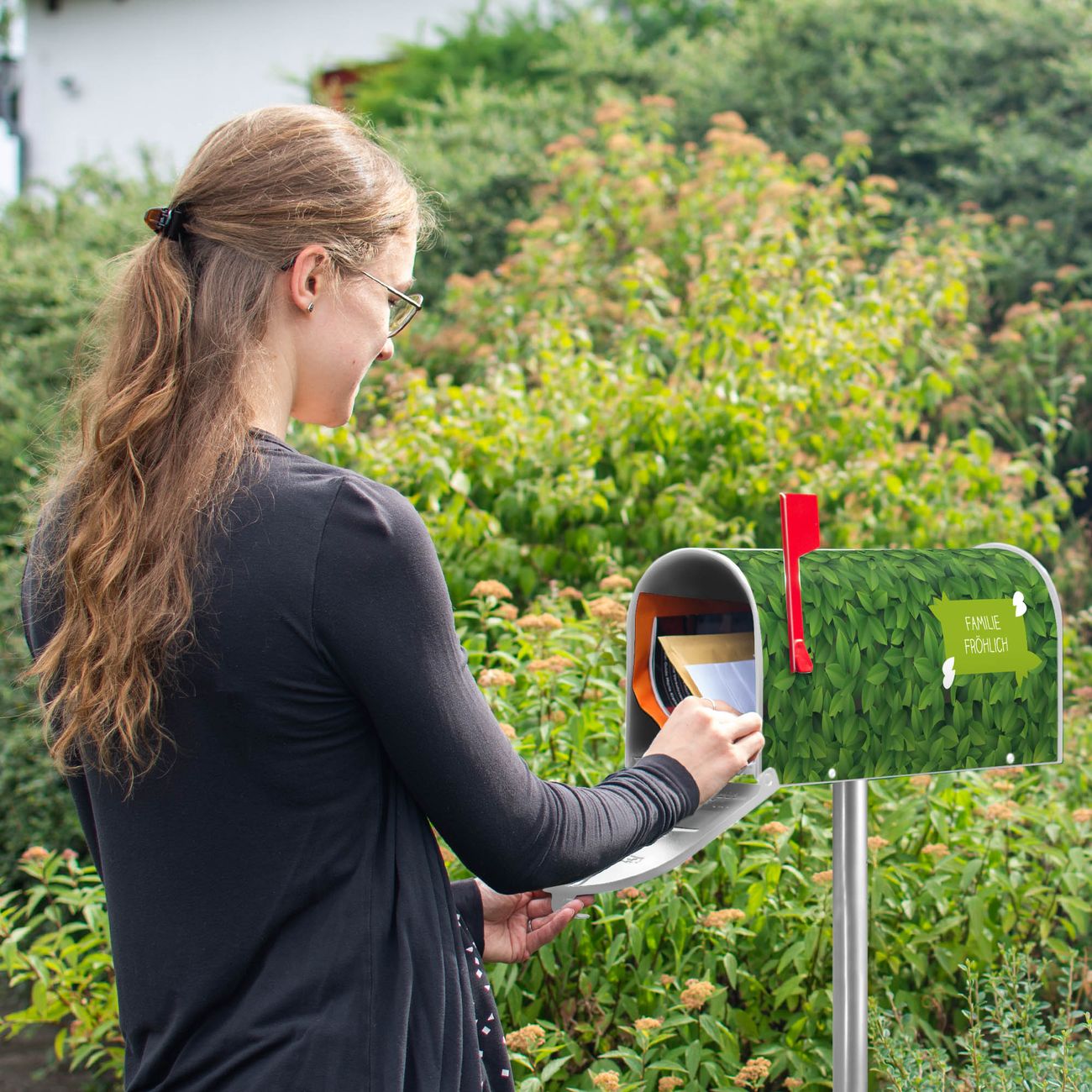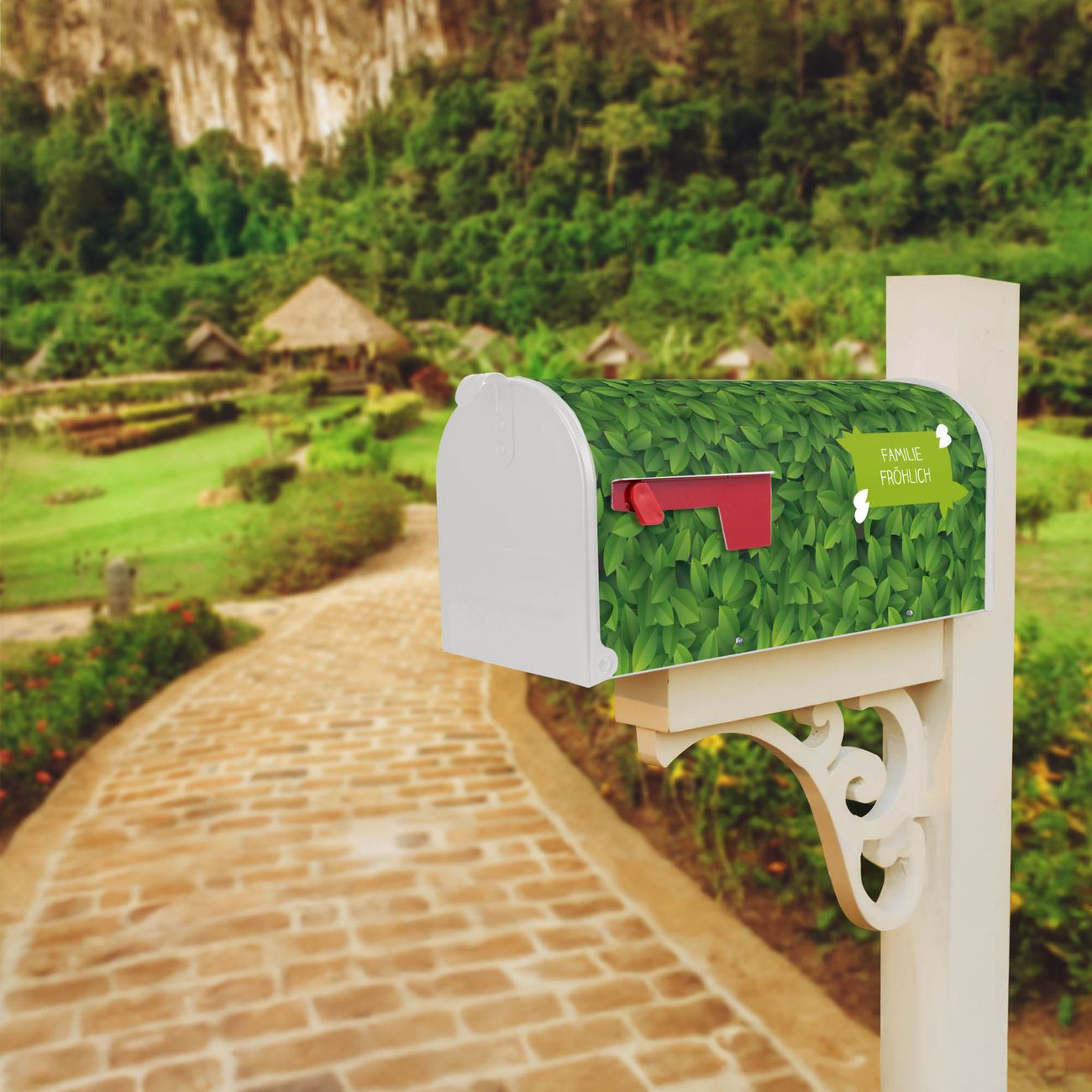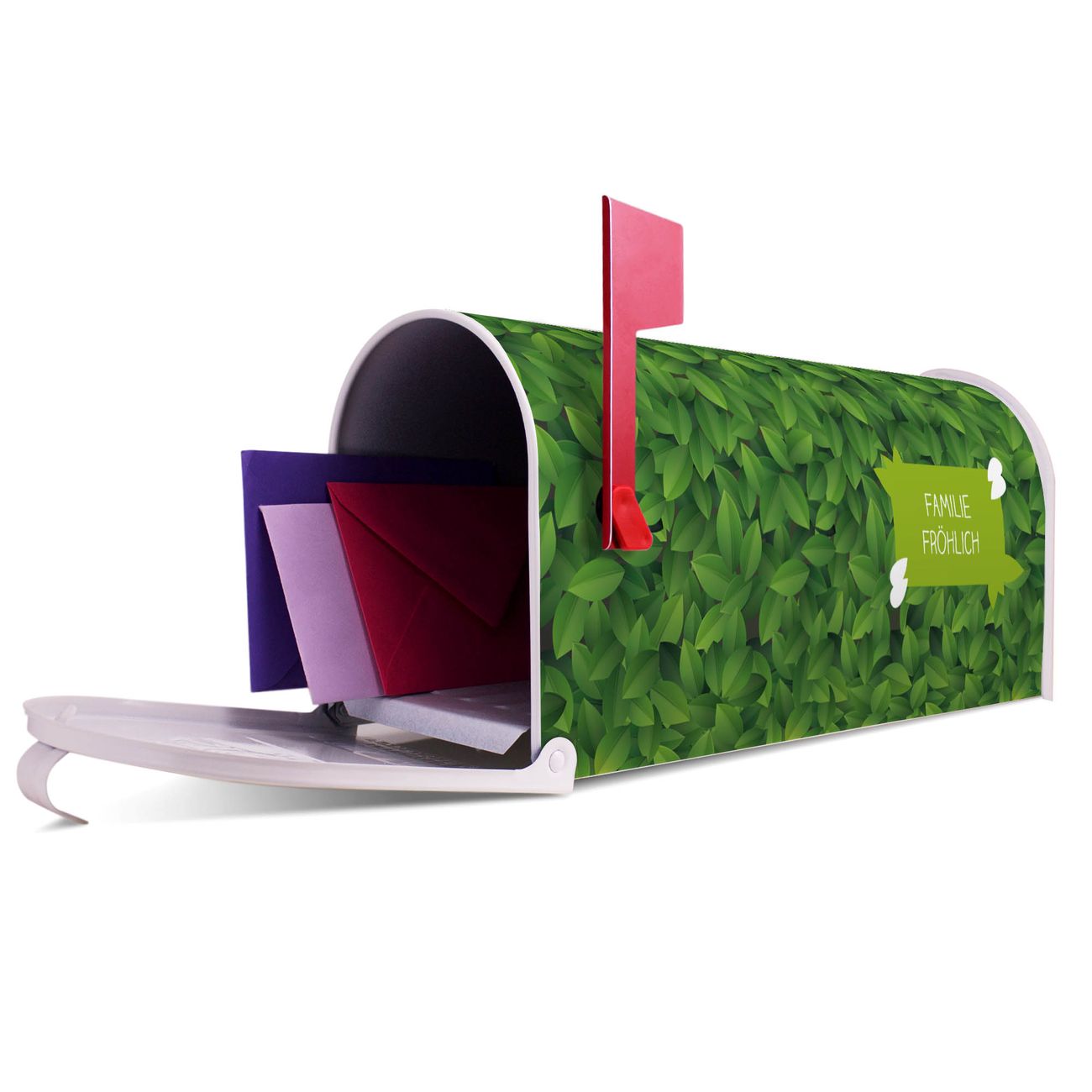 Der amerikanische Briefkasten von banjado mit WT Grüne Blätter Motiv bietet Ihnen ausreichend Fassungsvermögen, um große A4 Sendungen und Zeitschriften zu empfangen. Die typisch amerikanische rote Fahne zeigt Ihnen an, wenn Sie Post erhalten haben. Die US-Mailbox besteht aus verzinktem Stahlblech welches lackiert wurde und ist 48 x 22 x 16 CM (BxHxT) groß. Die Folie mit Motiv WT Grüne Blätter besteht aus einer wetter- und UV-resistenten Folie, die mit einem Schutzlaminat überzogen ist, sodass die US Mailbox zusätzlich vor Kratzern geschützt ist. An der Unterkante sind 4 Löcher je Seite um die Mailbox, typisch amerikanisch, an einem Holzpfahl oder einem Zaun zu befestigen. Auf Wunsch können Sie bei uns den passenden Standfuß oder die passende Wandhalterung kaufen um die US-Mailbox sicher zu befestigen. Wir bieten Ihnen ebenfalls Namensschilder, bereits beschriftet oder frei zu beschriften, und verschiedene selbst gestaltete Bitte-Keine-Werbung-Aufkleber.