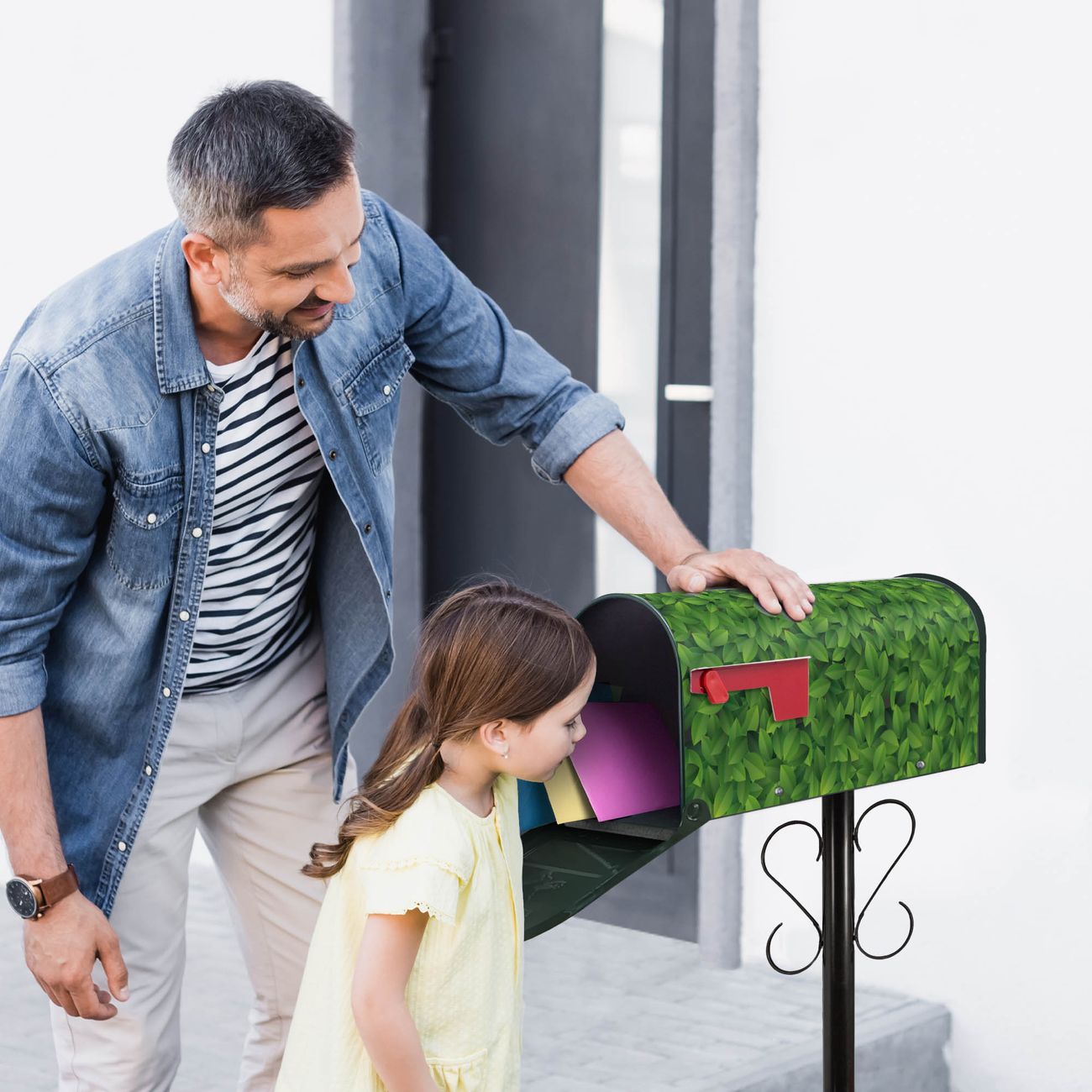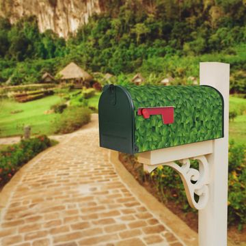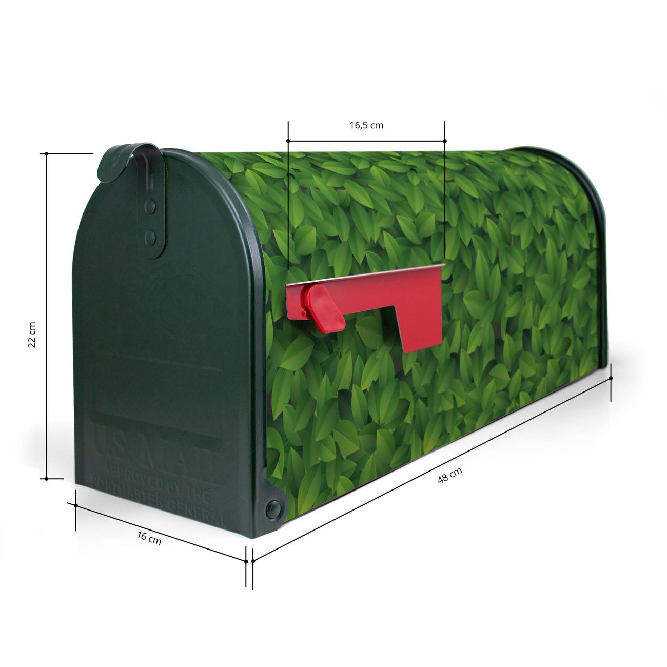 Der amerikanische Briefkasten von banjado mit Grüne Blätter Motiv bietet Ihnen ausreichend Fassungsvermögen, um große A4 Sendungen und Zeitschriften zu empfangen. Die typisch amerikanische rote Fahne zeigt Ihnen an, wenn Sie Post erhalten haben. Die US-Mailbox besteht aus verzinktem Stahlblech welches lackiert wurde und ist 48 x 22 x 16 CM (BxHxT) groß. Die Folie mit Motiv Grüne Blätter besteht aus einer wetter- und UV-resistenten Folie, die mit einem Schutzlaminat überzogen ist, sodass die US Mailbox zusätzlich vor Kratzern geschützt ist. An der Unterkante sind 4 Löcher je Seite um die Mailbox, typisch amerikanisch, an einem Holzpfahl oder einem Zaun zu befestigen. Auf Wunsch können Sie bei uns den passenden Standfuß oder die passende Wandhalterung kaufen um die US-Mailbox sicher zu befestigen. Wir bieten Ihnen ebenfalls Namensschilder, bereits beschriftet oder frei zu beschriften, und verschiedene selbst gestaltete Bitte-Keine-Werbung-Aufkleber.