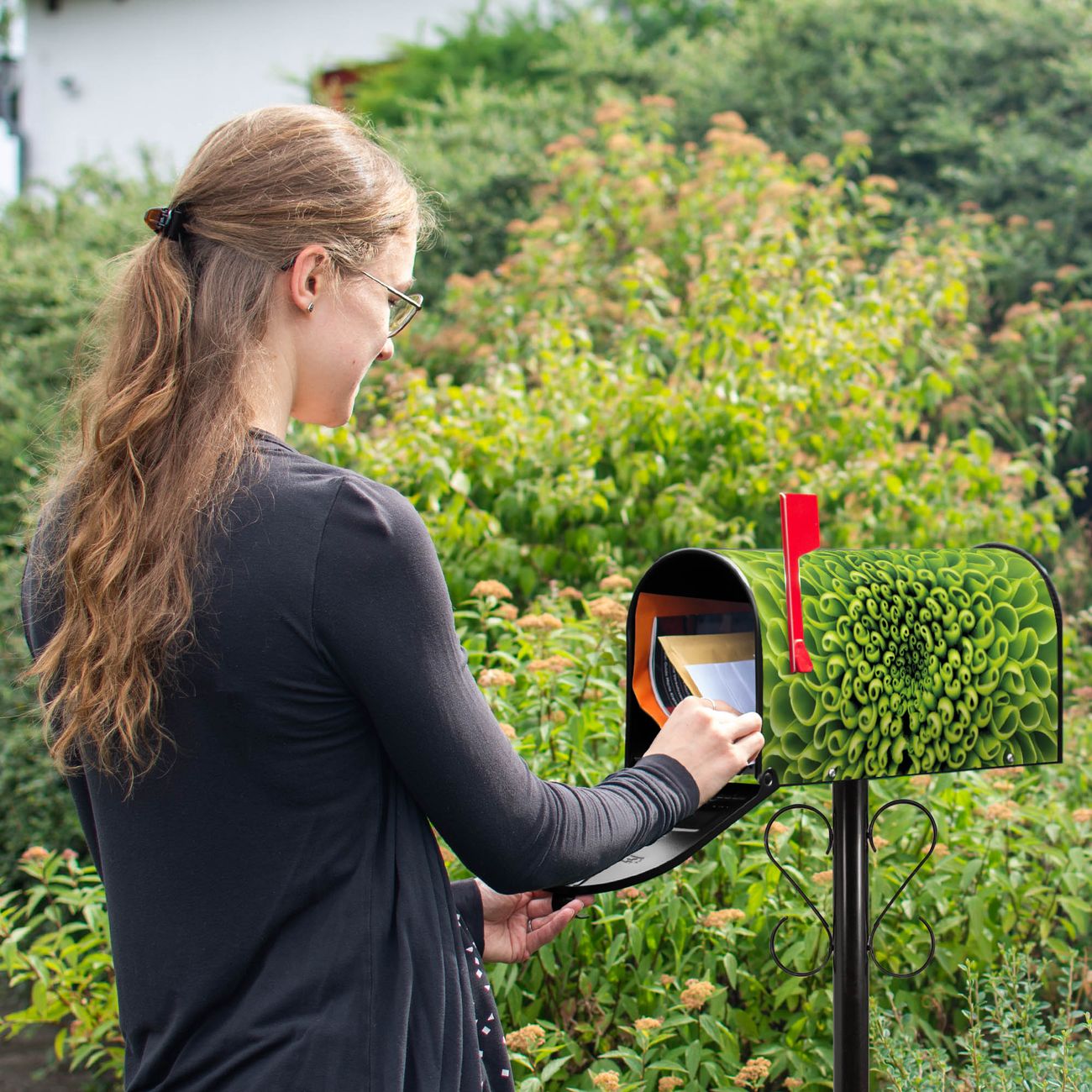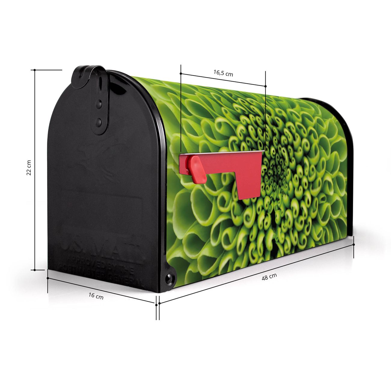 Der amerikanische Briefkasten von banjado mit Grüne Chrysantheme Motiv bietet Ihnen ausreichend Fassungsvermögen, um große A4 Sendungen und Zeitschriften zu empfangen. Die typisch amerikanische rote Fahne zeigt Ihnen an, wenn Sie Post erhalten haben. Die US-Mailbox besteht aus verzinktem Stahlblech welches lackiert wurde und ist 48 x 22 x 16 CM (BxHxT) groß. Die Folie mit Motiv Grüne Chrysantheme besteht aus einer wetter- und UV-resistenten Folie, die mit einem Schutzlaminat überzogen ist, sodass die US Mailbox zusätzlich vor Kratzern geschützt ist. An der Unterkante sind 4 Löcher je Seite um die Mailbox, typisch amerikanisch, an einem Holzpfahl oder einem Zaun zu befestigen. Auf Wunsch können Sie bei uns den passenden Standfuß oder die passende Wandhalterung kaufen um die US-Mailbox sicher zu befestigen. Wir bieten Ihnen ebenfalls Namensschilder, bereits beschriftet oder frei zu beschriften, und verschiedene selbst gestaltete Bitte-Keine-Werbung-Aufkleber.