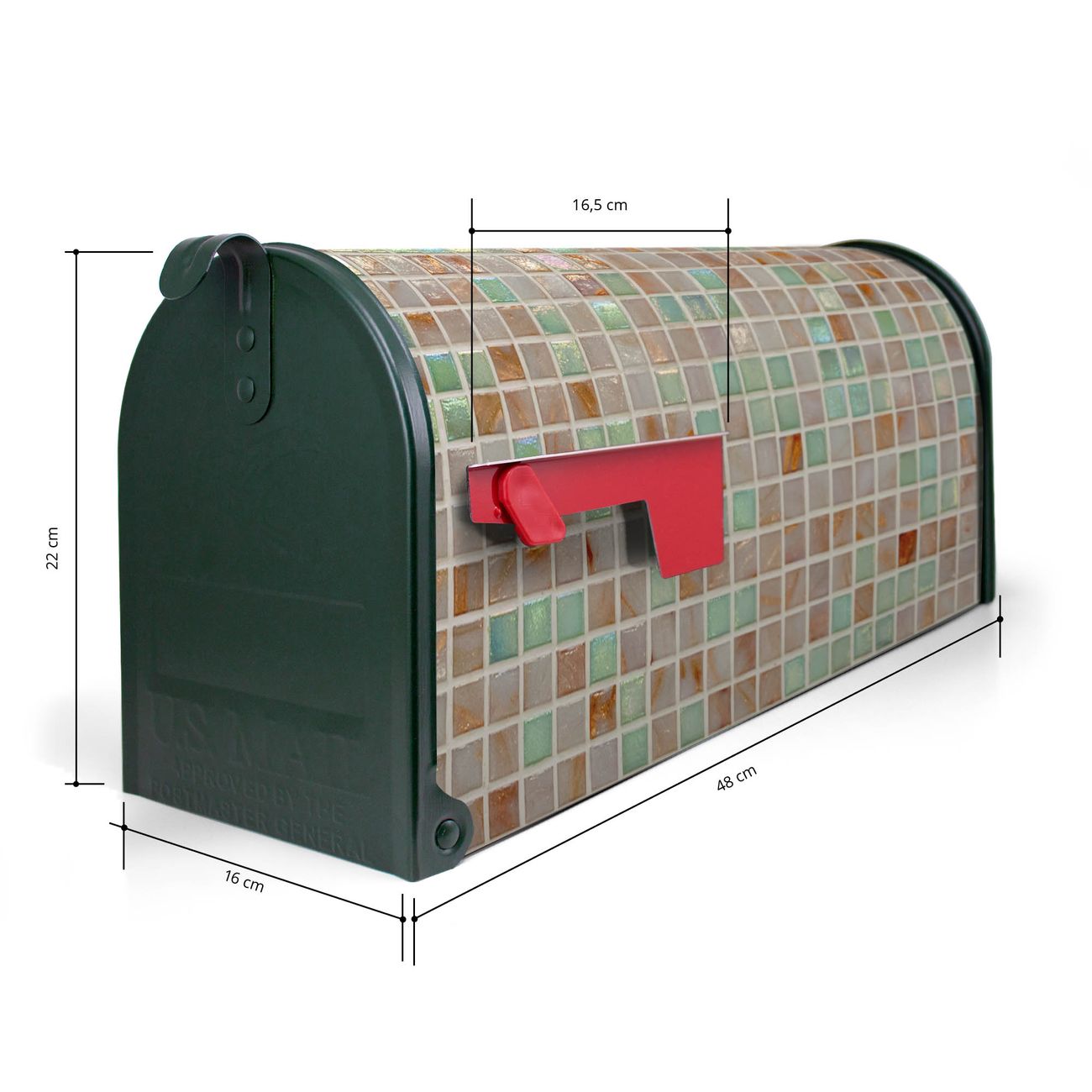 Der amerikanische Briefkasten von banjado mit Grüne Fliesen Motiv bietet Ihnen ausreichend Fassungsvermögen, um große A4 Sendungen und Zeitschriften zu empfangen. Die typisch amerikanische rote Fahne zeigt Ihnen an, wenn Sie Post erhalten haben. Die US-Mailbox besteht aus verzinktem Stahlblech welches lackiert wurde und ist 48 x 22 x 16 CM (BxHxT) groß. Die Folie mit Motiv Grüne Fliesen besteht aus einer wetter- und UV-resistenten Folie, die mit einem Schutzlaminat überzogen ist, sodass die US Mailbox zusätzlich vor Kratzern geschützt ist. An der Unterkante sind 4 Löcher je Seite um die Mailbox, typisch amerikanisch, an einem Holzpfahl oder einem Zaun zu befestigen. Auf Wunsch können Sie bei uns den passenden Standfuß oder die passende Wandhalterung kaufen um die US-Mailbox sicher zu befestigen. Wir bieten Ihnen ebenfalls Namensschilder, bereits beschriftet oder frei zu beschriften, und verschiedene selbst gestaltete Bitte-Keine-Werbung-Aufkleber.