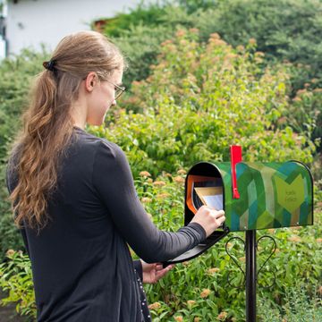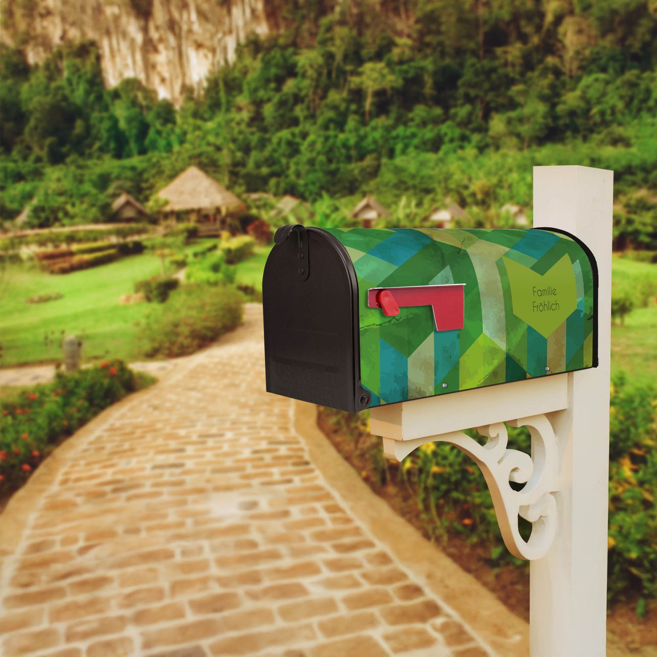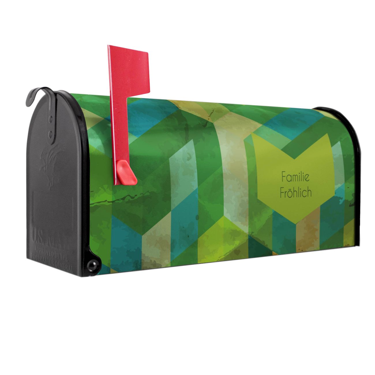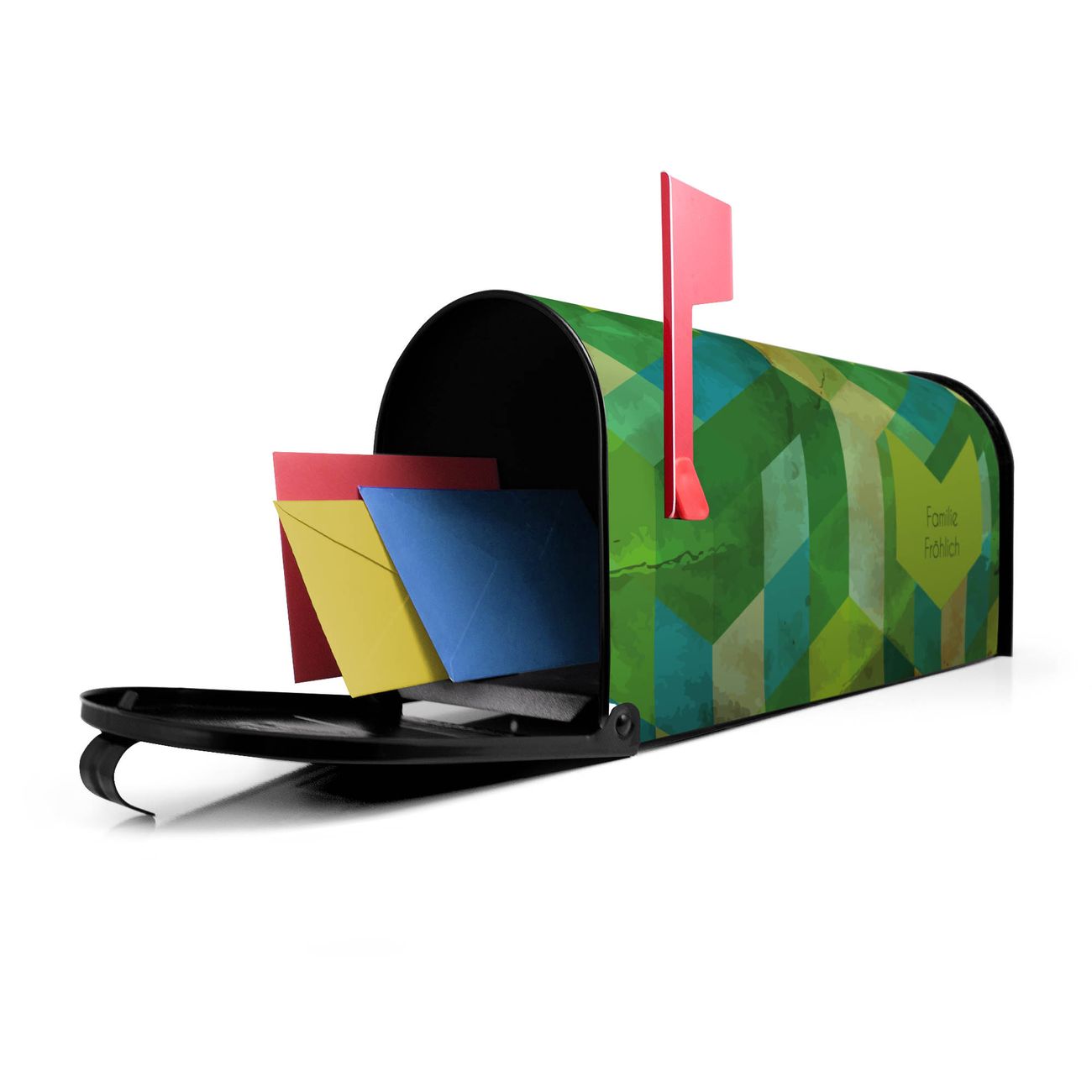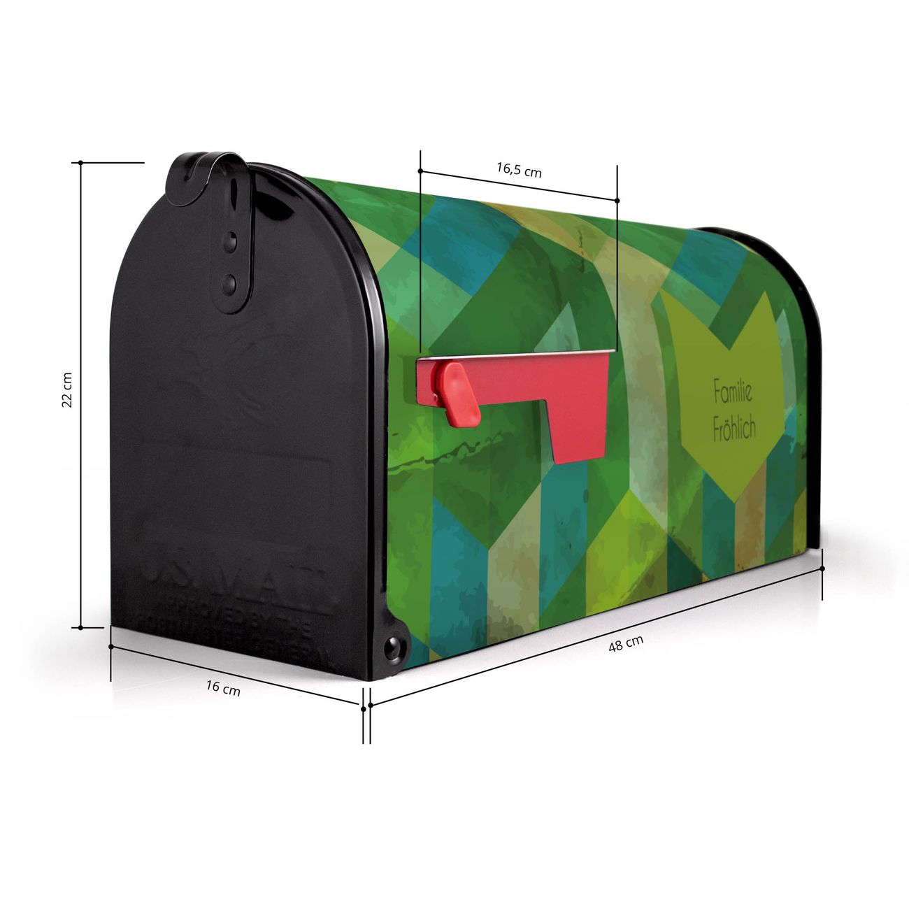 Der amerikanische Briefkasten von banjado mit Grüne Würfel Motiv bietet Ihnen ausreichend Fassungsvermögen, um große A4 Sendungen und Zeitschriften zu empfangen. Die typisch amerikanische rote Fahne zeigt Ihnen an, wenn Sie Post erhalten haben. Die US-Mailbox besteht aus verzinktem Stahlblech welches lackiert wurde und ist 48 x 22 x 16 CM (BxHxT) groß. Die Folie mit Motiv Grüne Würfel besteht aus einer wetter- und UV-resistenten Folie, die mit einem Schutzlaminat überzogen ist, sodass die US Mailbox zusätzlich vor Kratzern geschützt ist. An der Unterkante sind 4 Löcher je Seite um die Mailbox, typisch amerikanisch, an einem Holzpfahl oder einem Zaun zu befestigen. Auf Wunsch können Sie bei uns den passenden Standfuß oder die passende Wandhalterung kaufen um die US-Mailbox sicher zu befestigen. Wir bieten Ihnen ebenfalls Namensschilder, bereits beschriftet oder frei zu beschriften, und verschiedene selbst gestaltete Bitte-Keine-Werbung-Aufkleber.