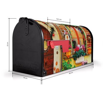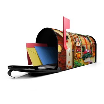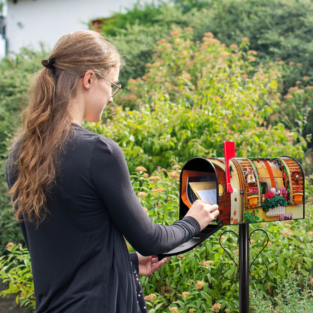 Der amerikanische Briefkasten von banjado mit Grünes Fahrrad Motiv bietet Ihnen ausreichend Fassungsvermögen, um große A4 Sendungen und Zeitschriften zu empfangen. Die typisch amerikanische rote Fahne zeigt Ihnen an, wenn Sie Post erhalten haben. Die US-Mailbox besteht aus verzinktem Stahlblech welches lackiert wurde und ist 48 x 22 x 16 CM (BxHxT) groß. Die Folie mit Motiv Grünes Fahrrad besteht aus einer wetter- und UV-resistenten Folie, die mit einem Schutzlaminat überzogen ist, sodass die US Mailbox zusätzlich vor Kratzern geschützt ist. An der Unterkante sind 4 Löcher je Seite um die Mailbox, typisch amerikanisch, an einem Holzpfahl oder einem Zaun zu befestigen. Auf Wunsch können Sie bei uns den passenden Standfuß oder die passende Wandhalterung kaufen um die US-Mailbox sicher zu befestigen. Wir bieten Ihnen ebenfalls Namensschilder, bereits beschriftet oder frei zu beschriften, und verschiedene selbst gestaltete Bitte-Keine-Werbung-Aufkleber.